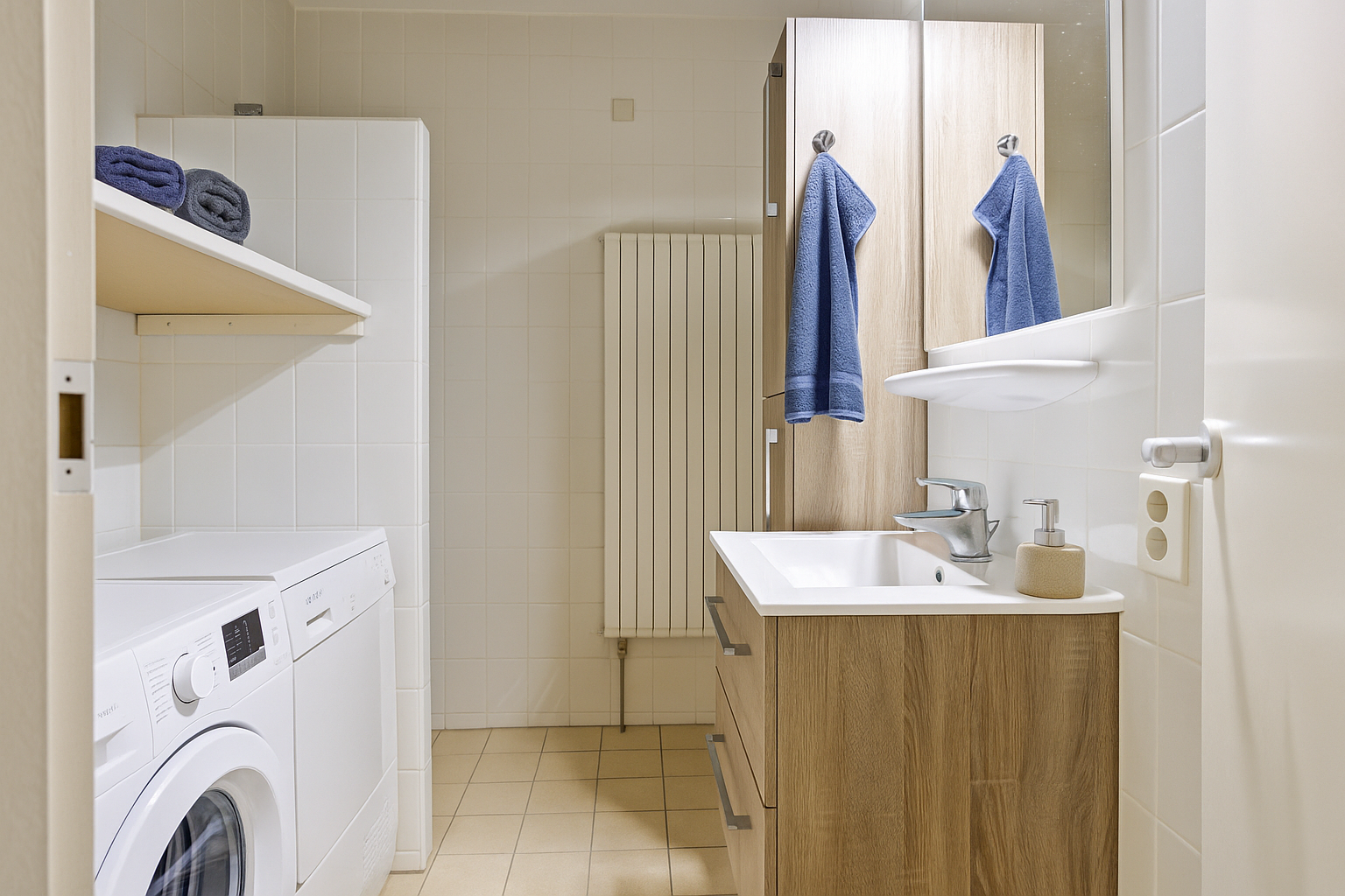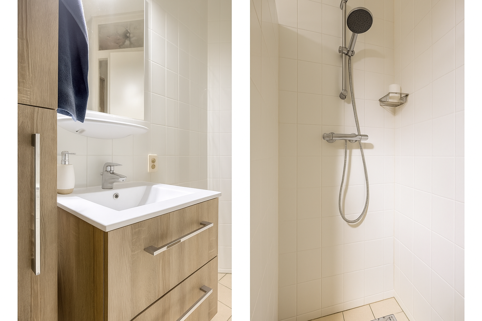 - Wastafel, wastafelmeubel, inloopdouche, vloerverwarming en wasmachineaansluiting