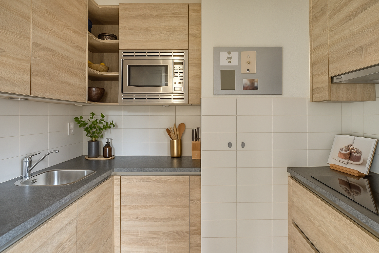 Ruime, speels ingedeelde hal met garderobe, meterkast en praktische bergkast. De lichte woonkamer met eethoek heeft dankzij de grote raampartijen en de ligging op het zuidwesten de gehele dag een prettige lichtinval. Er is ruimte voor een zithoek en een eettafel. De halfopen keuken is met schuifdeuren af te sluiten. De keuken heeft een houtlook keukenmeubel en is uitgerust met inbouwapparatuur, waaronder een inductiekookplaat, combi-oven, vaatwasser en koelkast met vriesgedeelte.