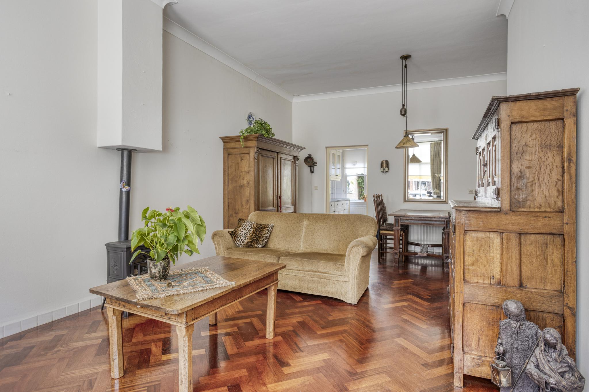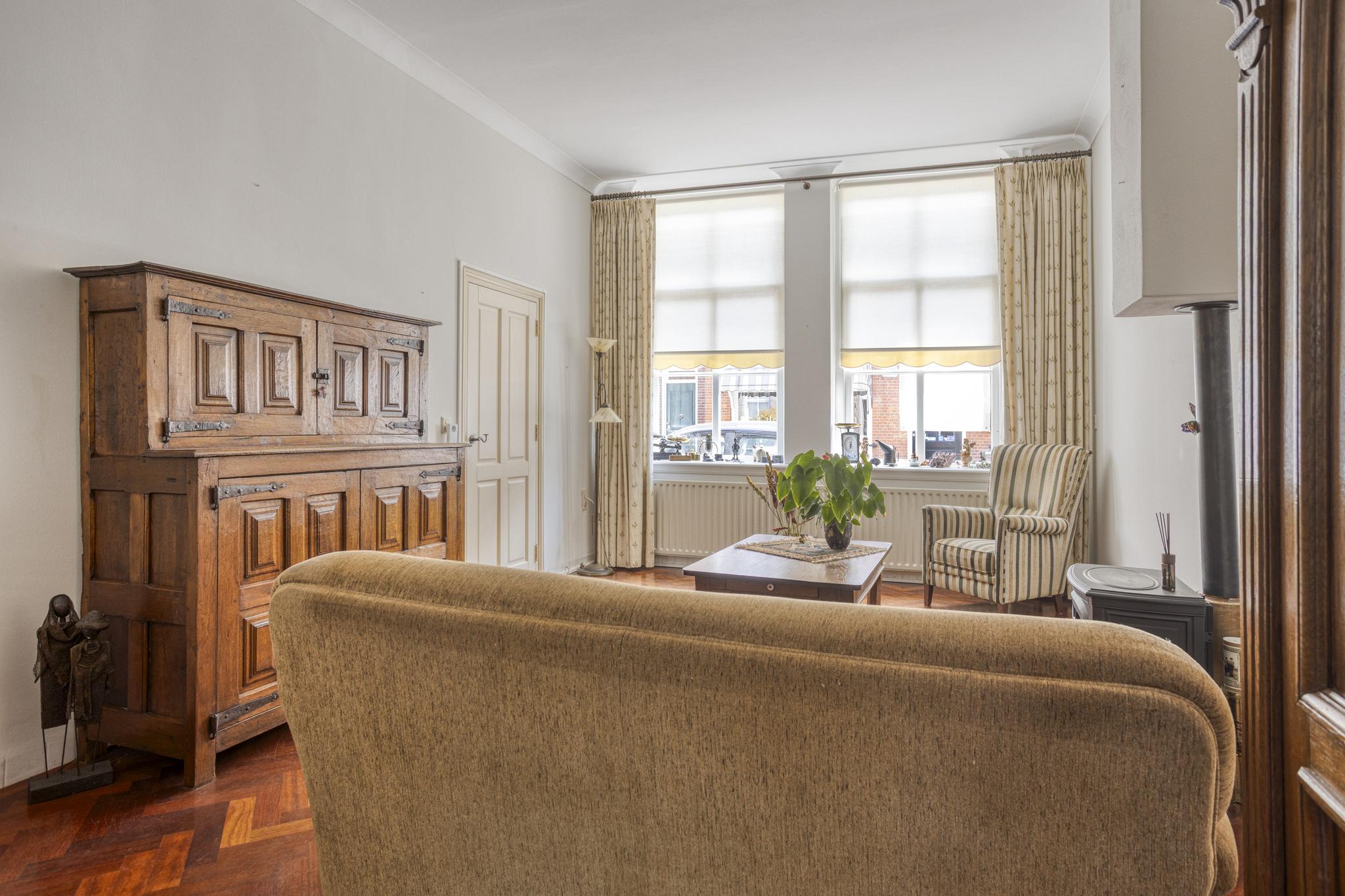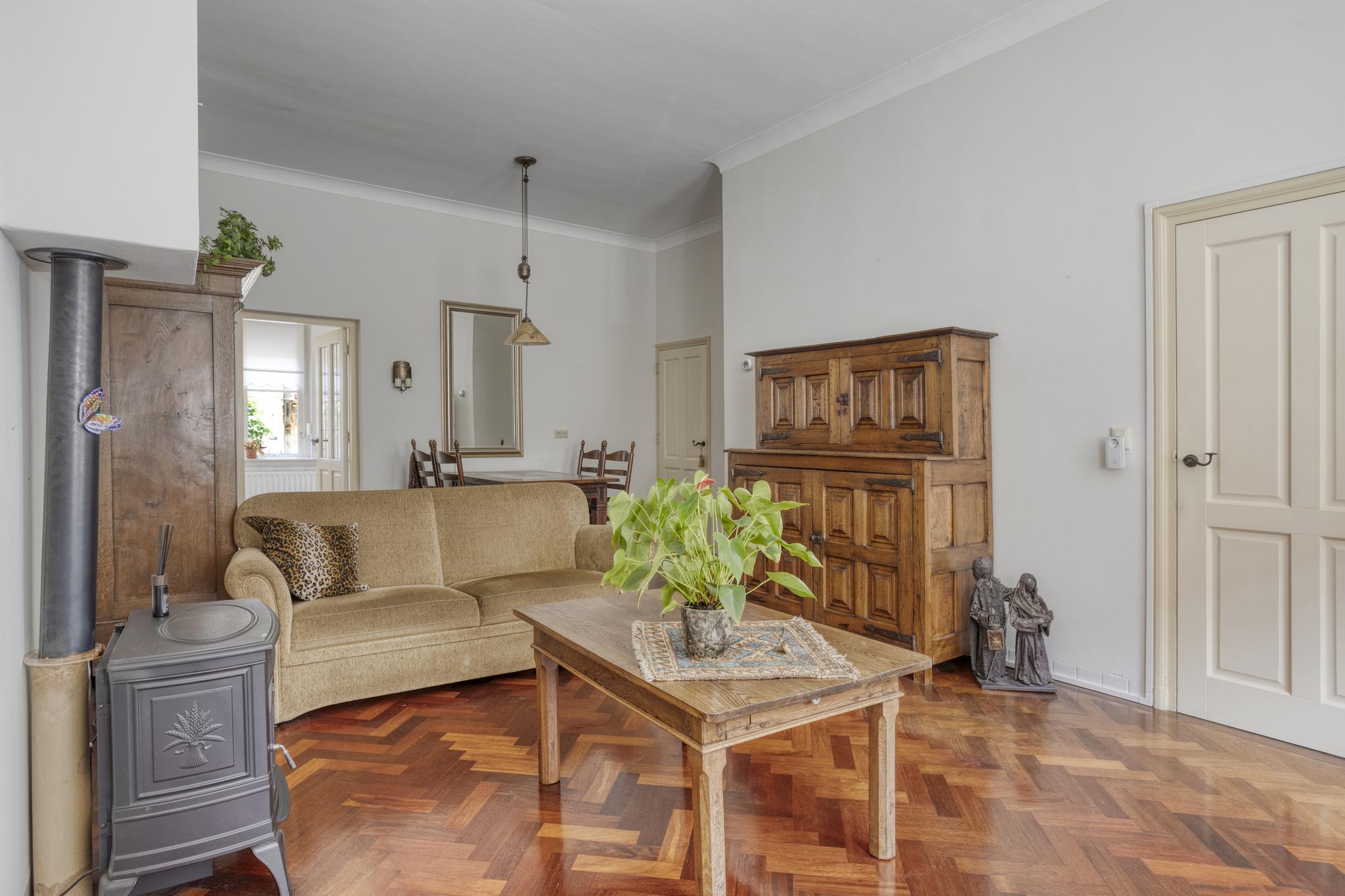 Als je binnenkomt in de hal vallen meteen de hoge plafonds op, dit weerspiegeld direct de charme van deze woning. Bij binnenkomst in de woonkamer vallen de grote raampartijen en de sfeervolle houten parketvloer direct op. De woonkamer biedt veel ruimte en kan hierdoor geheel naar eigen wens worden ingedeeld. Er is namelijk voldoende plek voor zowel een comfortabele zithoek als een eettafel, ideaal om familie en vrienden te ontvangen. Praktisch te noemen, is de berging die vanuit de woonkamer toegankelijk is. Ideaal voor het opbergen van allerlei spullen die buiten het zicht mogen blijven. De keuken is aan de achterzijde gesitueerd en heeft een prachtig uitzicht op de diep bemeten achtertuin. De keuken is voorzien van een vernieuwde combioven, vaatwasser (2024), 4-pits gasfornuis en een spoelbak. Verder biedt de keuken voldoende kastruimte om al het kookgerei in kwijt te kunnen. Aangrenzend vind u de bijkeuken, compleet met wasbak en genoeg ruimte voor een wasmachine en droger. Vanuit de bijkeuken heeft u direct toegang tot de buitenruimte, waarbij u de verrassend grote tuin betreed.