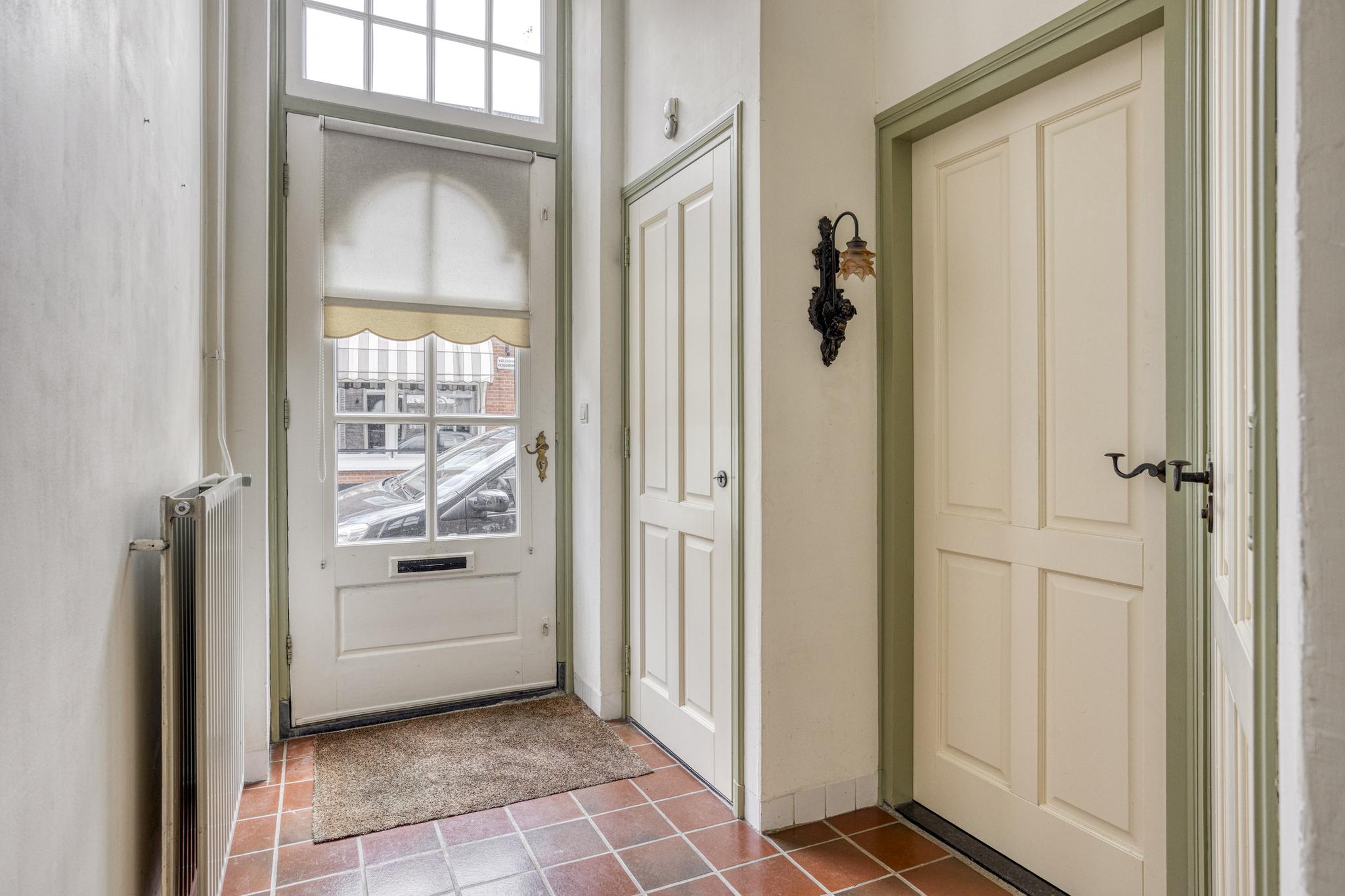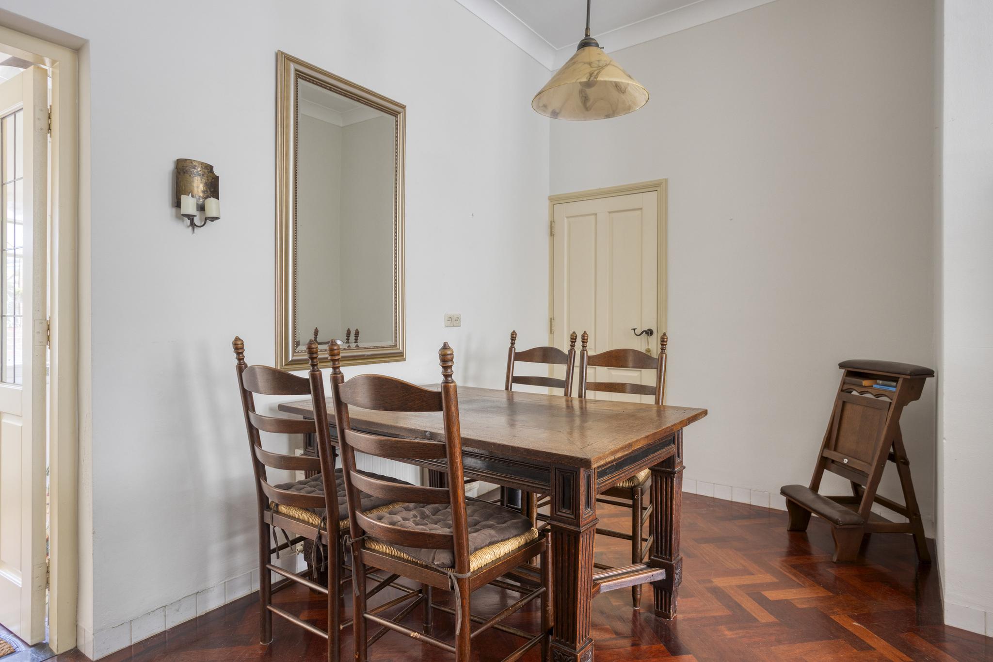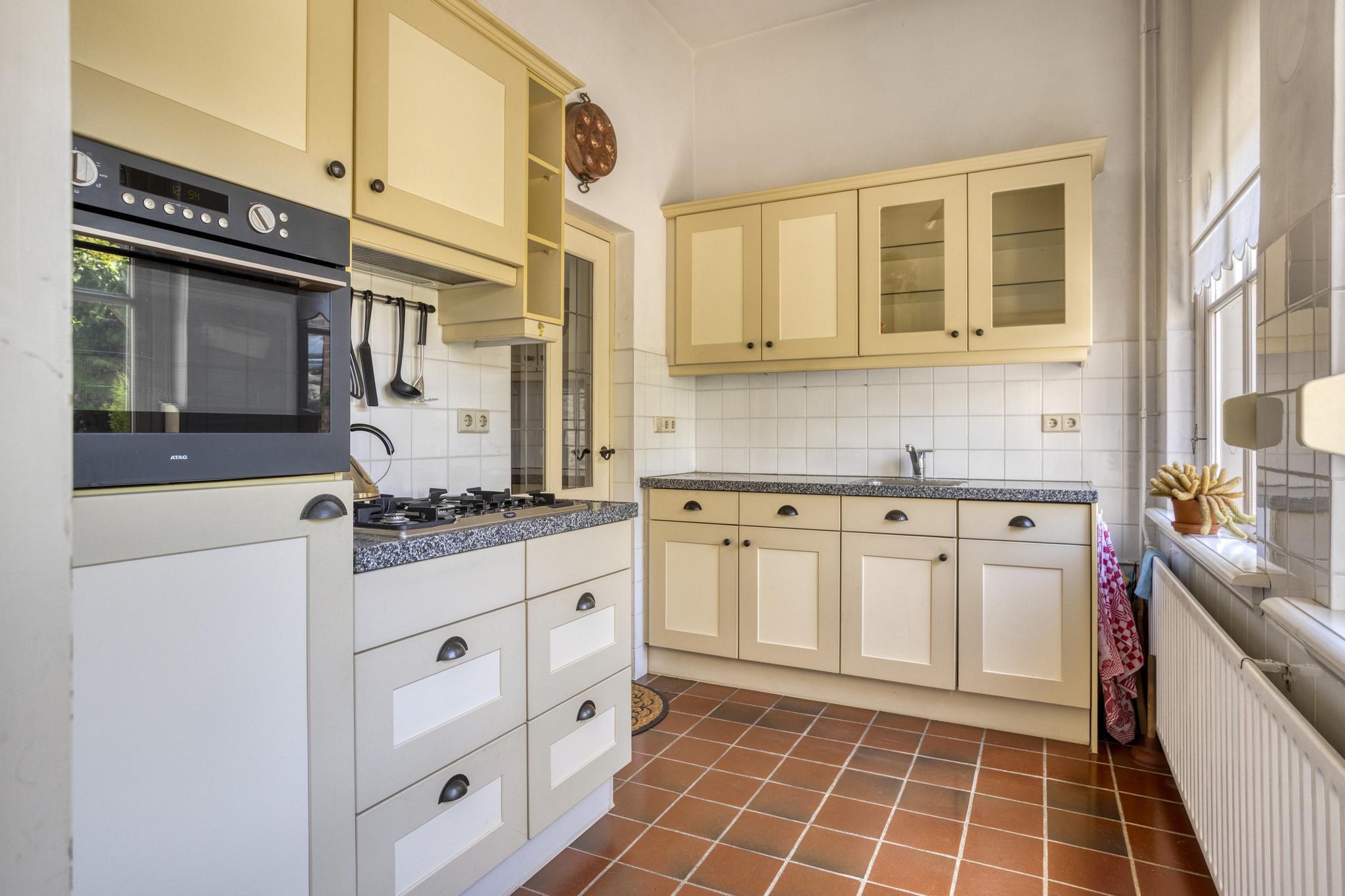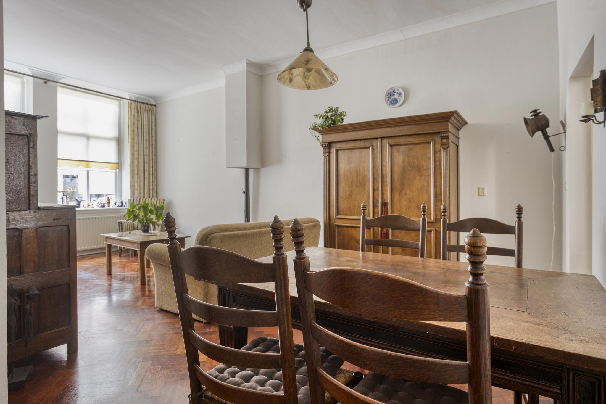 Als je binnenkomt in de hal vallen meteen de hoge plafonds op, dit weerspiegeld direct de charme van deze woning. Bij binnenkomst in de woonkamer vallen de grote raampartijen en de sfeervolle houten parketvloer direct op. De woonkamer biedt veel ruimte en kan hierdoor geheel naar eigen wens worden ingedeeld. Er is namelijk voldoende plek voor zowel een comfortabele zithoek als een eettafel, ideaal om familie en vrienden te ontvangen. Praktisch te noemen, is de berging die vanuit de woonkamer toegankelijk is. Ideaal voor het opbergen van allerlei spullen die buiten het zicht mogen blijven. De keuken is aan de achterzijde gesitueerd en heeft een prachtig uitzicht op de diep bemeten achtertuin. De keuken is voorzien van een vernieuwde combioven, vaatwasser (2024), 4-pits gasfornuis en een spoelbak. Verder biedt de keuken voldoende kastruimte om al het kookgerei in kwijt te kunnen. Aangrenzend vind u de bijkeuken, compleet met wasbak en genoeg ruimte voor een wasmachine en droger. Vanuit de bijkeuken heeft u direct toegang tot de buitenruimte, waarbij u de verrassend grote tuin betreed.