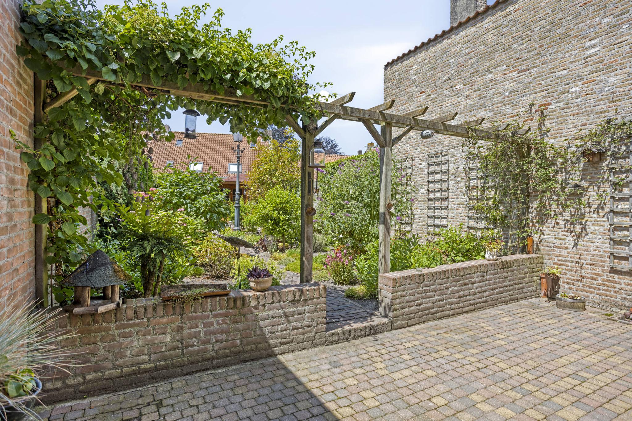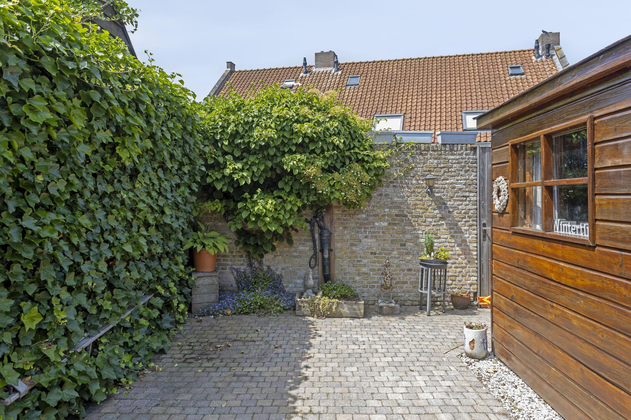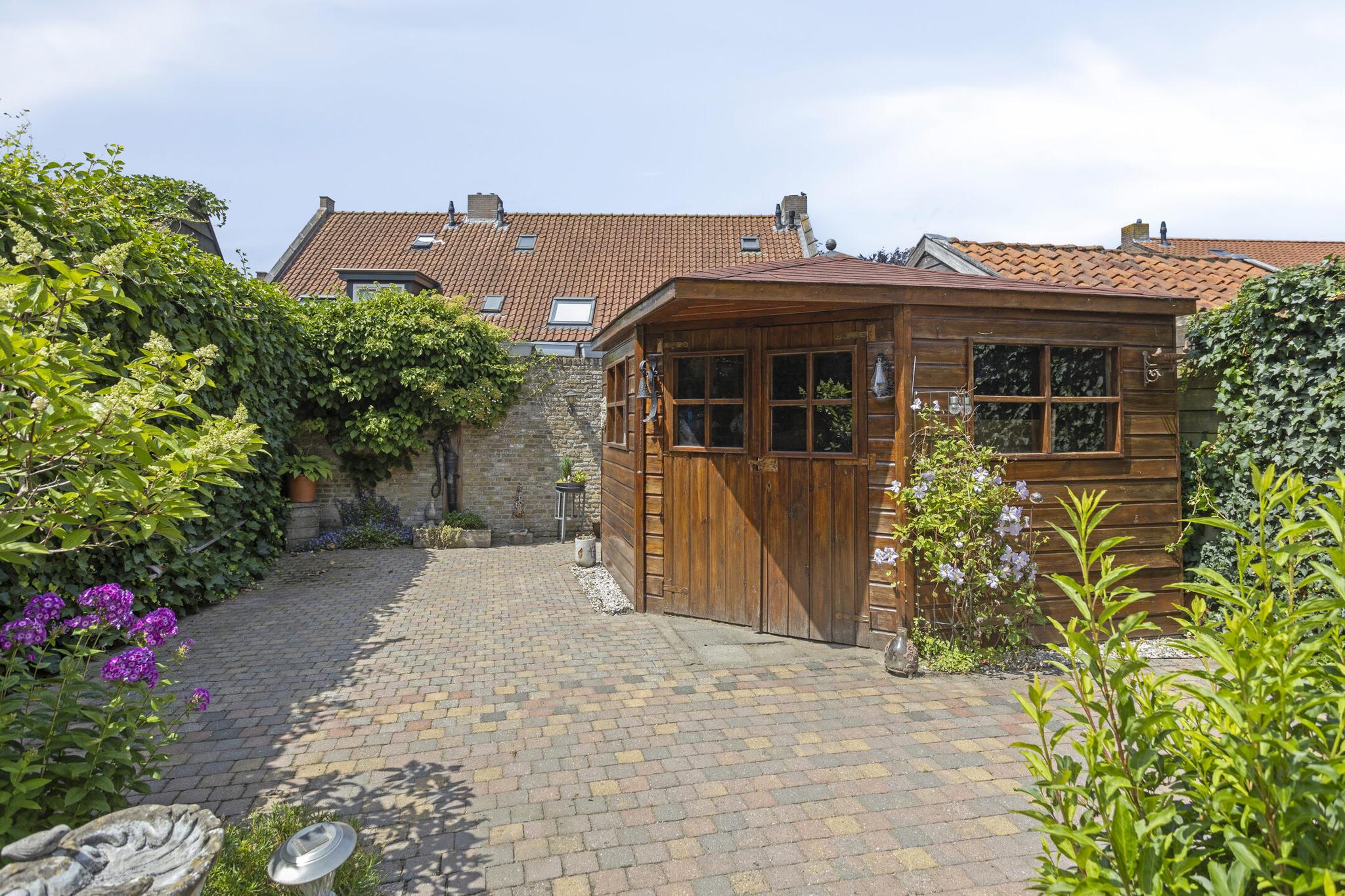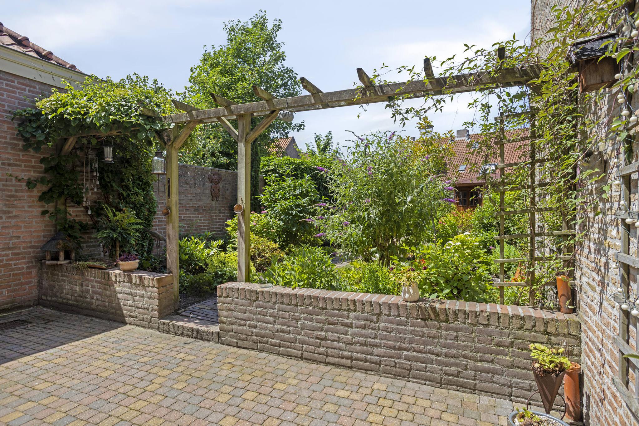 De ruime en diep bemeten achtertuin is een perfecte plek om te ontspannen en te genieten van het buitenleven. De tuin biedt volop ruimte voor diverse buitenactiviteiten, of je nu graag een gezellige zithoek wilt of gewoon even lekker wilt ontspannen. De vrijstaande houten schuur aan de achterzijde van het perceel is ideaal voor het opslaan van tuinapparatuur, fietsen of andere spullen. Deze schuur is voorzien van elektra, waardoor het ideaal is voor het opladen van eventuele elektrische fietsen of andere elektronische apparaten. Via de diepe achtertuin is er eveneens een achterom aanwezig, welke via een houten poort toegankelijk is. De vele borders in combinatie met de karakteristieke bestrating, maakt deze tuin een prachtige plek om te vertoeven en een lust voor het oog.
