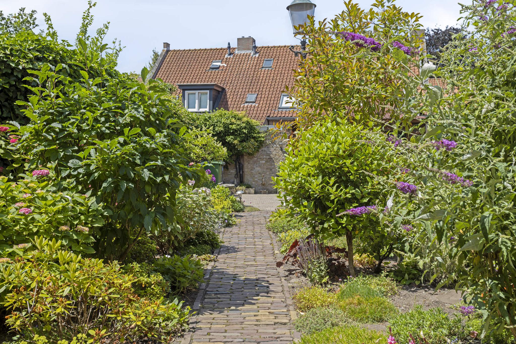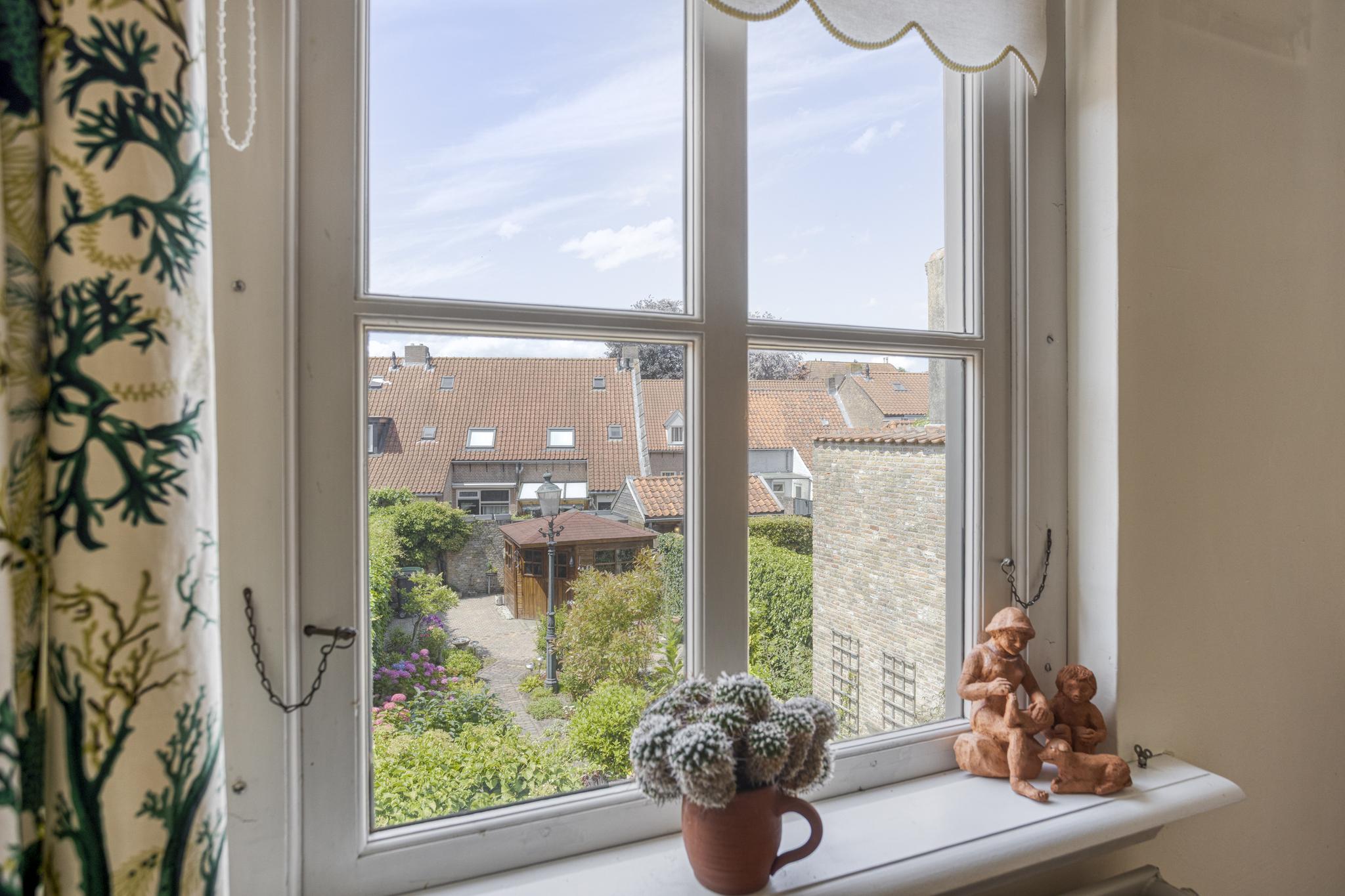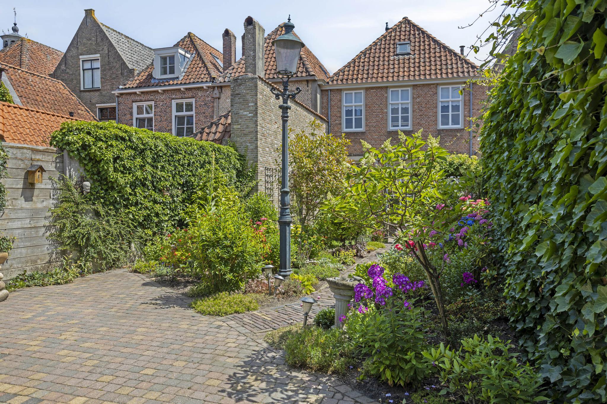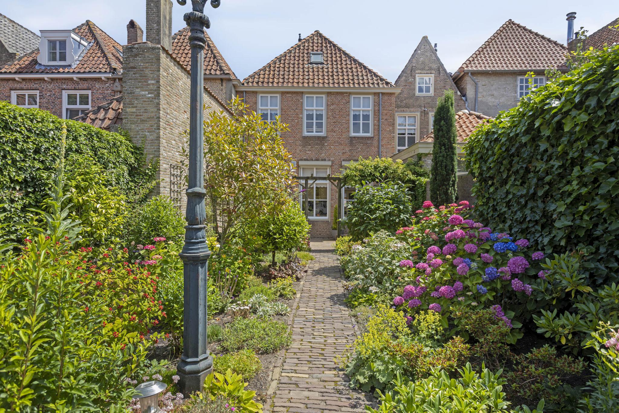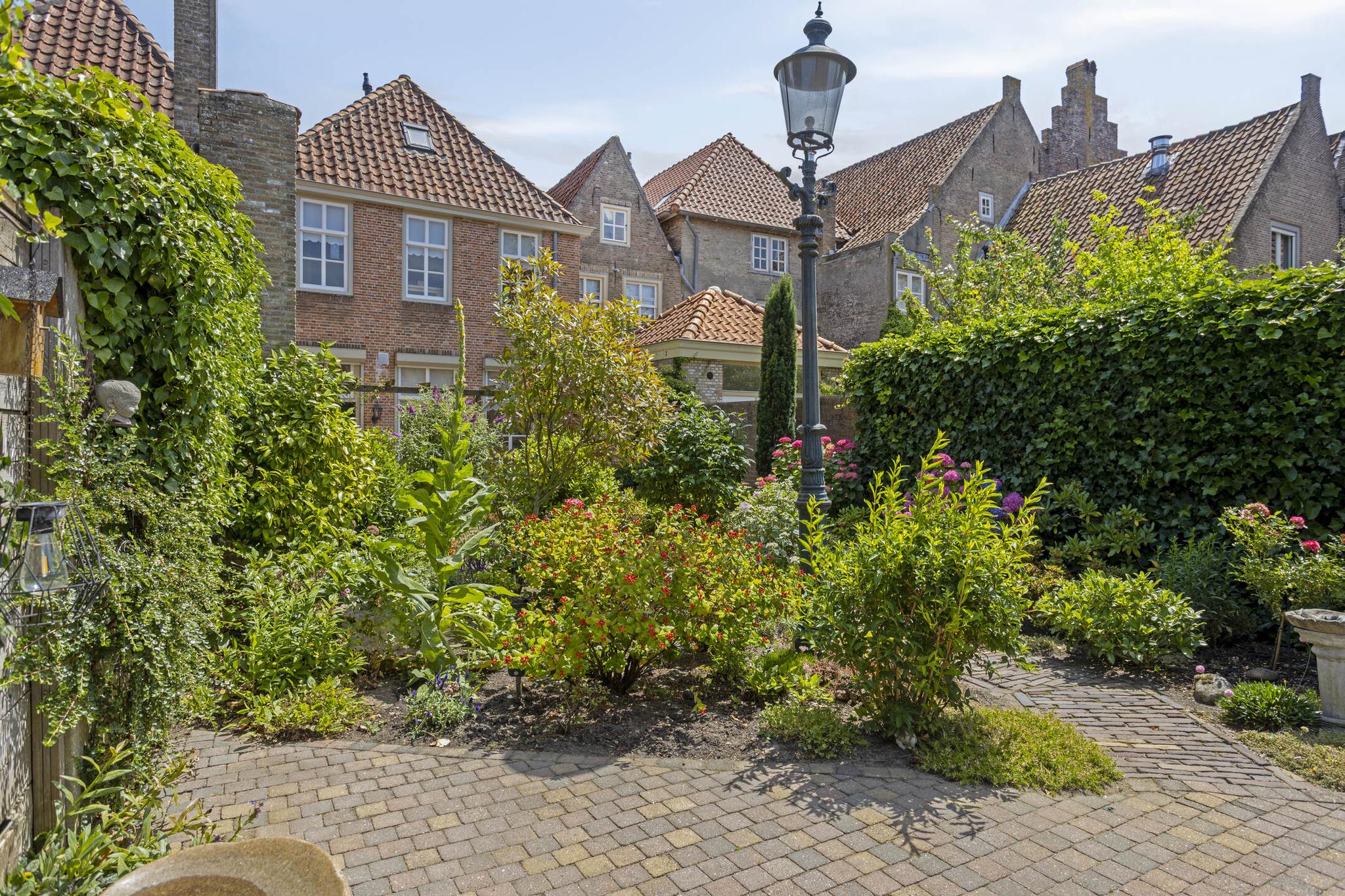 De ruime en diep bemeten achtertuin is een perfecte plek om te ontspannen en te genieten van het buitenleven. De tuin biedt volop ruimte voor diverse buitenactiviteiten, of je nu graag een gezellige zithoek wilt of gewoon even lekker wilt ontspannen. De vrijstaande houten schuur aan de achterzijde van het perceel is ideaal voor het opslaan van tuinapparatuur, fietsen of andere spullen. Deze schuur is voorzien van elektra, waardoor het ideaal is voor het opladen van eventuele elektrische fietsen of andere elektronische apparaten. Via de diepe achtertuin is er eveneens een achterom aanwezig, welke via een houten poort toegankelijk is. De vele borders in combinatie met de karakteristieke bestrating, maakt deze tuin een prachtige plek om te vertoeven en een lust voor het oog.