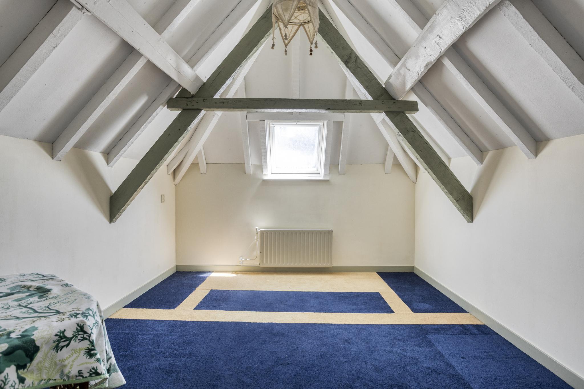 Via de vaste trapopgang bereikt u de volwaardige tweede verdieping, waar het natuurlijke licht via het dakraam direct opvalt. Deze verdieping biedt een veelzijdige indeling met een grote slaapkamer die ideaal is voor verschillende doeleinden, zoals een eventuele logeerkamer, hobbykamer of werkkamer. De andere kamer kan gebruikt worden als inloopkast met genoeg ruimte om alles op te bergen. Hier is eveneens de CV-ketel gesitueerd, dus dient mede als stookruimte.