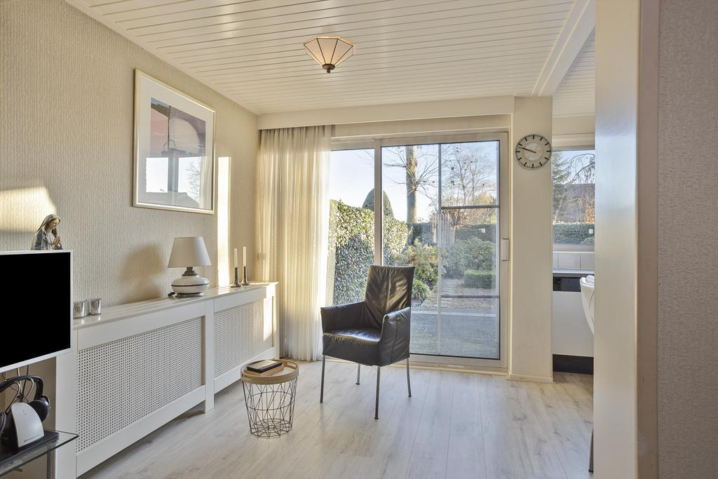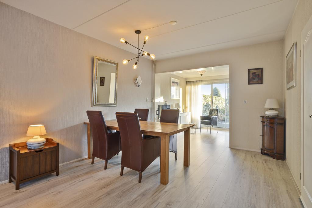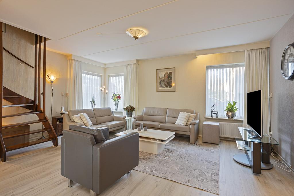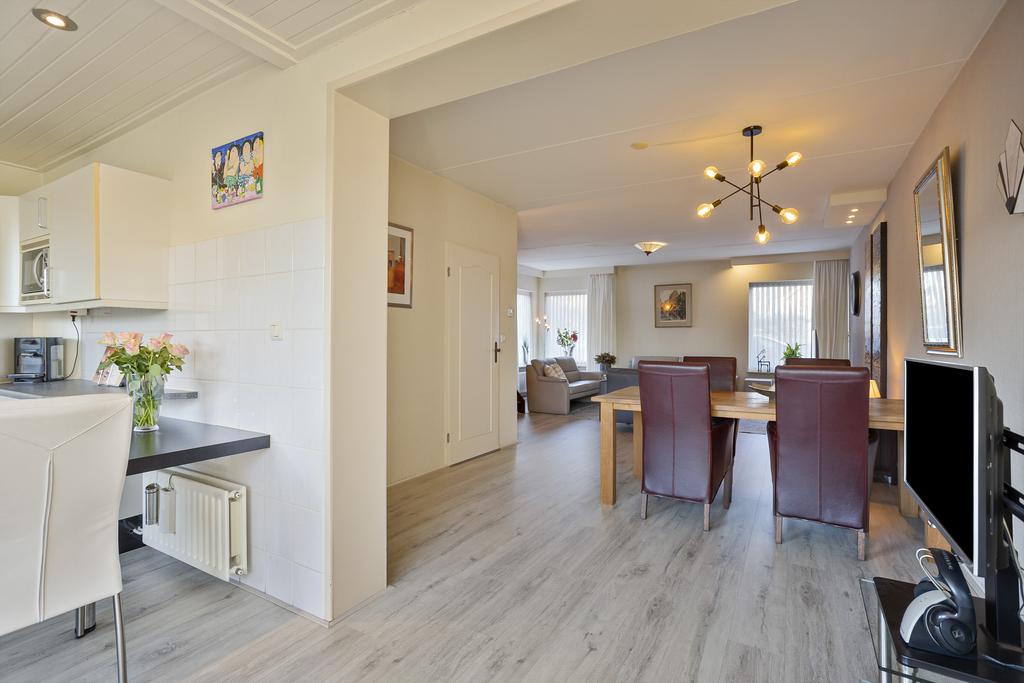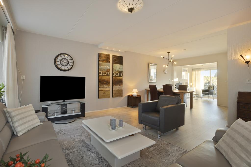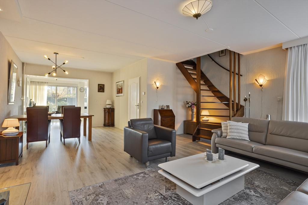 De woon-/eetkamer, met open trap naar de 1e verdieping, is erg ruim en licht. Er is een mogelijkheid tot het plaatsen van een gezellige open haard of kachel (rookkanaal aanwezig in plafond). De woonkamer loopt praktisch in een L-vorm waar om de hoek de uitgebouwde woonkeuken is gesitueerd.