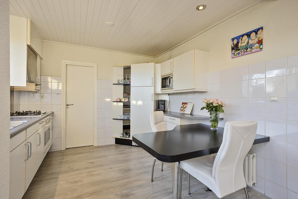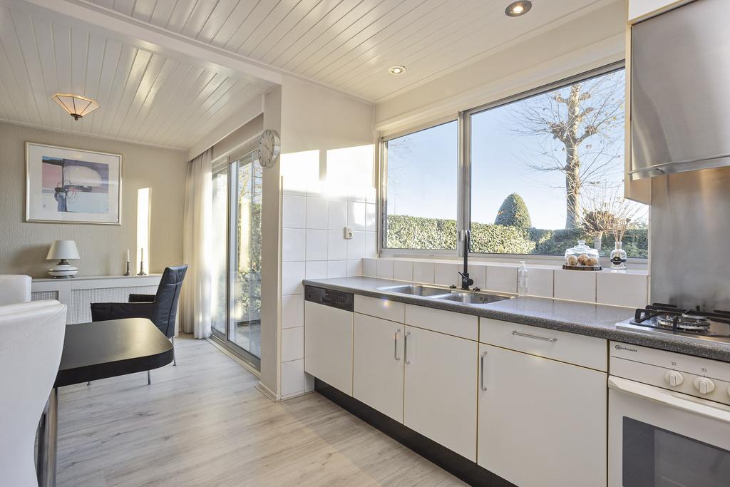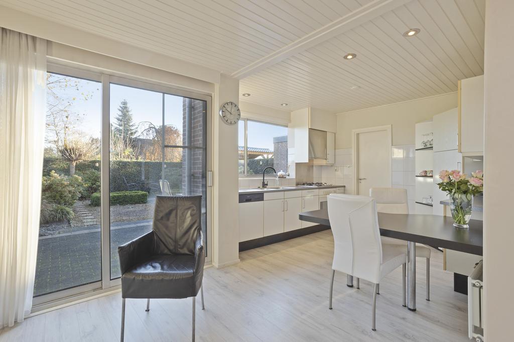 De woonkeuken geeft nu ruimte aan zowel een tv-/speelhoek als een grote keukenopstelling met een op maat gemaakte eettafel. De keuken is voorzien van inbouwapparatuur zoals een vaatwasser, gaskookplaat, afzuigkap, koelkast, oven en magnetron. Vanuit de keuken is er een schuifdeur naar het terras/achtertuin en een deur naar de bijkeuken/garage met de aansluitingen voor de wasapparatuur. Via de garage is er tevens toegang tot de achtertuin.