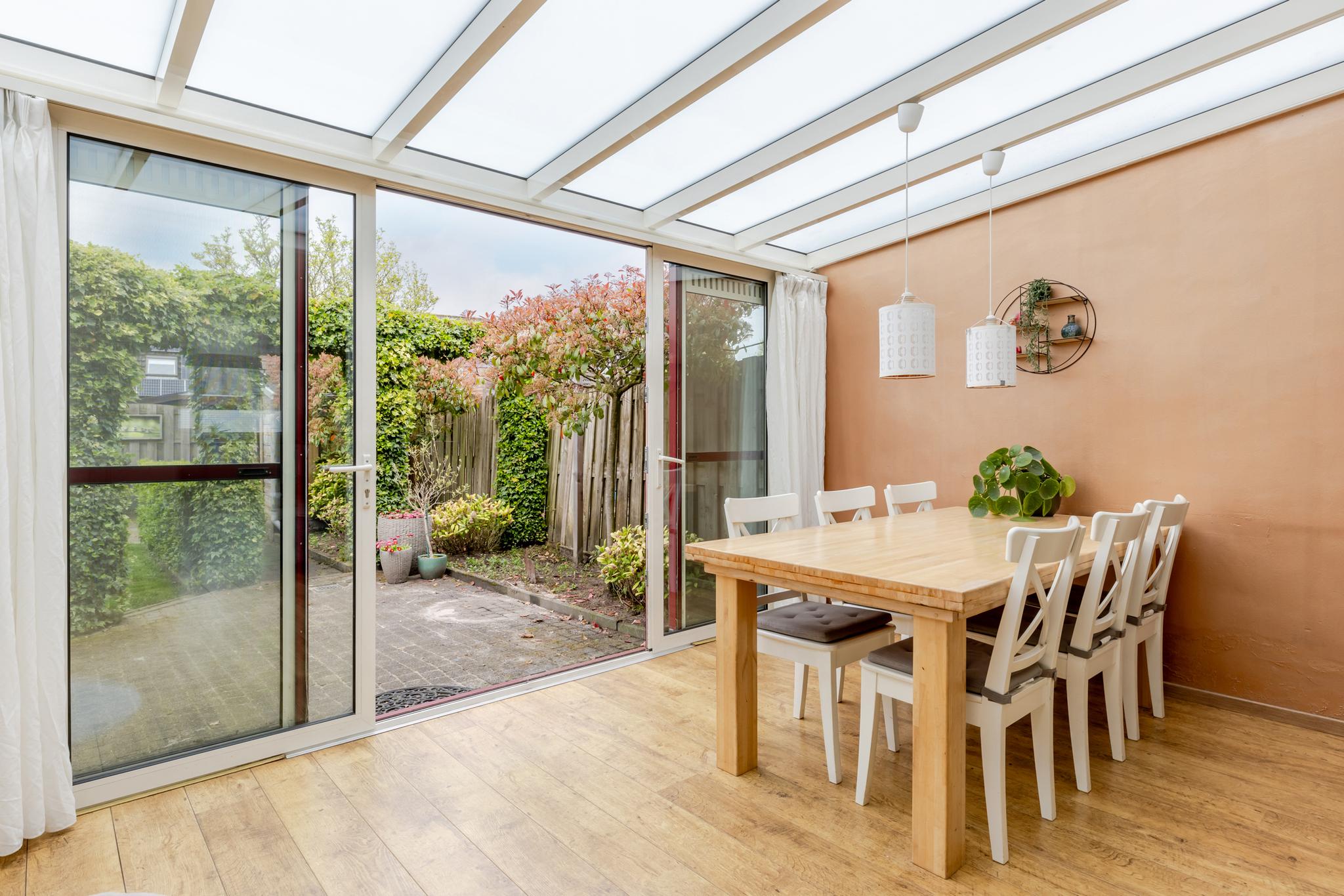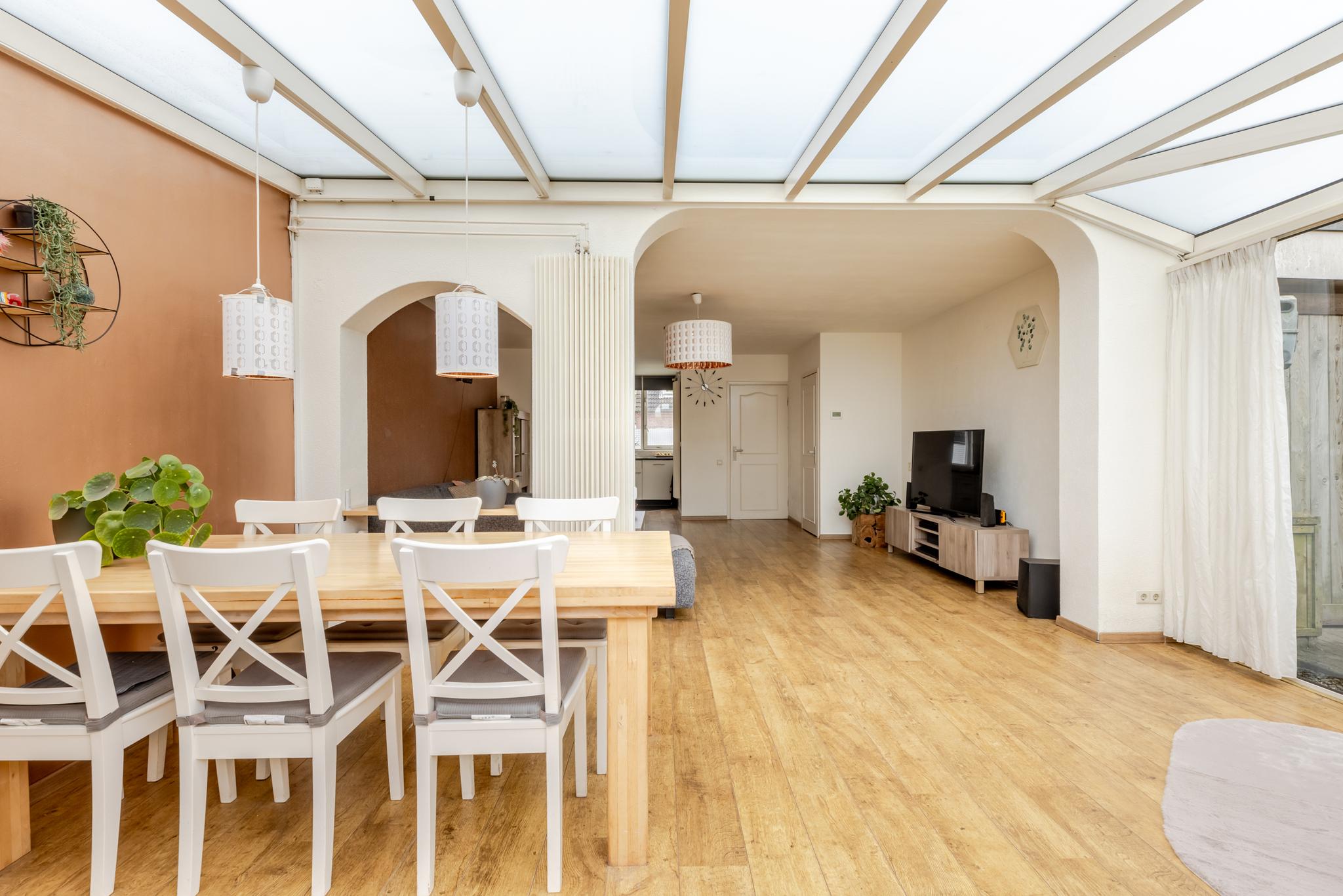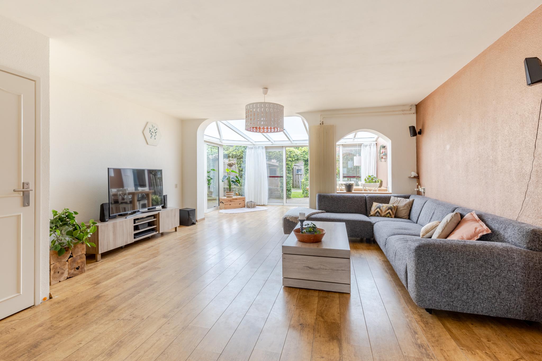 Aan de achterzijde is de woning uitgebouwd met een serre, wat niet alleen extra leefruimte oplevert, maar ook een prettig uitzicht biedt op de diepe achtertuin. De woonkamer is door de vele raampartijen heerlijk licht.