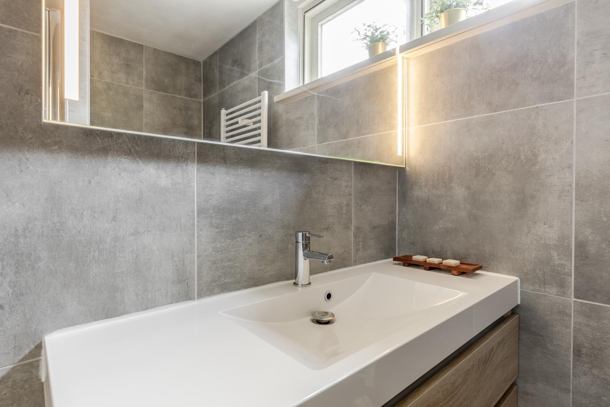 De badkamer is in 2021 gerenoveerd en heeft een moderne en frisse uitstraling. Deze is voorzien van een comfortabele inloopdouche met regendouchefunctie, een stijlvol wastafelmeubel en een toilet.