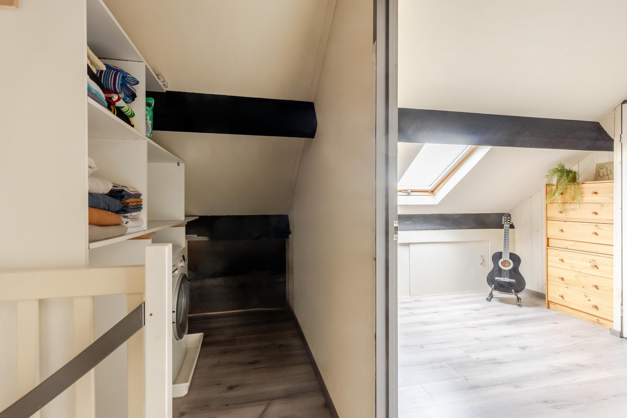 De tweede verdieping is bereikbaar via een vaste trap. Op de voorzolder bevinden zich de aansluitingen voor de wasmachine en droger en is er ruimte voor extra berging.