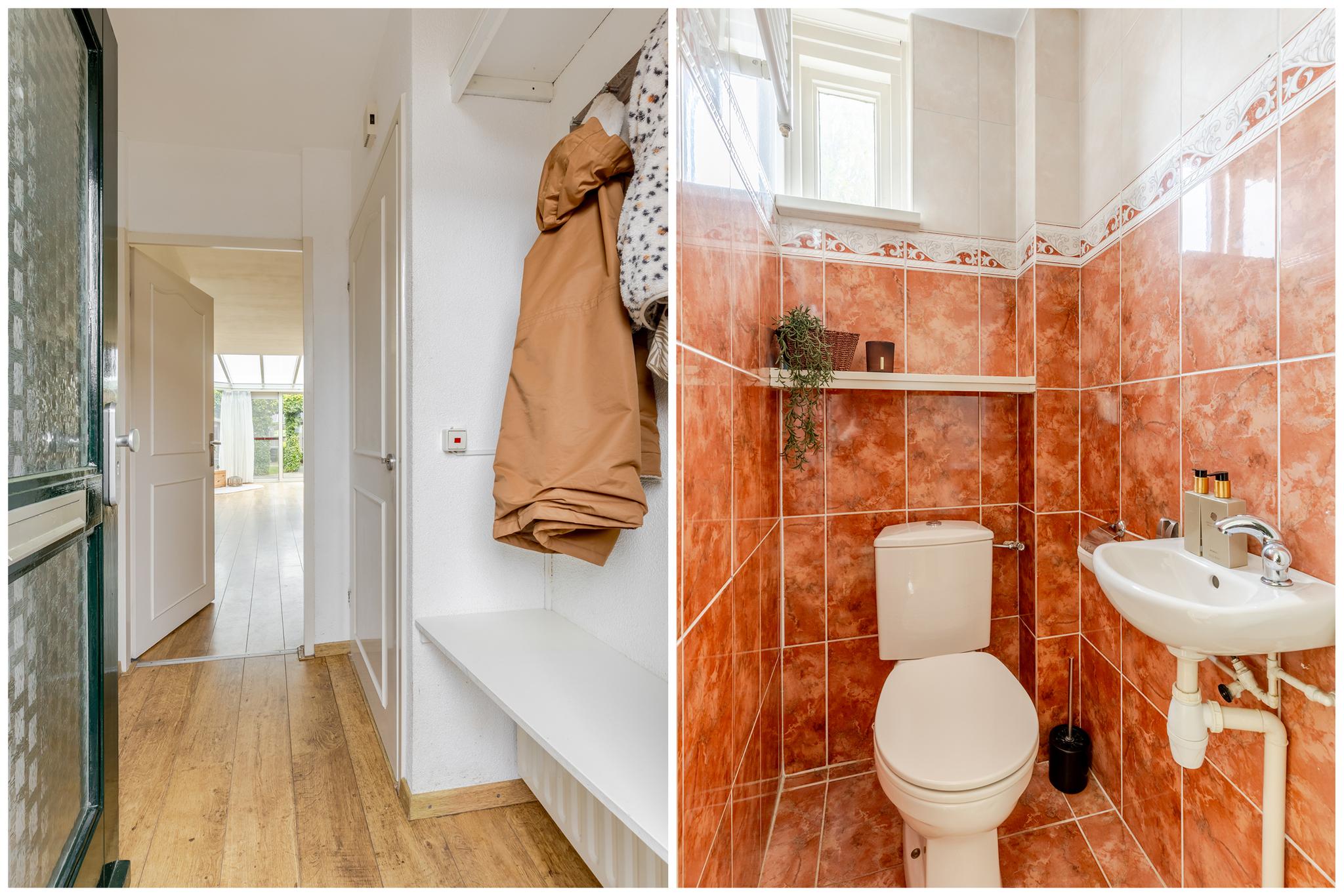 Bij binnenkomst in de hal tref je de meterkast, het toilet, de trapopgang naar de eerste verdieping en de toegang tot de woonkamer. De gehele begane grond is afgewerkt met een sfeervolle houten vloer, wat zorgt voor een warme uitstraling.