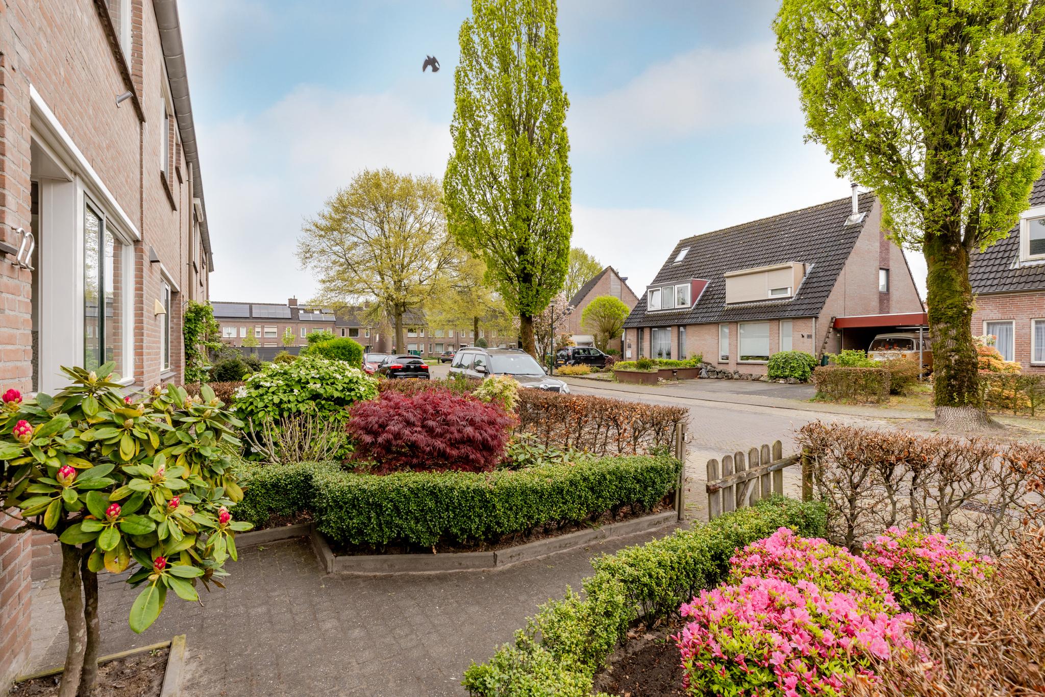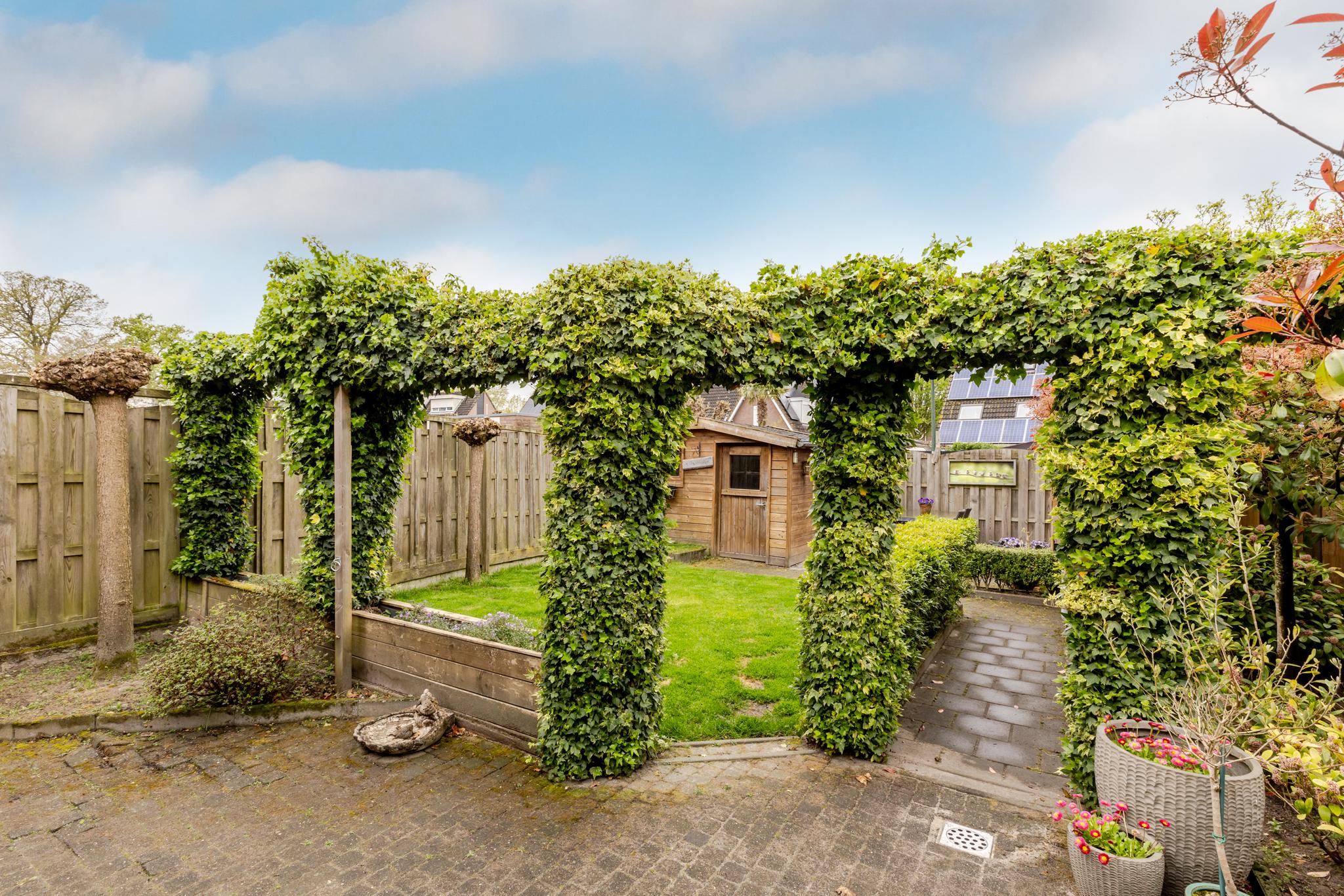 De woning beschikt over een verzorgde voor- en achtertuin. Aan de zijkant van de woning bevindt zich een aangebouwde houten berging. De achtertuin ligt op het noord/westen en is bereikbaar via zowel een schuifpui als een loopdeur vanuit de serre. De tuin is ingericht met gazon, borders, een terras en de drie houten bergingen.