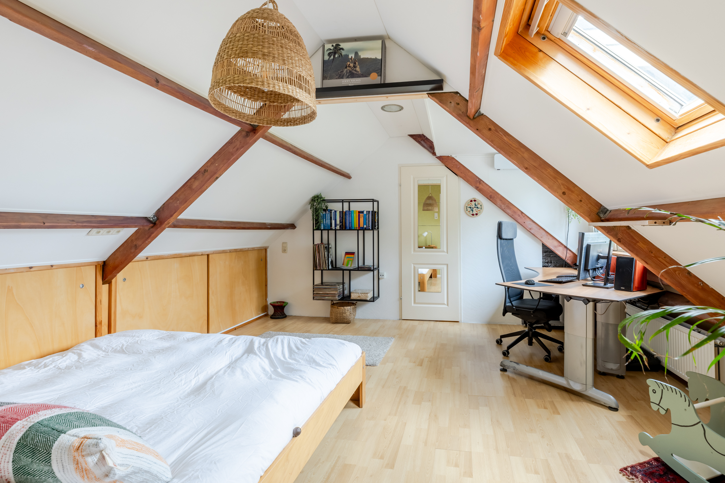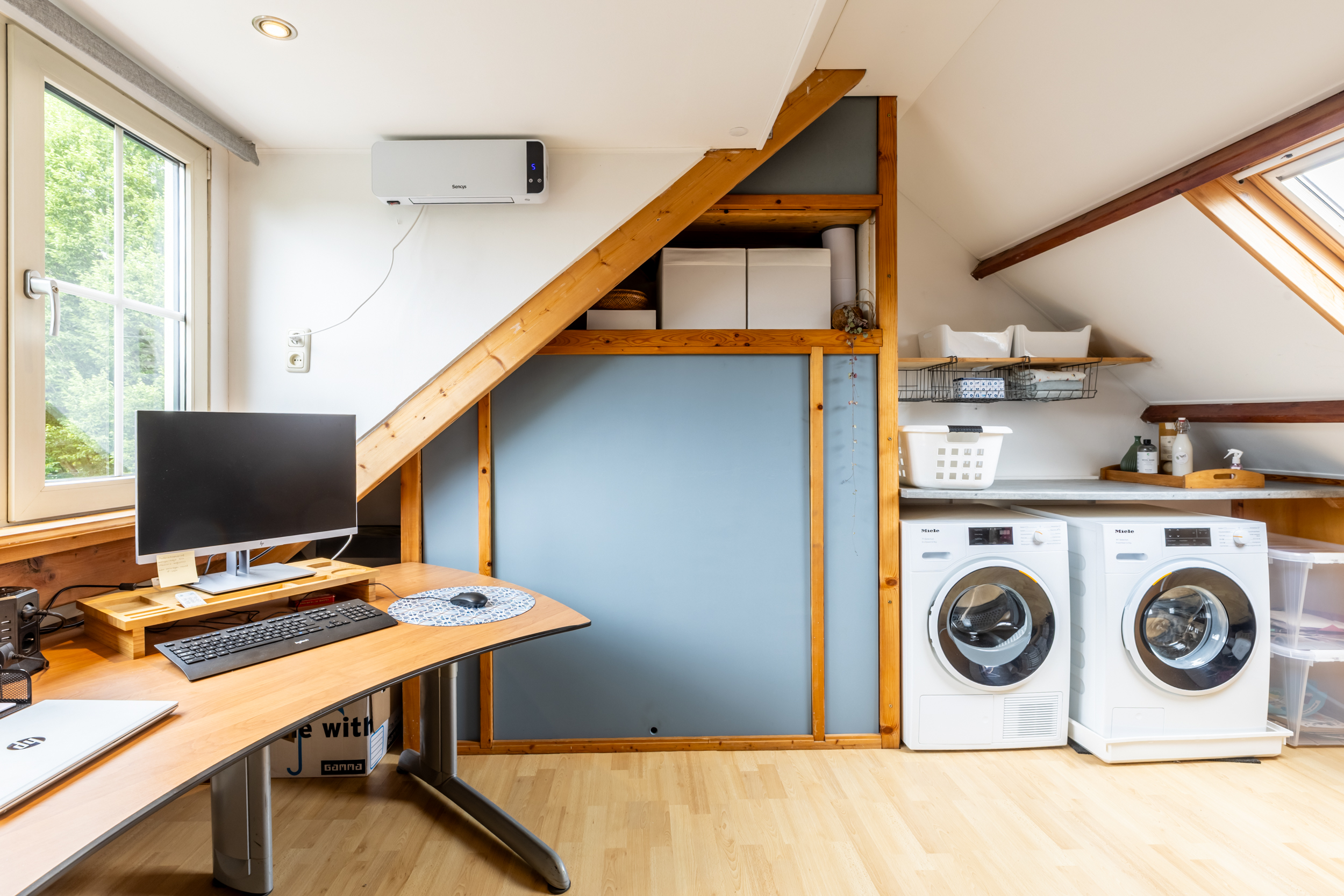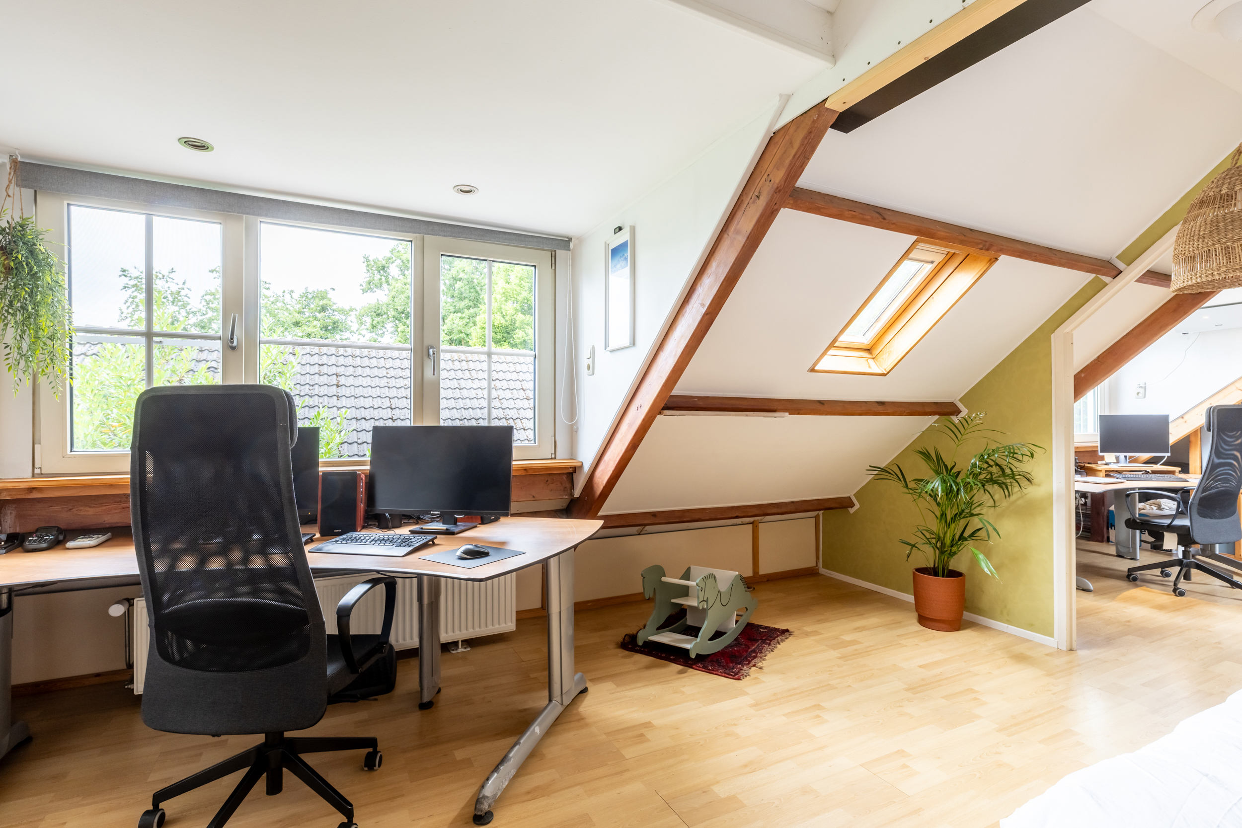 Op de tweede verdieping kom je op een ruime overloop met een praktische werkruimte met één werkplek. Hier vind je ook de aansluitingen voor de cv-ketel (2023), de wasmachine en de droger. Achter de deur bevindt zich een aparte vierde slaapkamer, eveneens voorzien van een dakkapel en veel bergruimte achter de knieschotten. In deze kamer is ook een tweede werkplek gecreëerd. Dankzij de dakramen is deze verdieping heerlijk licht en veelzijdig te gebruiken – als slaapkamer, logeerkamer of hobbyruimte.