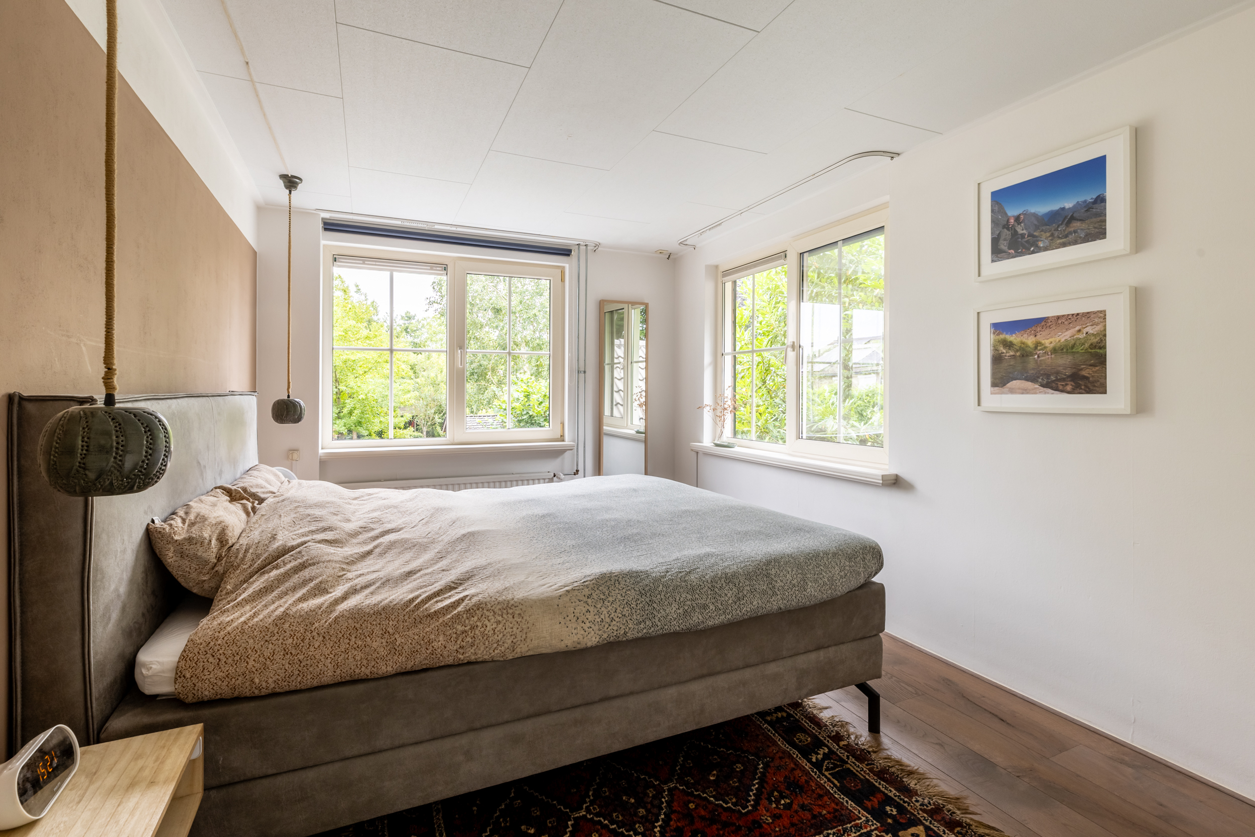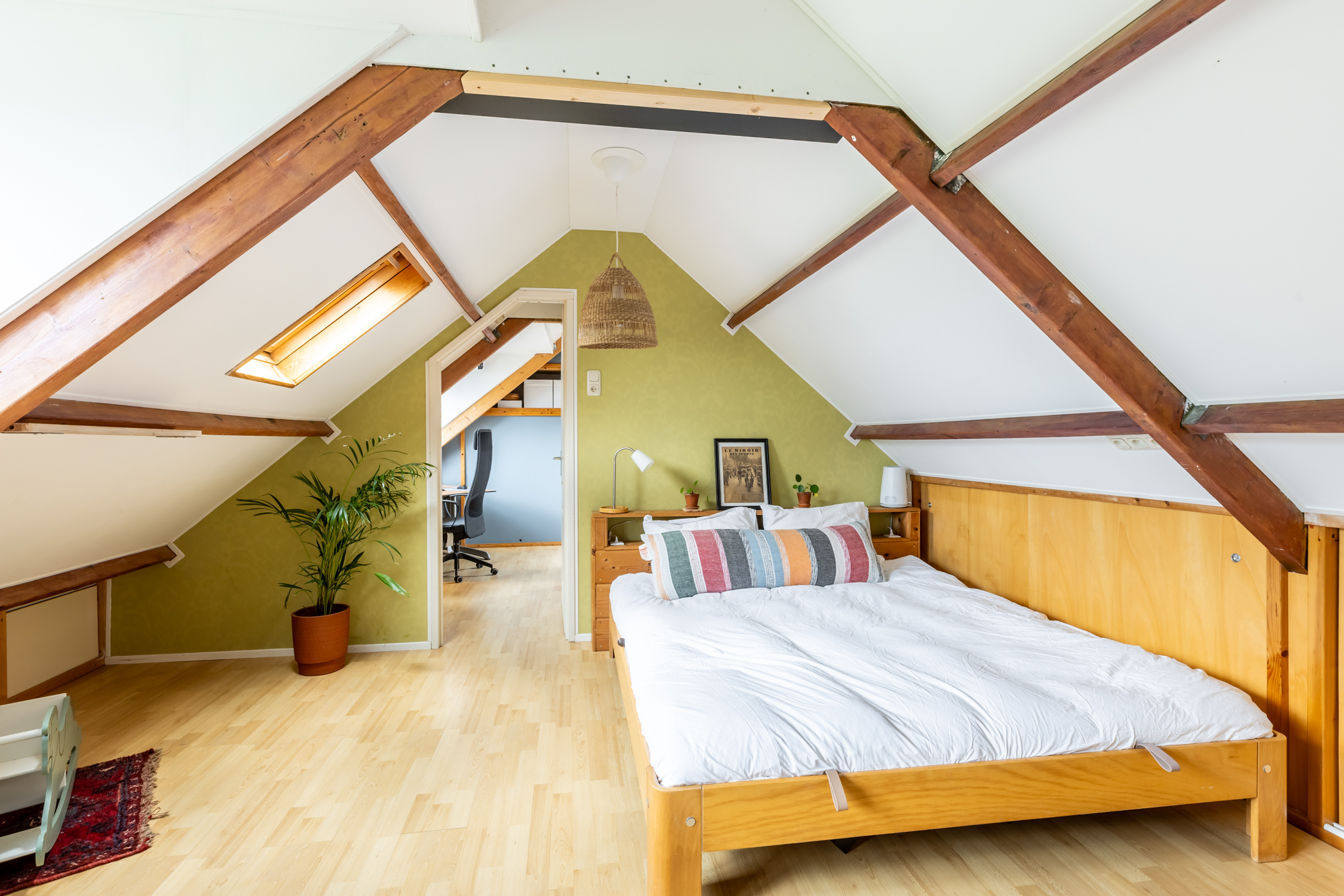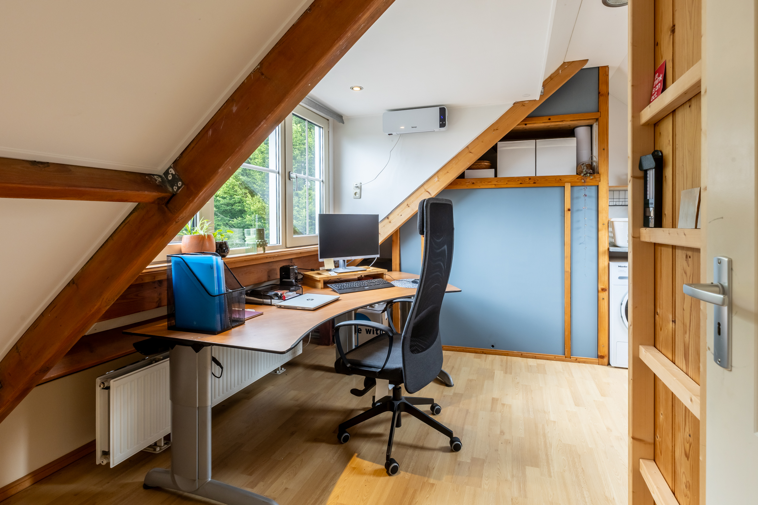 Op de tweede verdieping kom je op een ruime overloop met een praktische werkruimte met één werkplek. Hier vind je ook de aansluitingen voor de cv-ketel (2023), de wasmachine en de droger. Achter de deur bevindt zich een aparte vierde slaapkamer, eveneens voorzien van een dakkapel en veel bergruimte achter de knieschotten. In deze kamer is ook een tweede werkplek gecreëerd. Dankzij de dakramen is deze verdieping heerlijk licht en veelzijdig te gebruiken – als slaapkamer, logeerkamer of hobbyruimte.