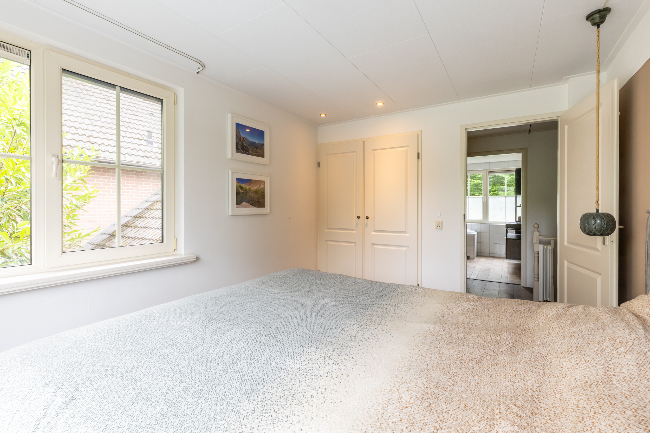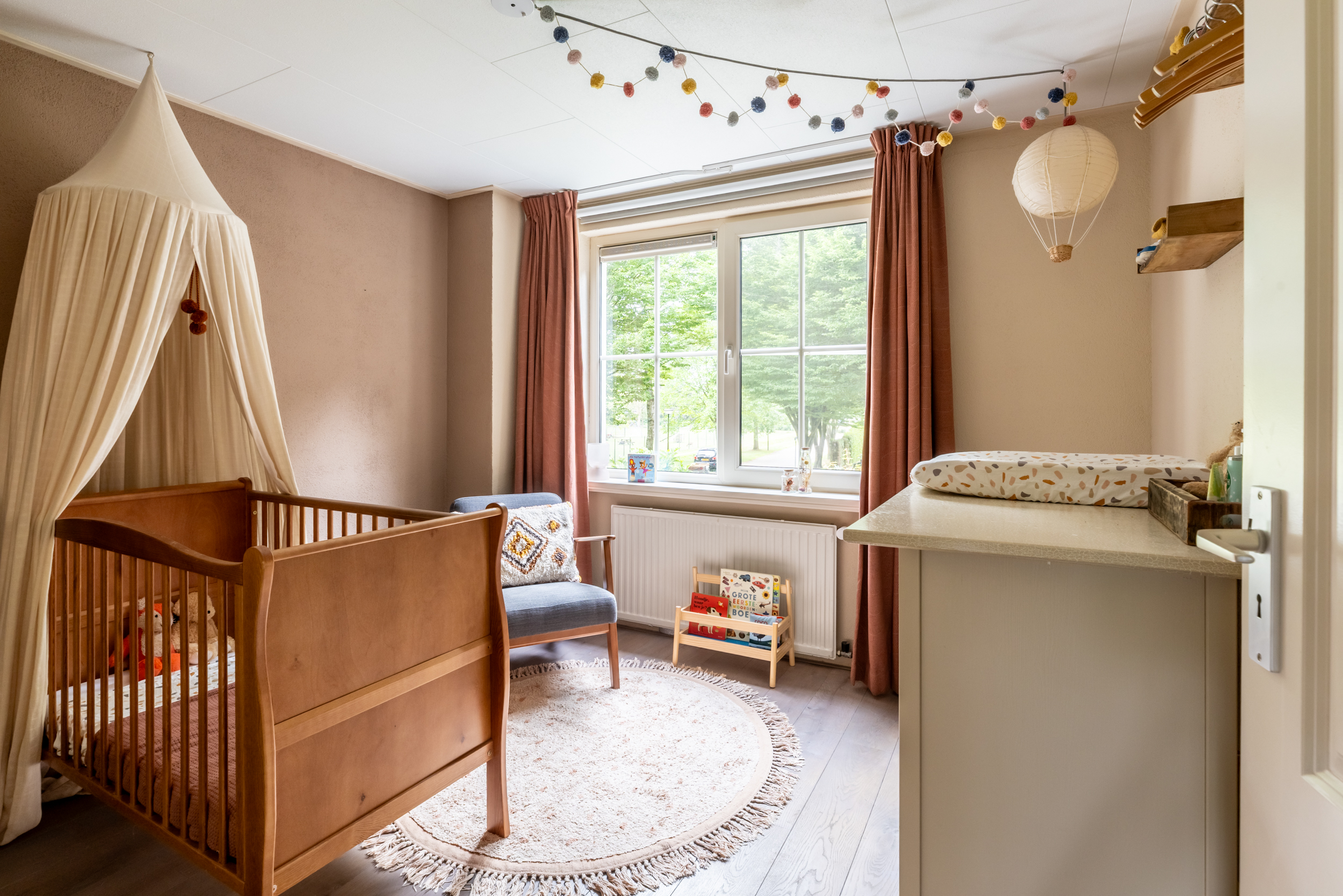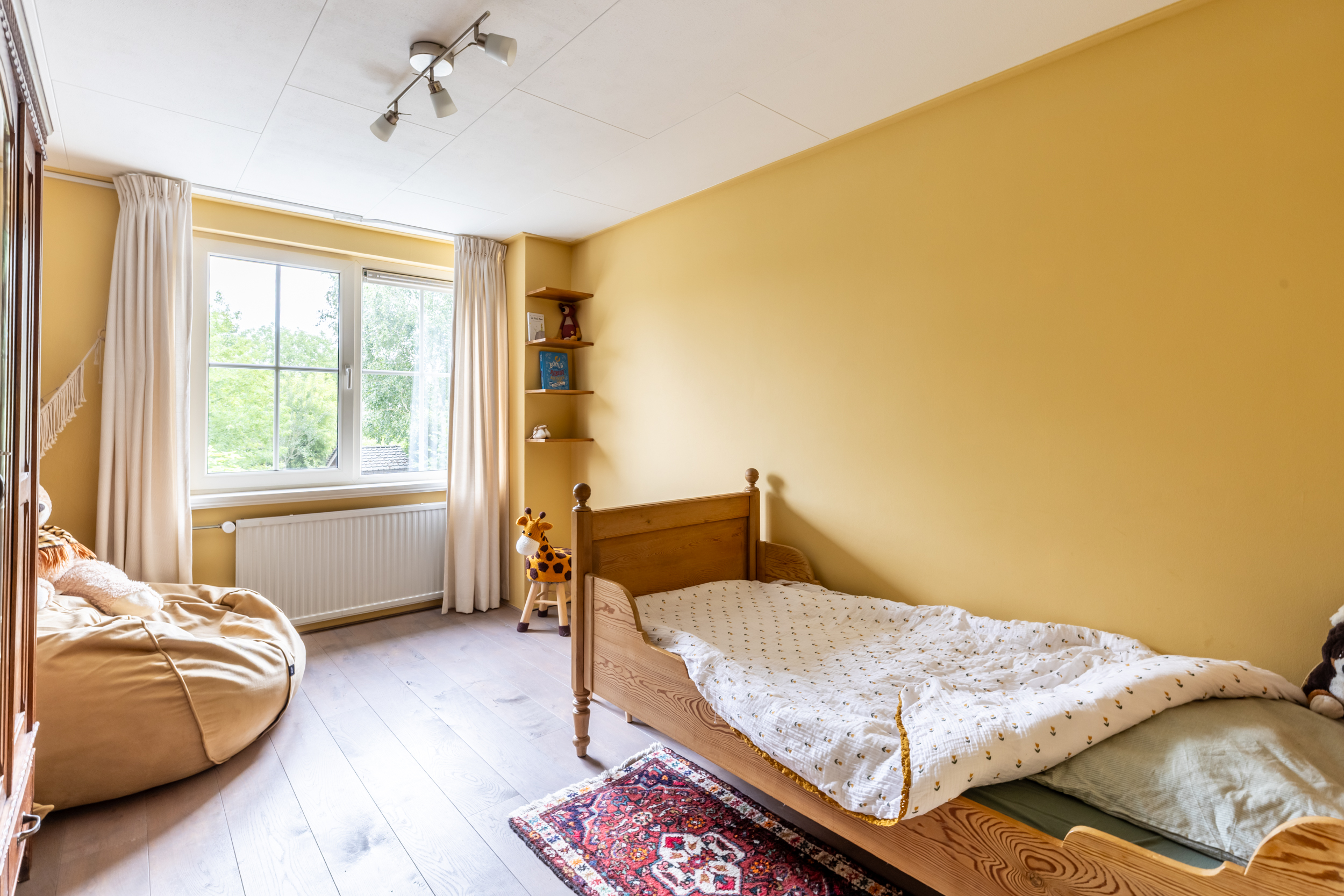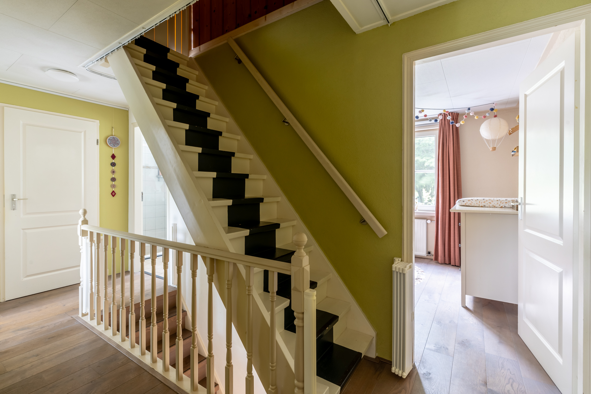 Op de eerste verdieping bevinden zich drie ruime slaapkamers, allemaal met grote ramen die zorgen voor een prettige lichtinval en uitzicht op het groen rondom de woning. De vloeren zijn hier uitgevoerd in sfeervol hout, wat de kamers een warme uitstraling geeft en moeiteloos past bij iedere woonstijl. Tevens beschikken twee van de drie slaapkamer over elektrische bedienbare rolluiken.