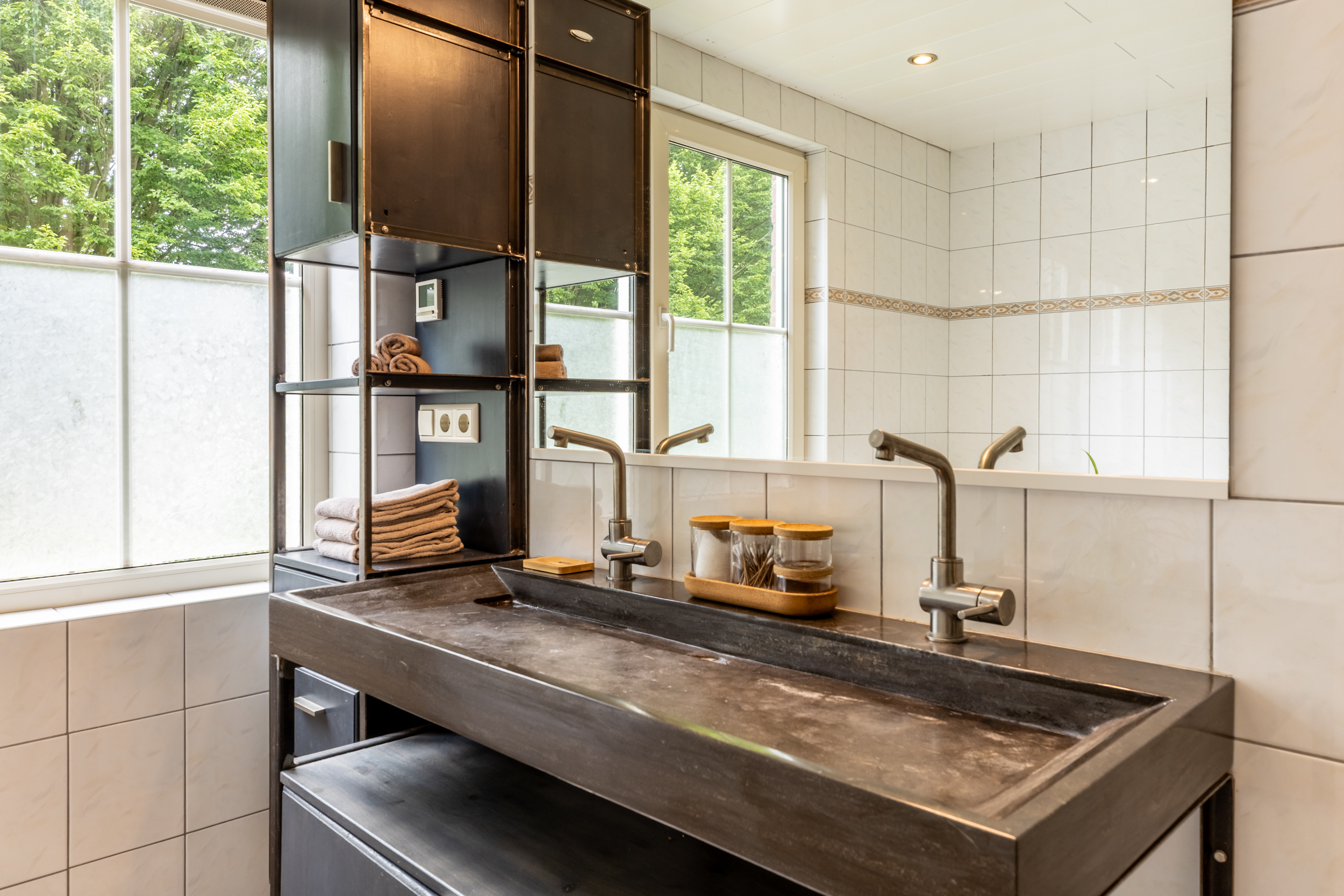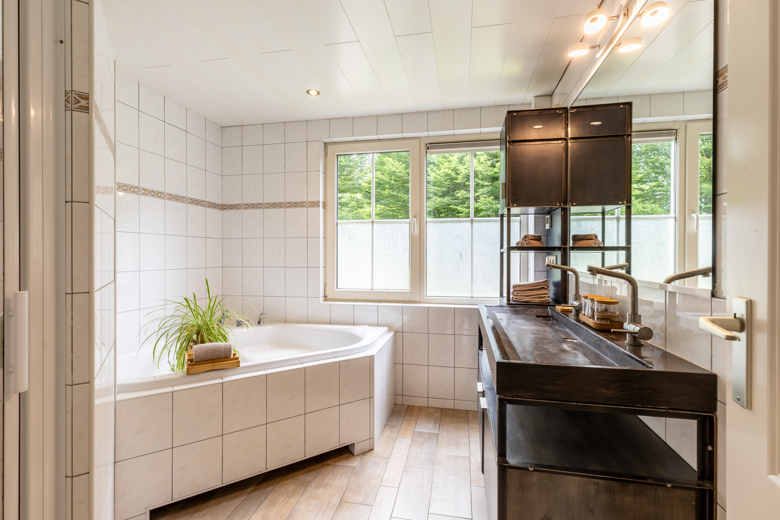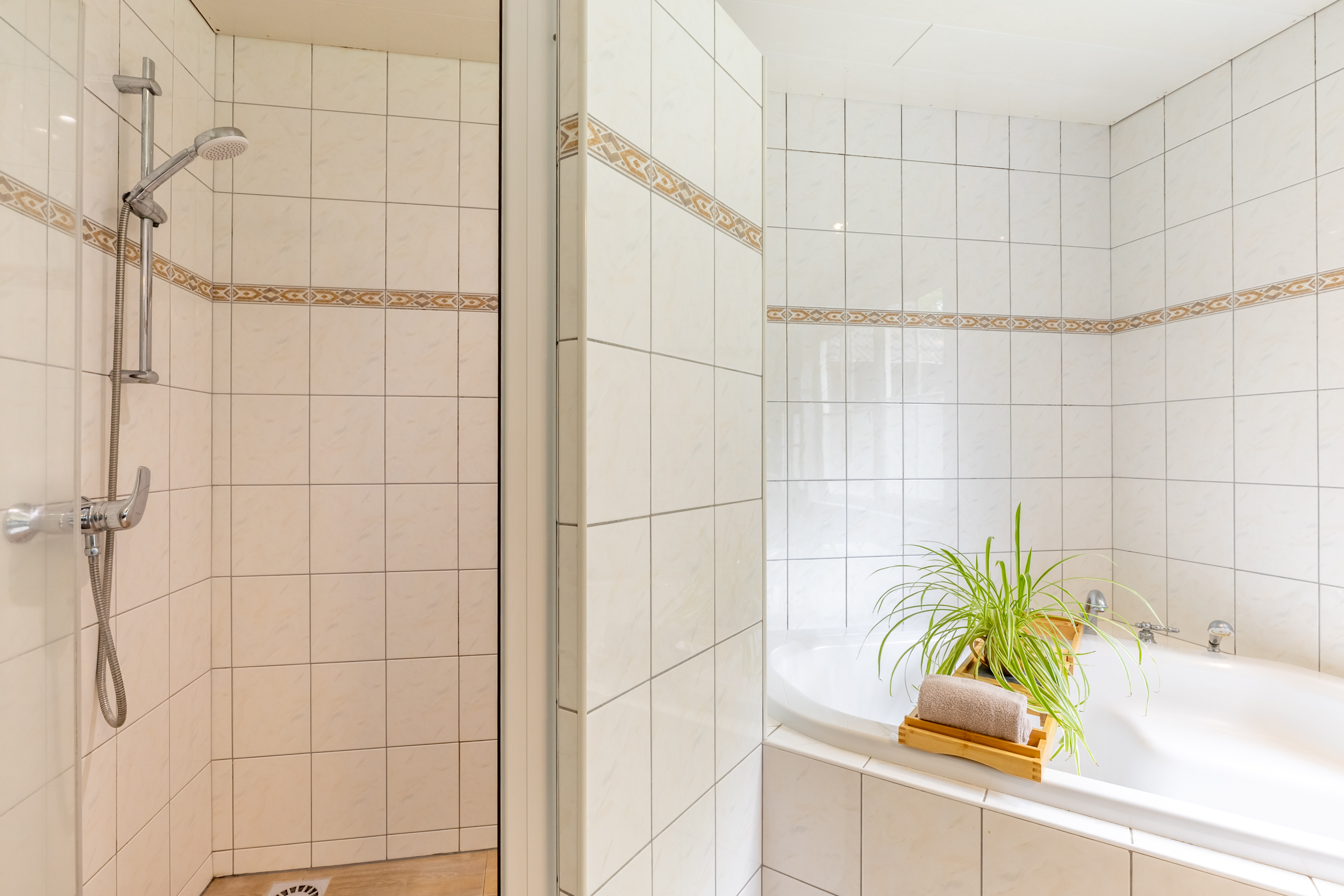 De badkamer is royaal en voorzien van elektrische vloerverwarming, een ligbad, aparte douche en een modern wastafelmeubel met dubbele kraan. De lichte wandtegels in combinatie met de houtlook vloer creëren een rustige, ontspannen sfeer – de ideale plek om even tot rust te komen. Het toilet bevindt zich separaat, wat het comfort op deze verdieping vergroot.