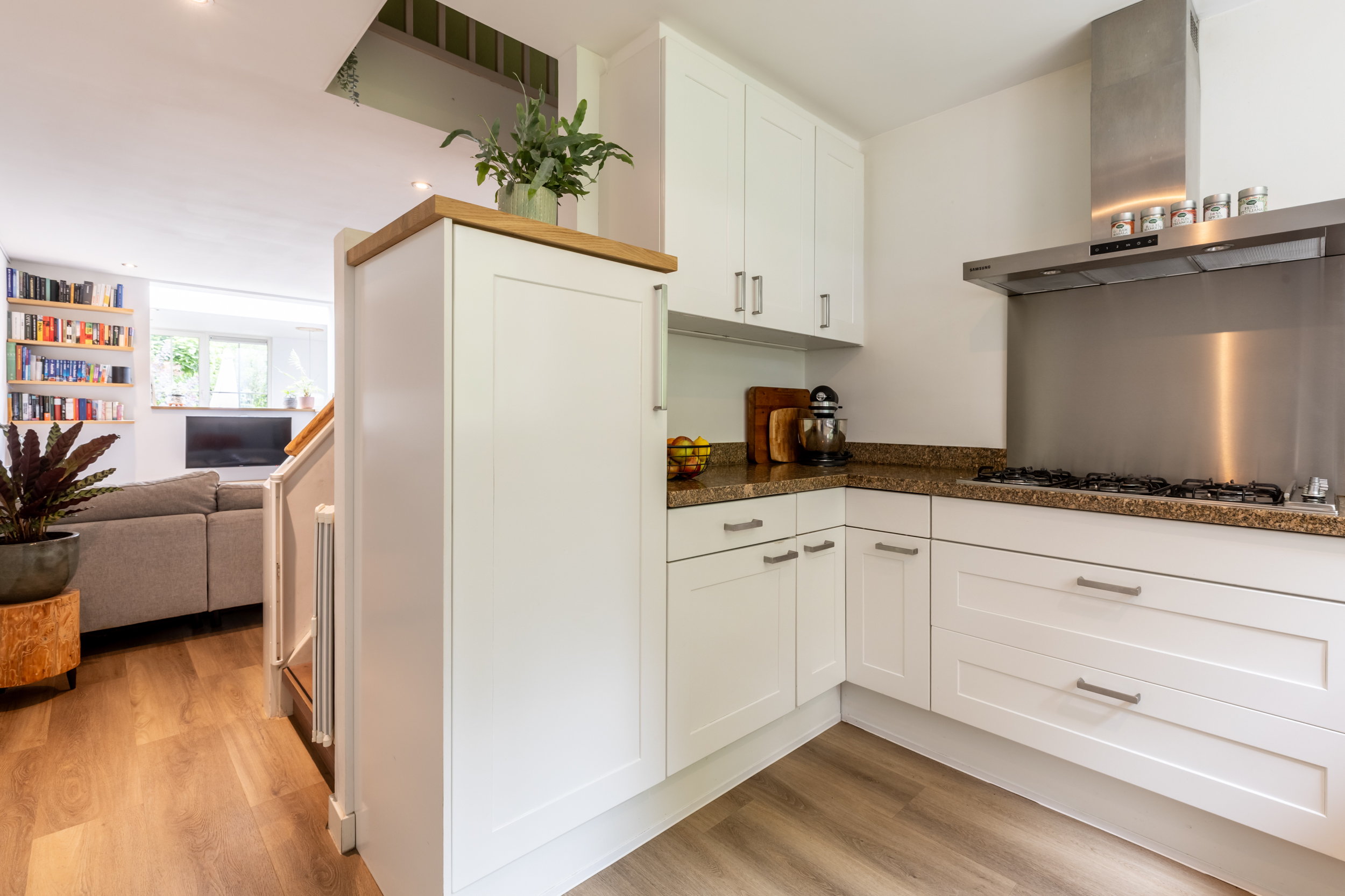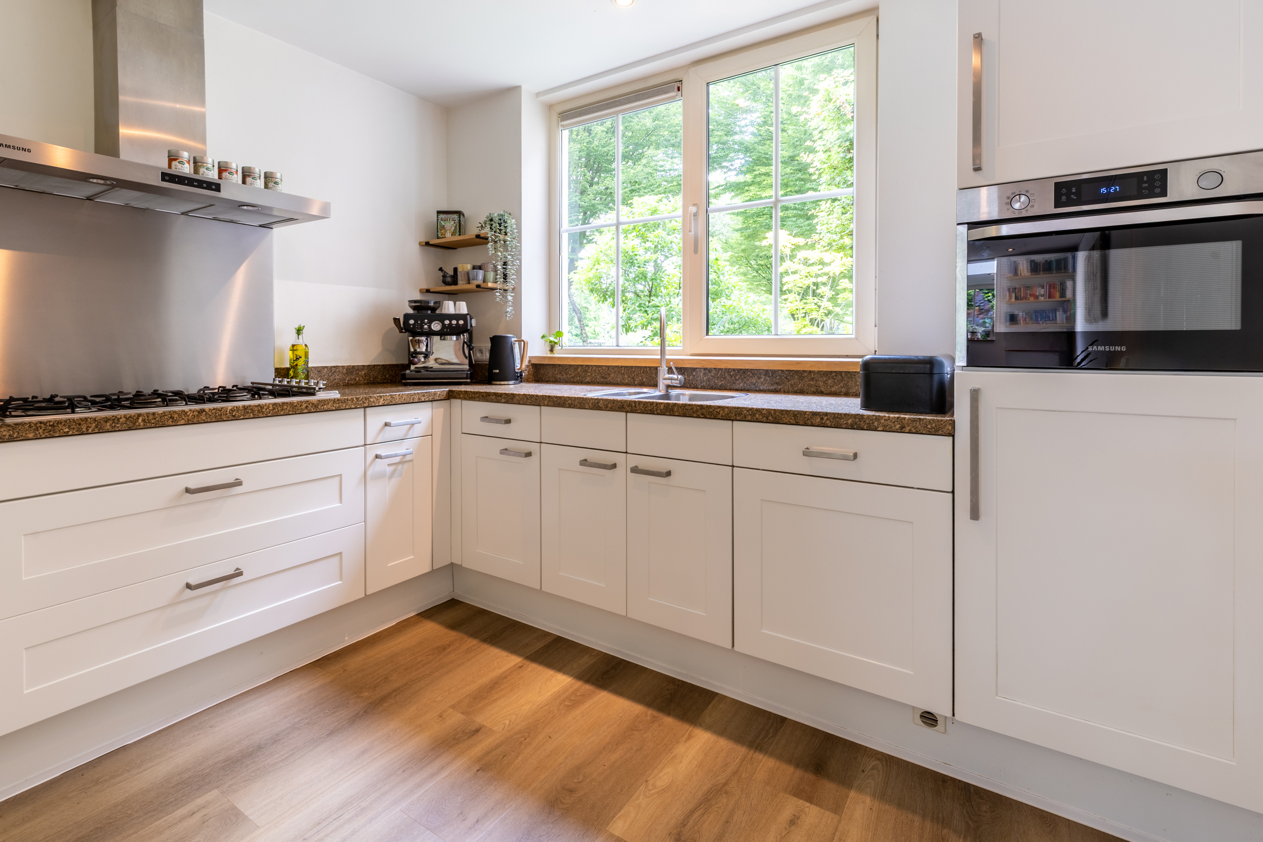 De keuken, in een moderne hoekopstelling, is praktisch én stijlvol. Met een granieten werkblad, lichte kastfronten en diverse inbouwapparatuur is dit een fijne plek aan de voorzijde van de woning..