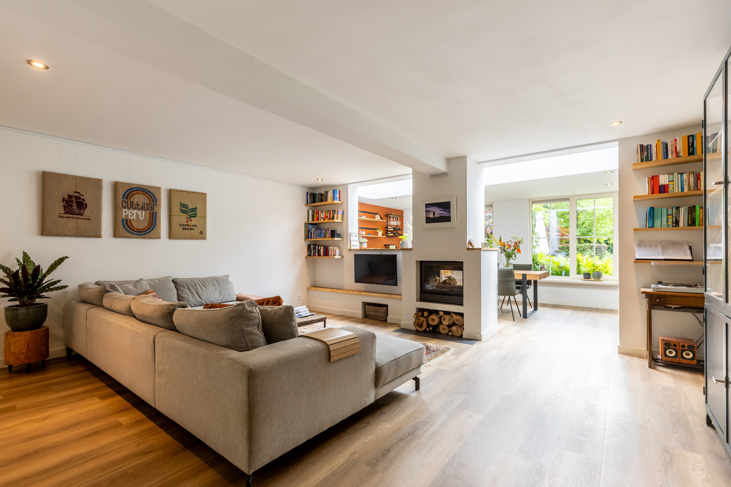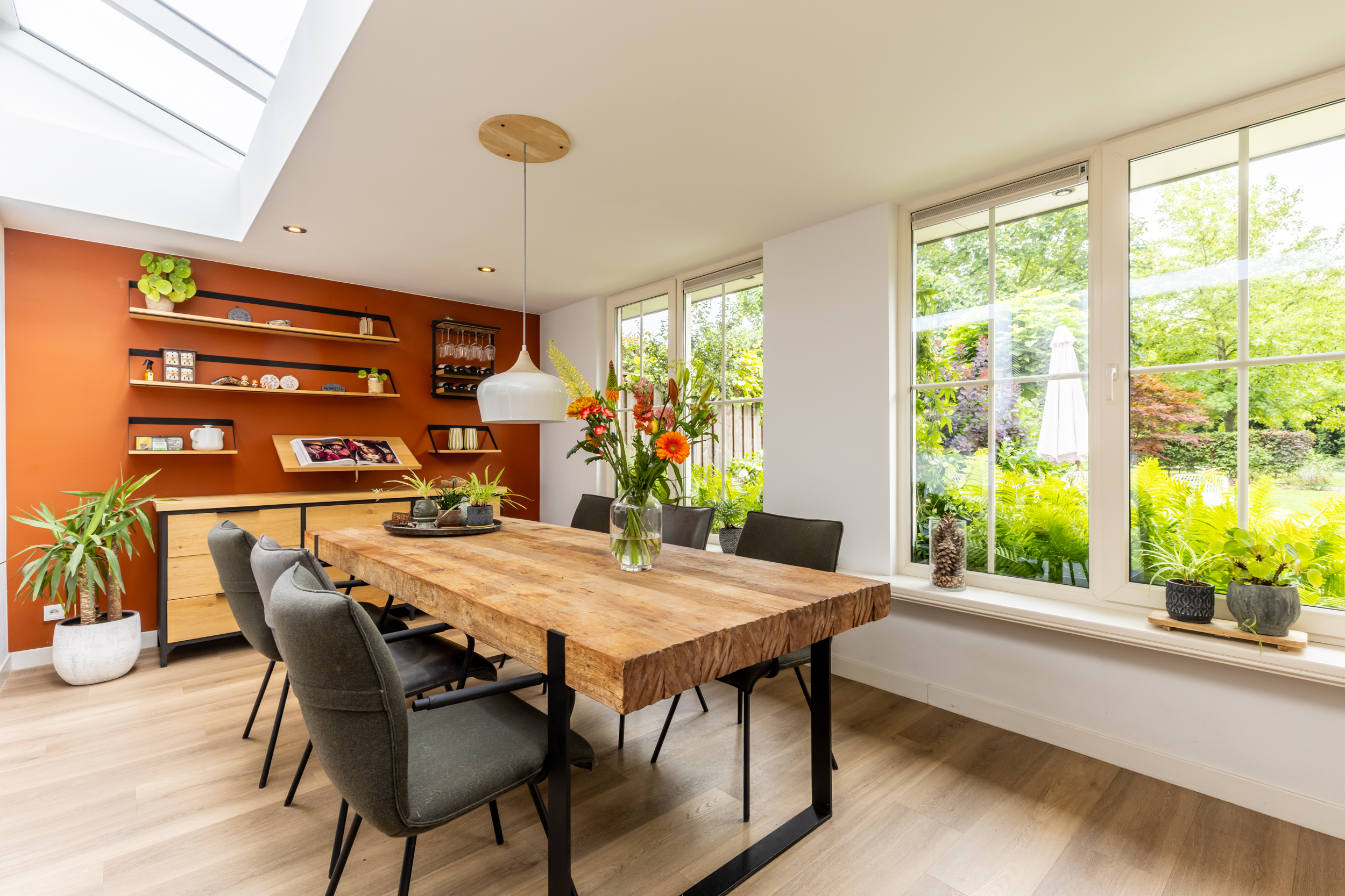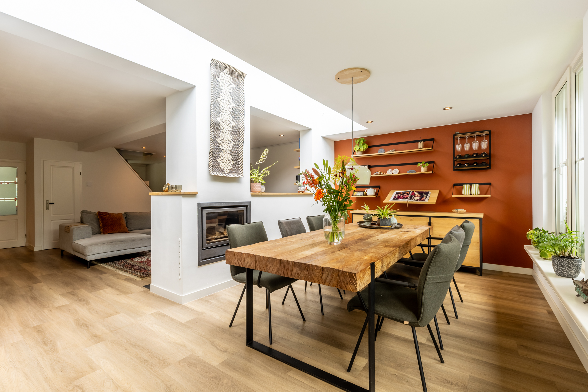De zithoek bij de houtkachel is de ideale plek om te ontspannen, terwijl je aan de andere zijde van de kamer een royale eethoek vindt met uitzicht op de tuin. Een bijzonder detail is de sfeervolle houtkachel die aan twee zijden zichtbaar is – zo geniet je van het knisperende vuur zowel vanuit de zithoek als vanuit de eethoek. De vloer is vernieuwd, voorzien van vloerverwarming en afgewerkt met een stijlvolle pvc-vloer.