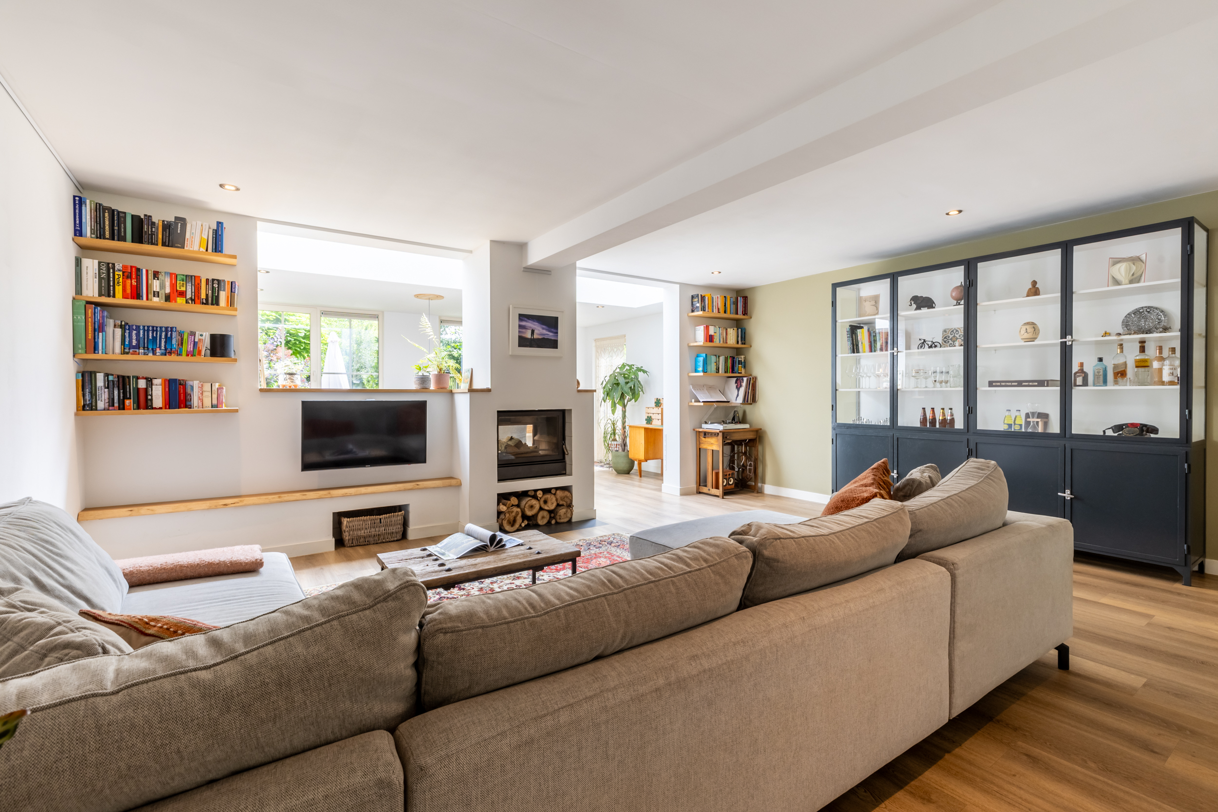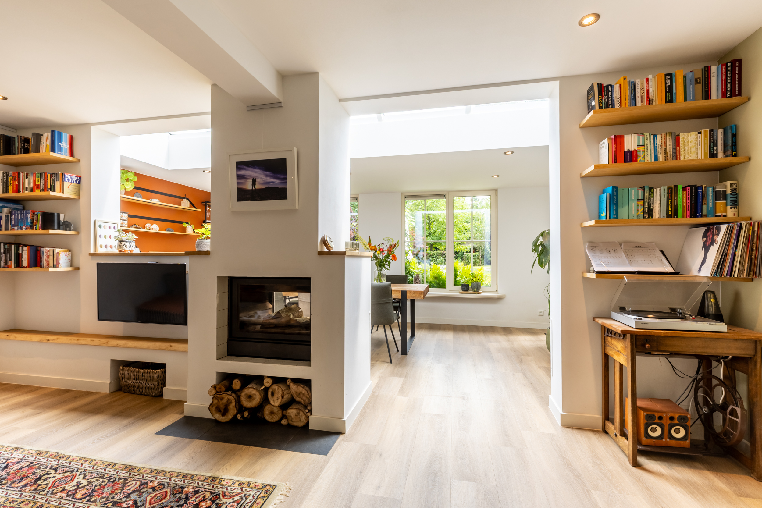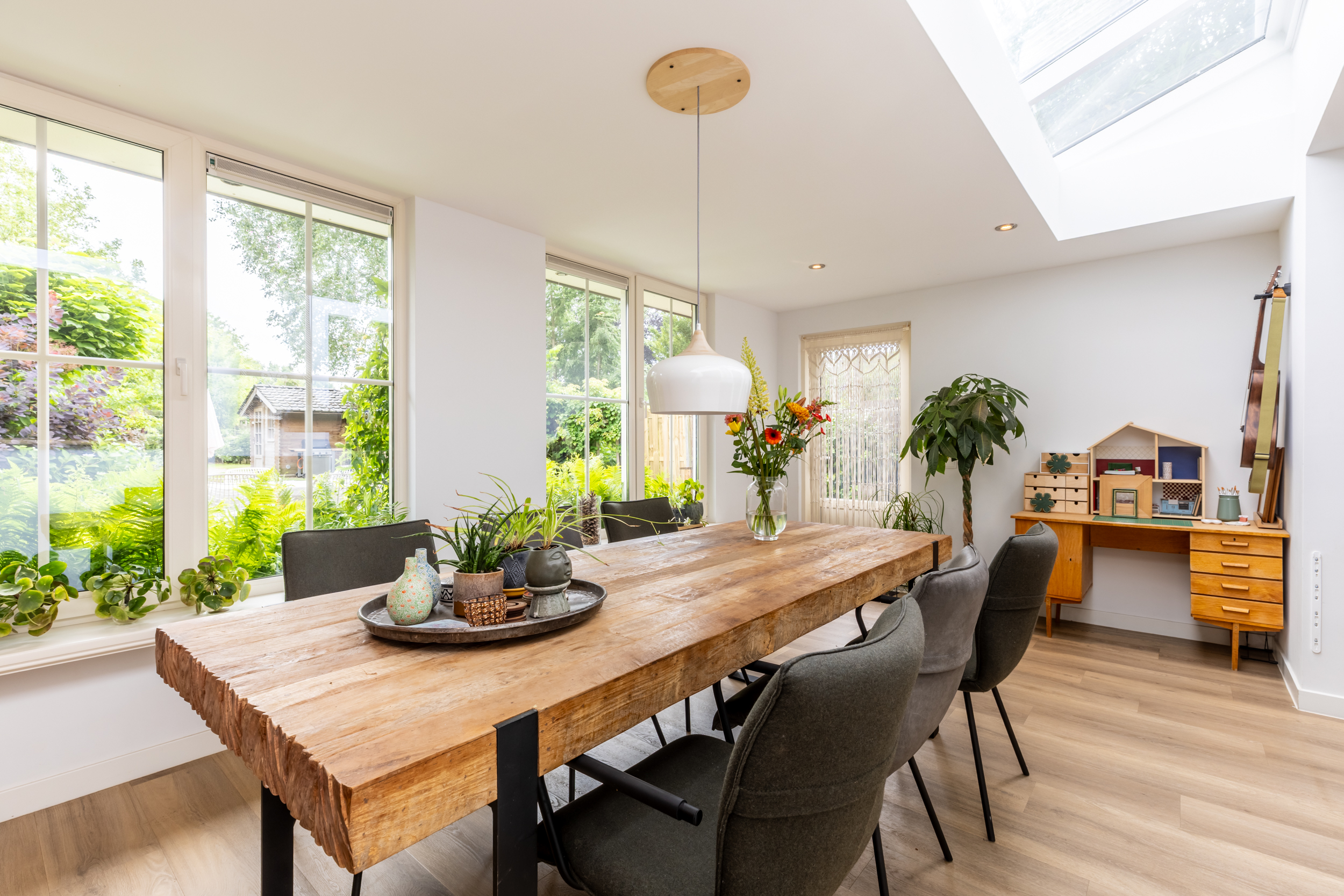 De zithoek bij de houtkachel is de ideale plek om te ontspannen, terwijl je aan de andere zijde van de kamer een royale eethoek vindt met uitzicht op de tuin. Een bijzonder detail is de sfeervolle houtkachel die aan twee zijden zichtbaar is – zo geniet je van het knisperende vuur zowel vanuit de zithoek als vanuit de eethoek. De vloer is vernieuwd, voorzien van vloerverwarming en afgewerkt met een stijlvolle pvc-vloer.