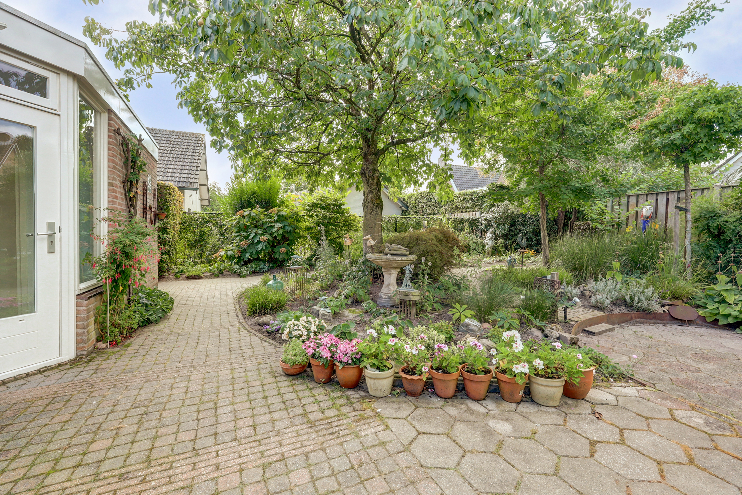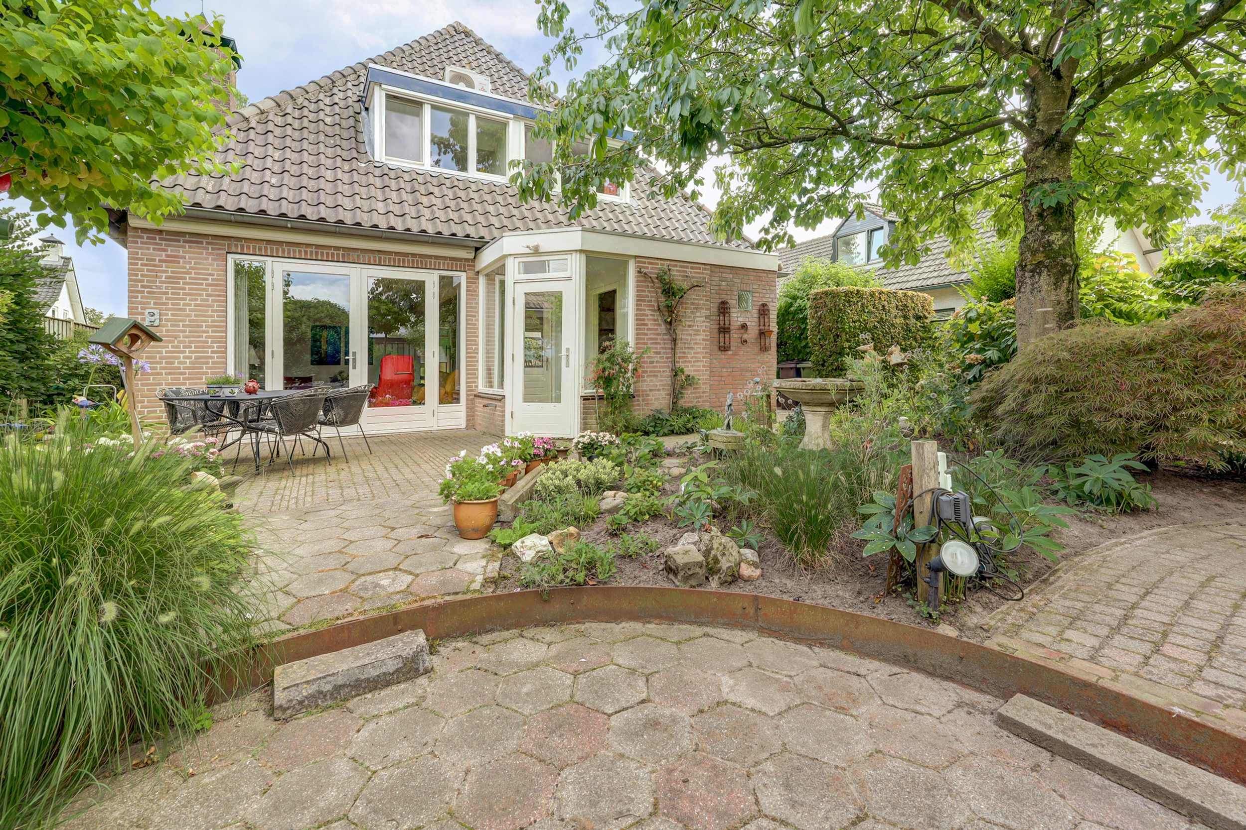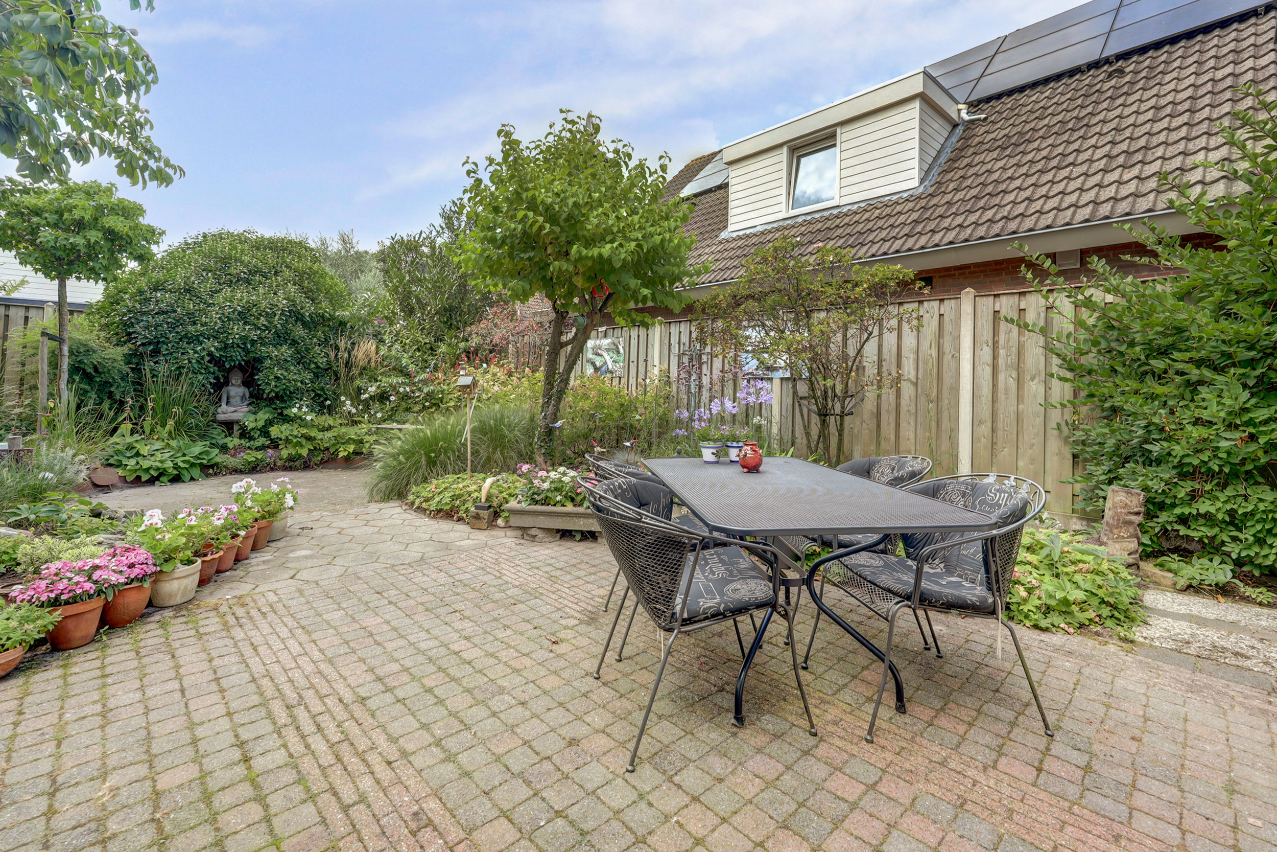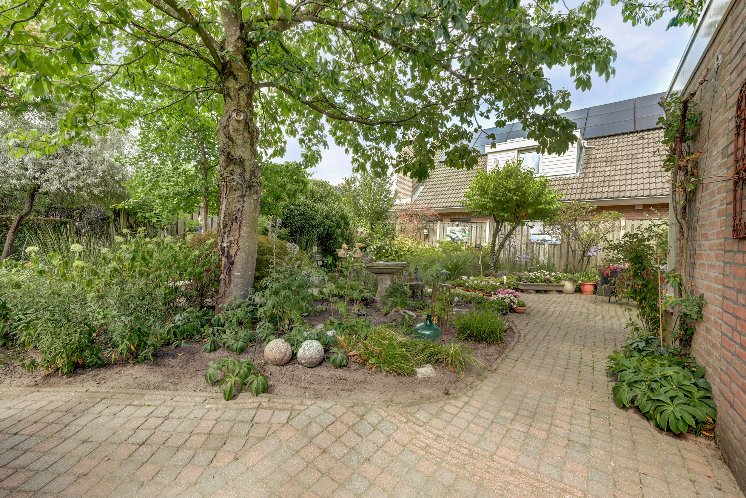 De buitenruimte is volledig rondom de woning gelegen en combineert op fraaie wijze betegeling met veel groenvoorziening. De vele planten en bomen geven de tuin een landelijke en sfeervolle uitstraling, waarbij direct zichtbaar is dat deze met zorg is ingericht en onderhouden. Er is volop ruimte om een gezellige zitplek te creëren, bijvoorbeeld met een grote tuintafel en stoelen om samen met familie en vrienden te genieten van lange zomeravonden. Dankzij de grote openslaande deuren vanuit de woonkamer loopt de tuin naadloos over in de binnenruimte, waardoor binnen en buiten perfect met elkaar verbonden zijn. De woning beschikt over een grote zonneluifel, waardoor je altijd een fijn plekje kunt vinden – of je nu wilt genieten van de zon of juist de schaduw opzoekt.