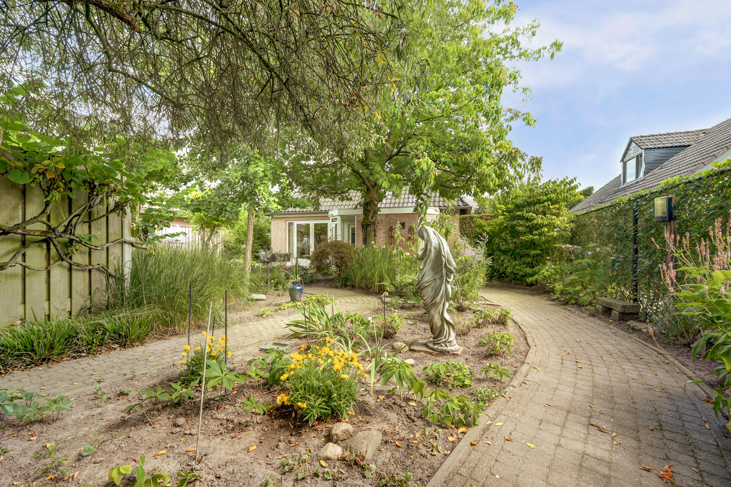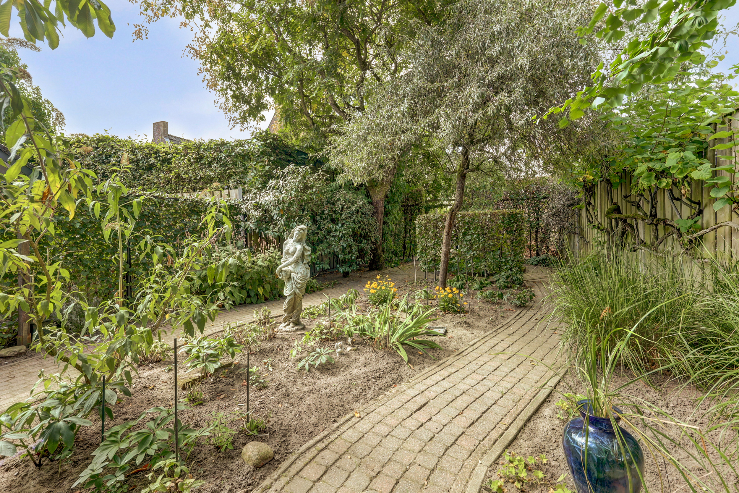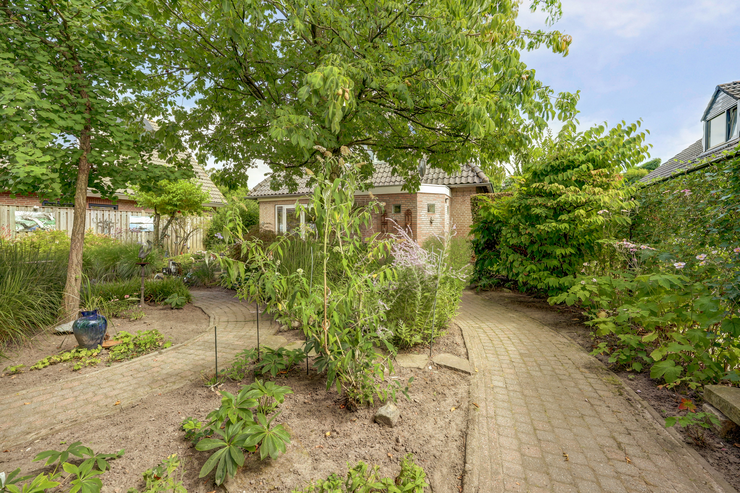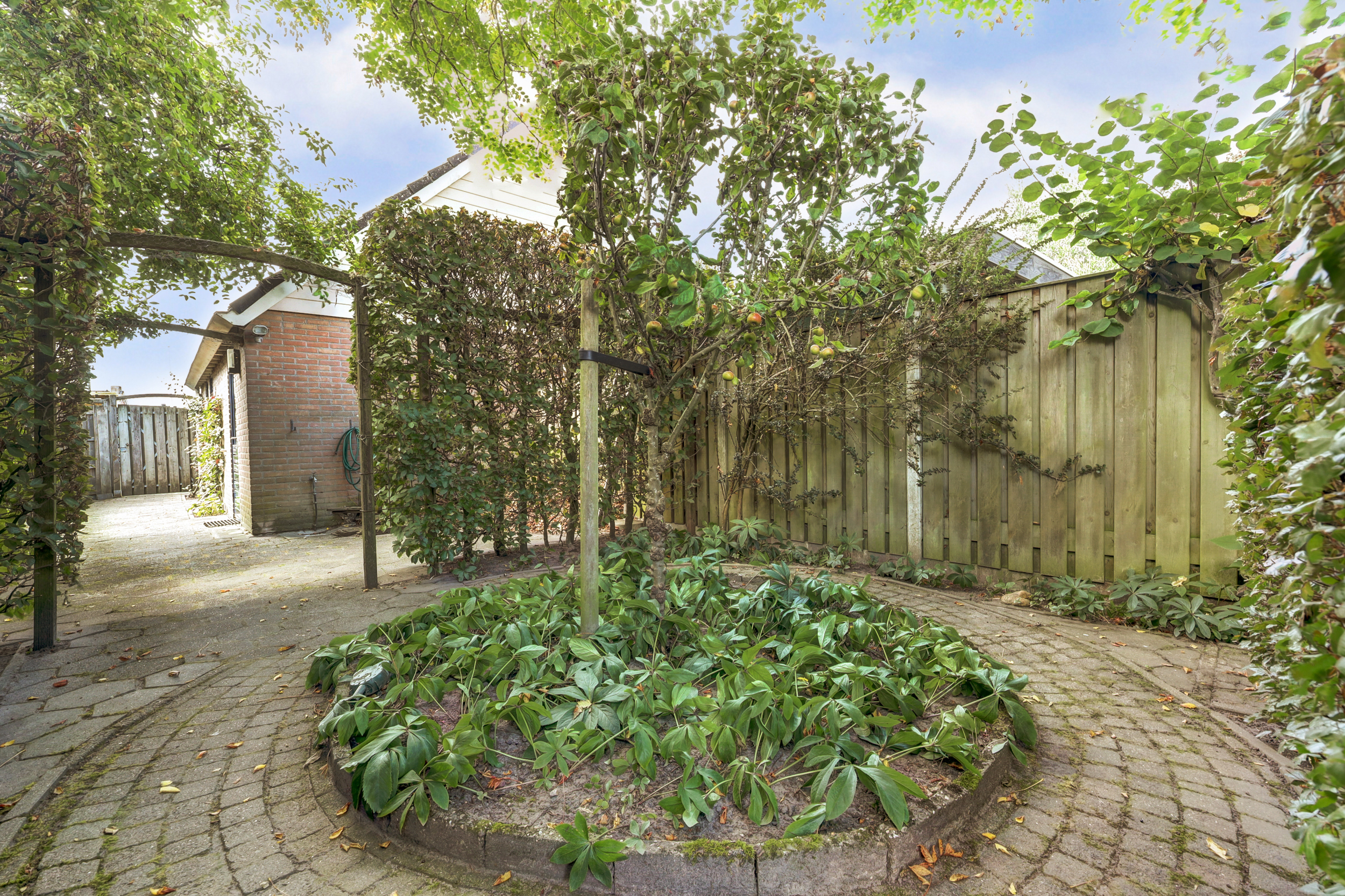 De buitenruimte is volledig rondom de woning gelegen en combineert op fraaie wijze betegeling met veel groenvoorziening. De vele planten en bomen geven de tuin een landelijke en sfeervolle uitstraling, waarbij direct zichtbaar is dat deze met zorg is ingericht en onderhouden. Er is volop ruimte om een gezellige zitplek te creëren, bijvoorbeeld met een grote tuintafel en stoelen om samen met familie en vrienden te genieten van lange zomeravonden. Dankzij de grote openslaande deuren vanuit de woonkamer loopt de tuin naadloos over in de binnenruimte, waardoor binnen en buiten perfect met elkaar verbonden zijn. De woning beschikt over een grote zonneluifel, waardoor je altijd een fijn plekje kunt vinden – of je nu wilt genieten van de zon of juist de schaduw opzoekt.