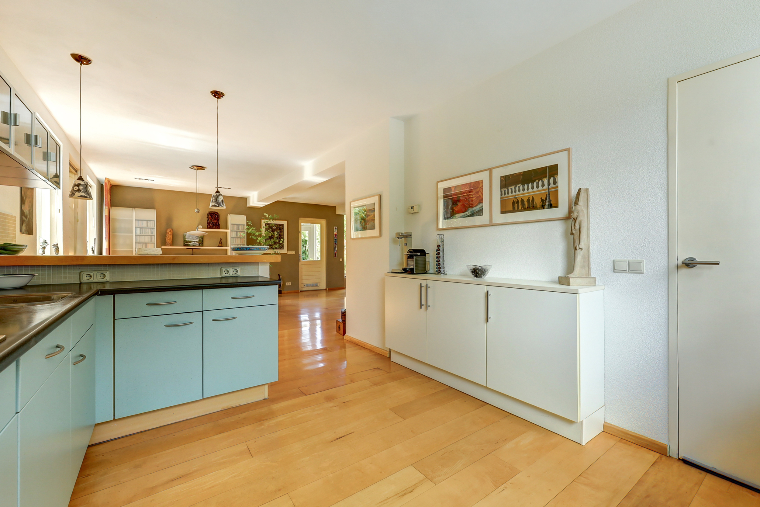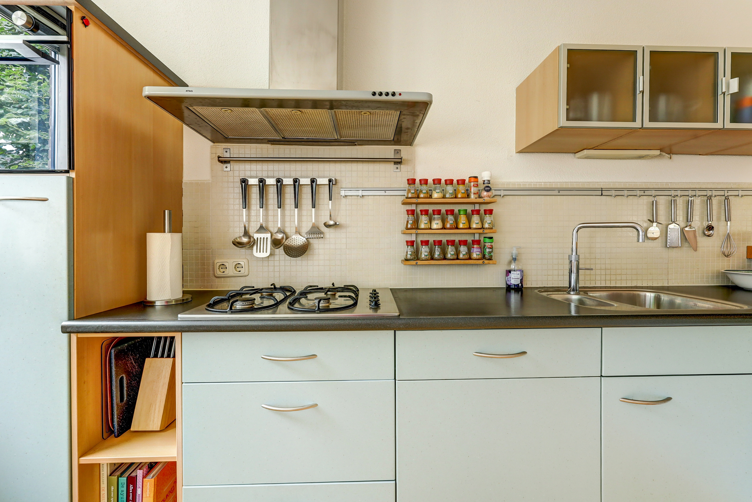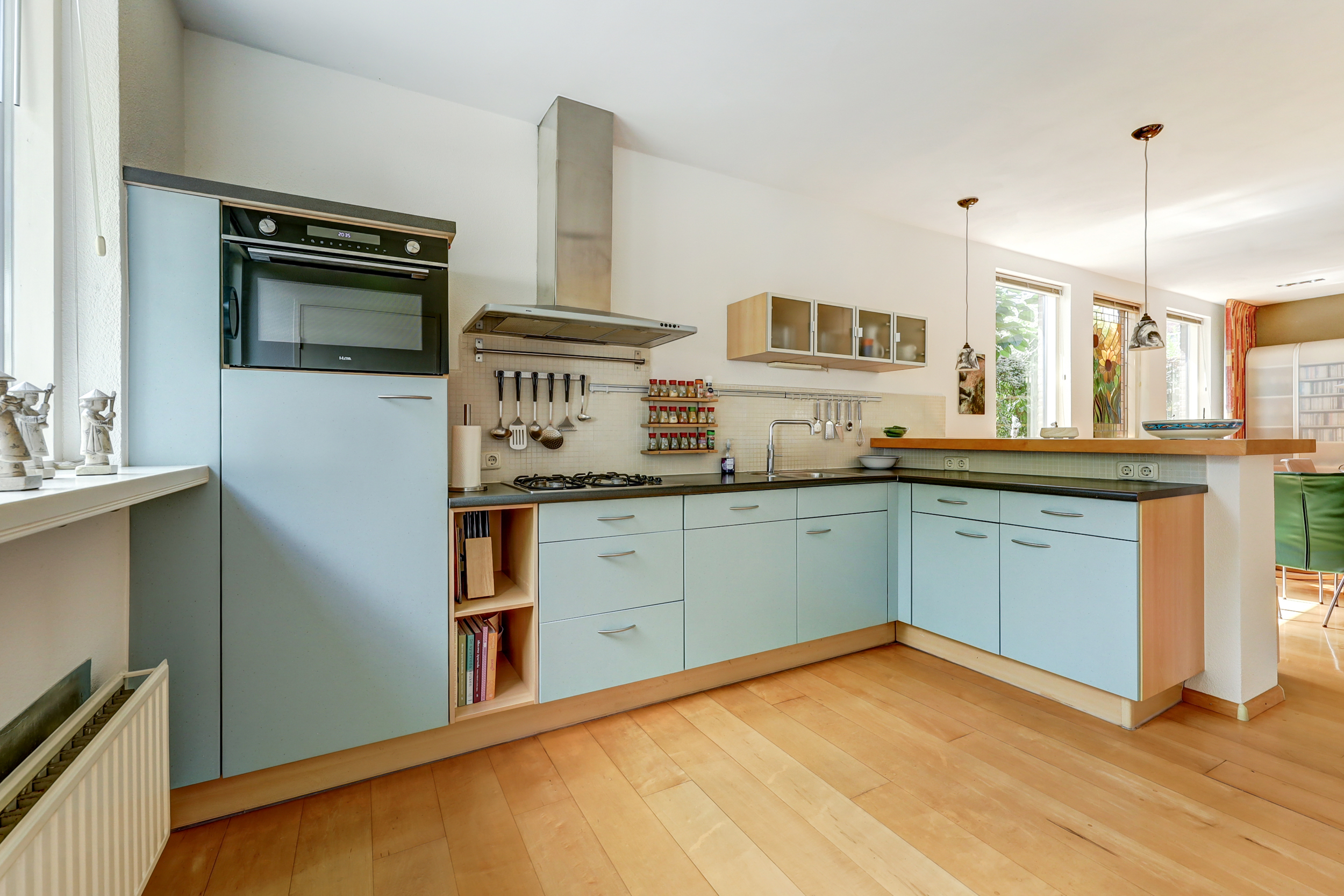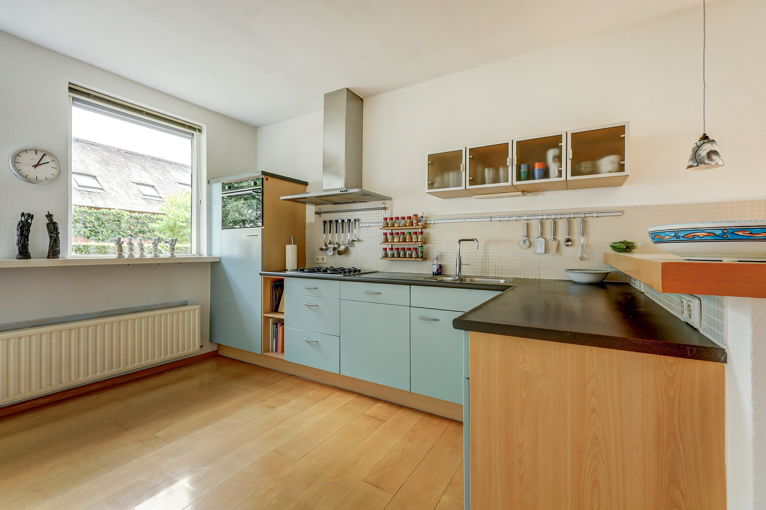 De open keuken is praktisch ingericht en voorzien van diverse inbouwapparatuur, waaronder een Quooker kraan, 4-pits gaskookplaat, afzuigkap, vaatwasser en spoelbak. Dankzij de vele kastruimte en het verhoogde barretje is dit een fijne plek om uitgebreid te koken of juist snel en praktisch een hapje te eten.