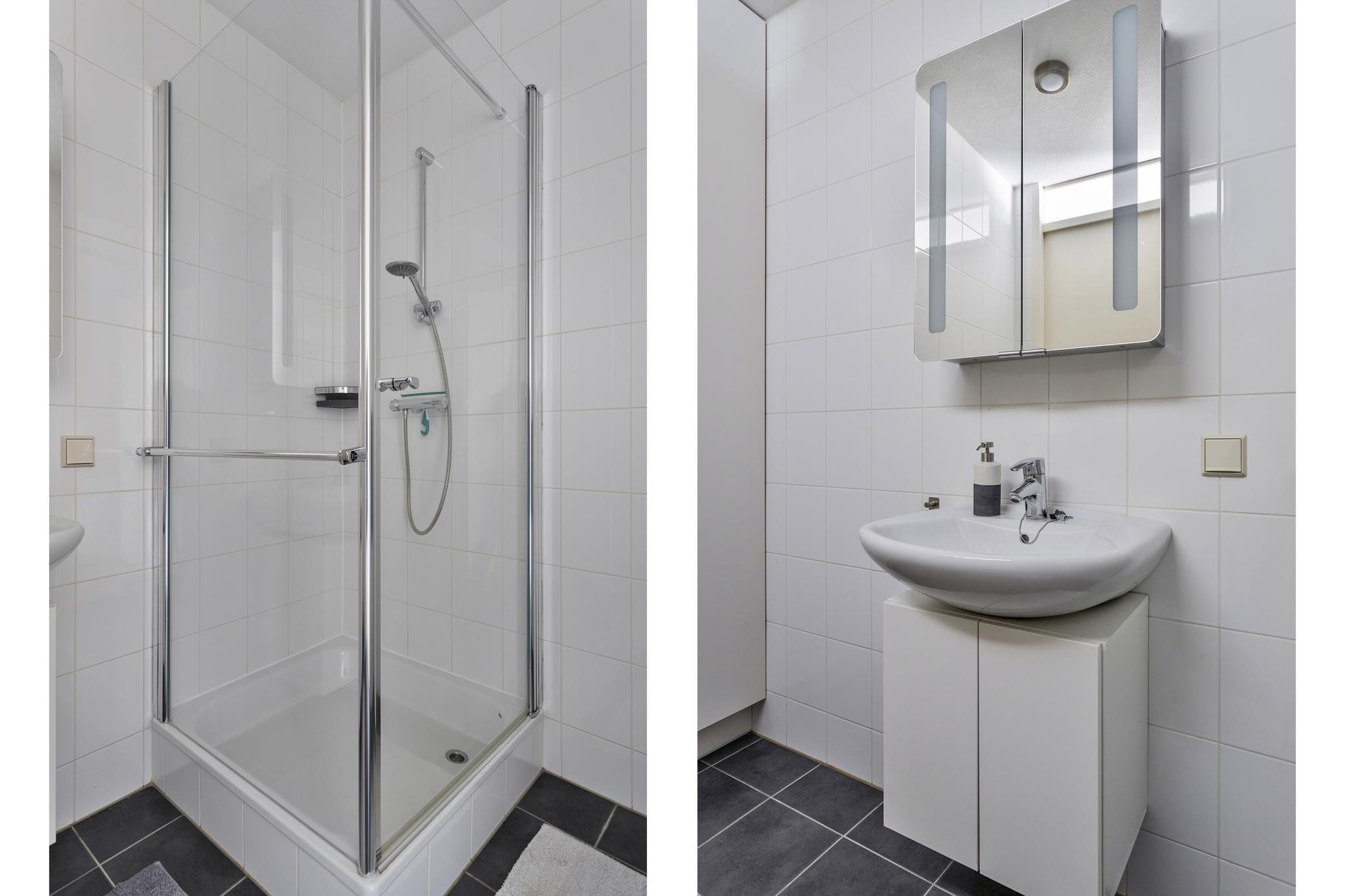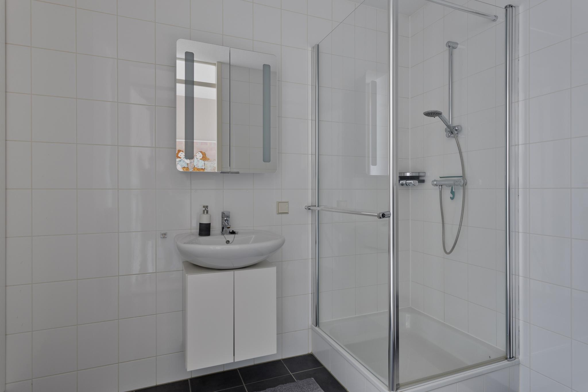 De badkamer is lekker ruim en volledig betegeld in een rustige en neutrale stijl. Hier vindt u een douche en een wastafel met wastafelmeubel, waarin u al uw toiletspullen handig kunt opbergen. Het is een praktische en comfortabele ruimte die u dagelijks van alle gemakken voorziet. Naast de badkamer bevindt zich een apart toilet, dat eveneens volledig is betegeld.