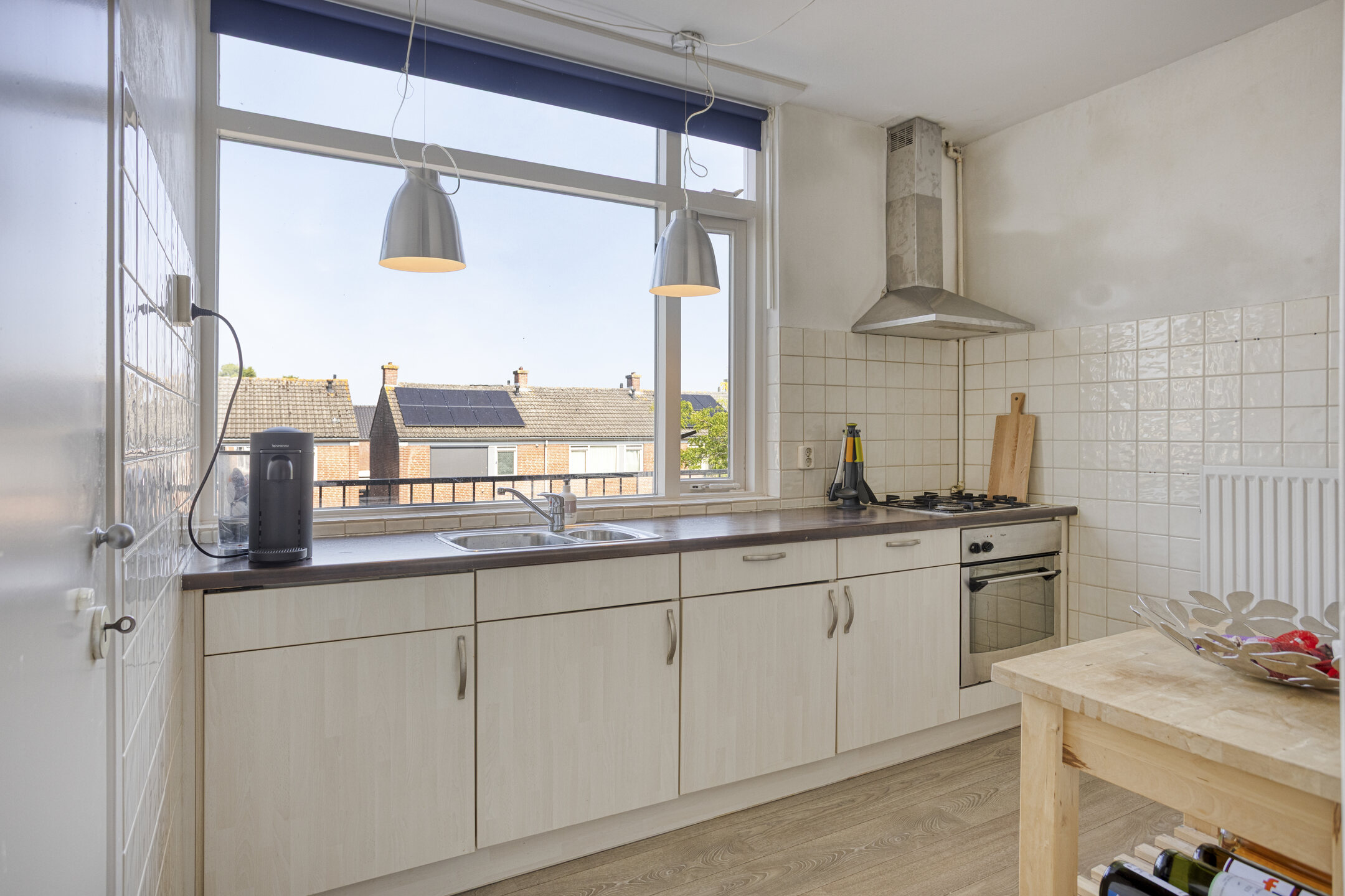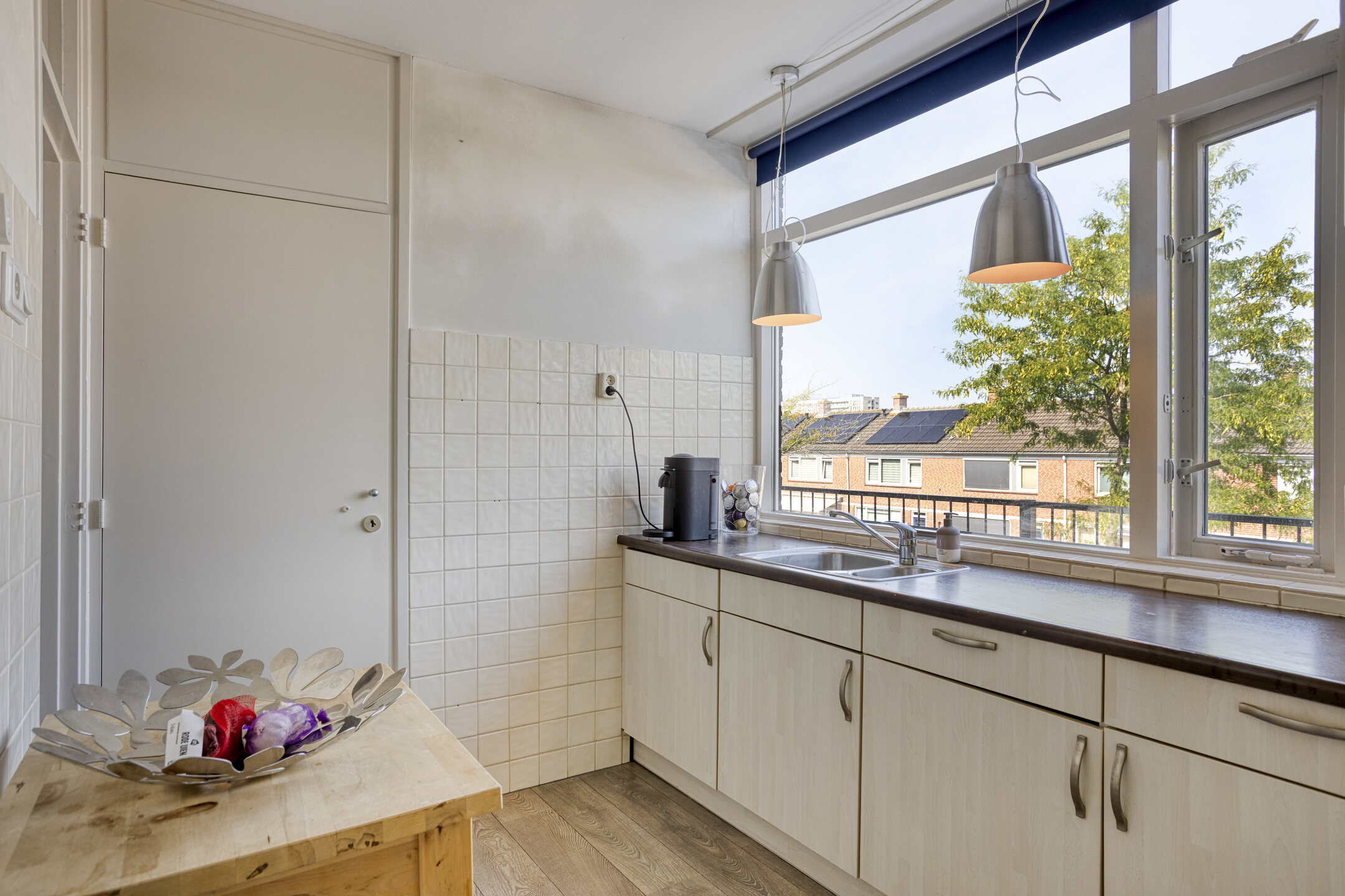 Via de entree met kast en trapopgang kom je in de keuken aan de voorzijde van de woning. De keuken is voorzien van een dubbele spoelbak, afzuigkap en koelkast, en dankzij het raam aan de voorzijde geniet je tijdens het koken van een vrij uitzicht naar buiten. Aansluitend vind je een berging met wasmachineaansluiting. De ruime woonkamer bevindt zich aan de achterzijde en geven via dubbele deuren toegang tot het zonnige balkon op het zuidoosten met voldoende ruimte voor een heerlijke zithoek.