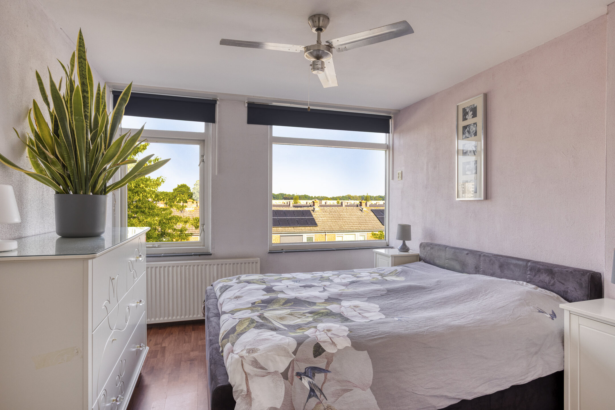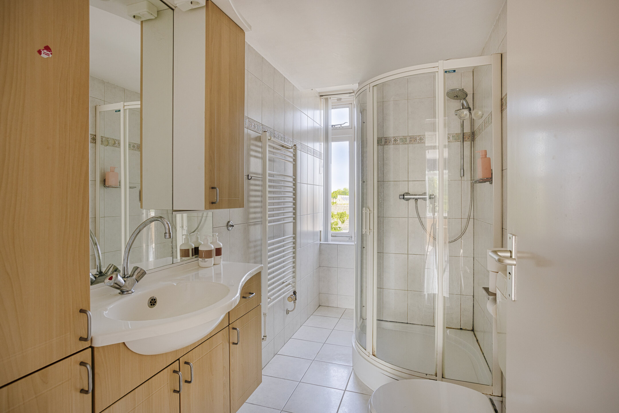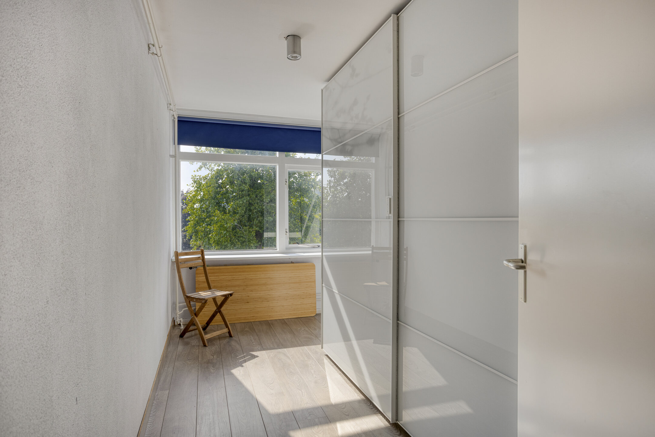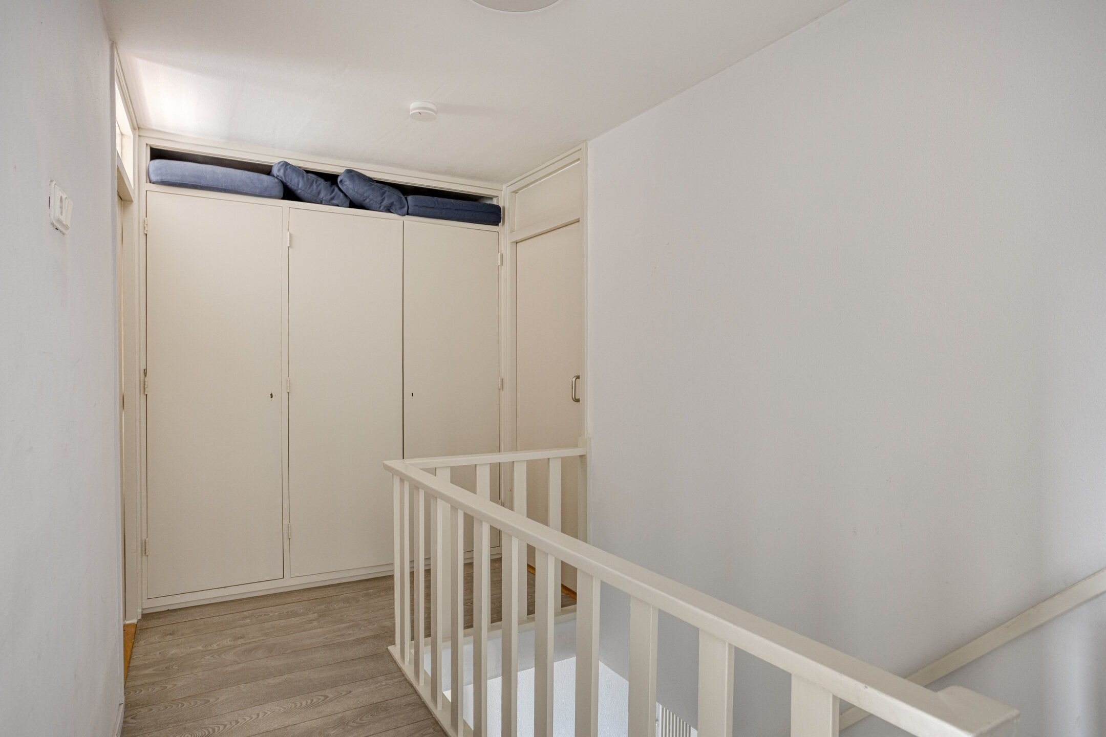 De overloop biedt toegang tot drie slaapkamers, waarvan twee aan de voorzijde en één aan de achterzijde van de woning. Alle kamers zijn voorzien van rechte wanden, waardoor de ruimte optimaal benut kan worden. De badkamer is uitgerust met een douche, wastafel met wastafelmeubel en tweede toilet. Daarnaast is de overloop voorzien van een kastenwand voor extra opbergruimte.