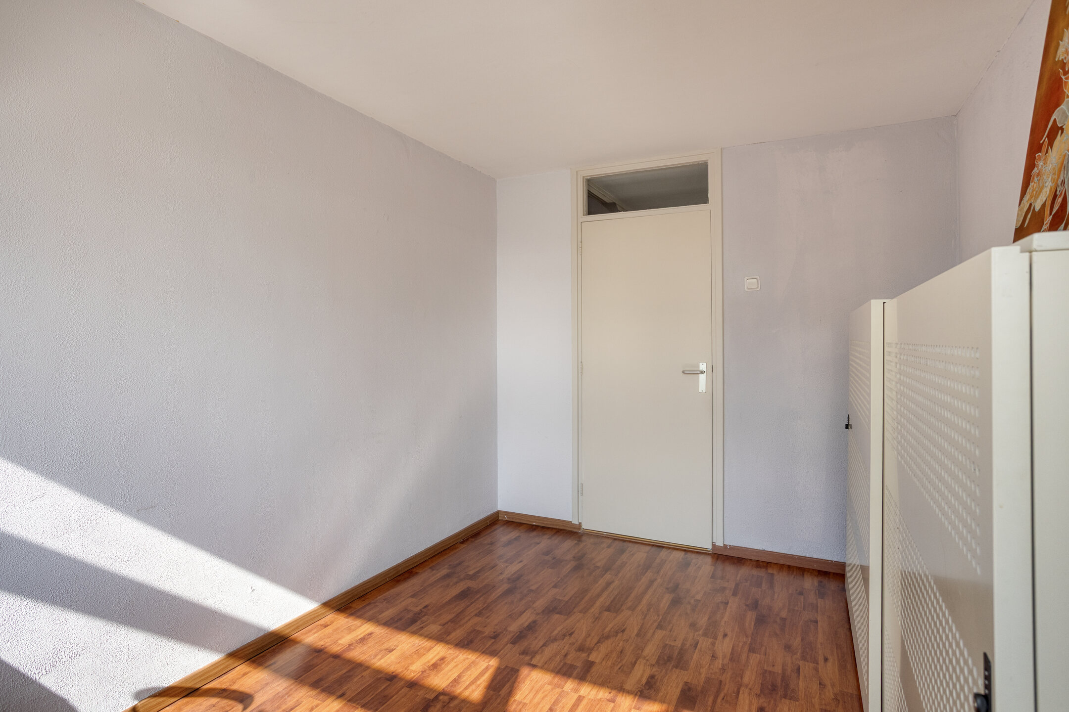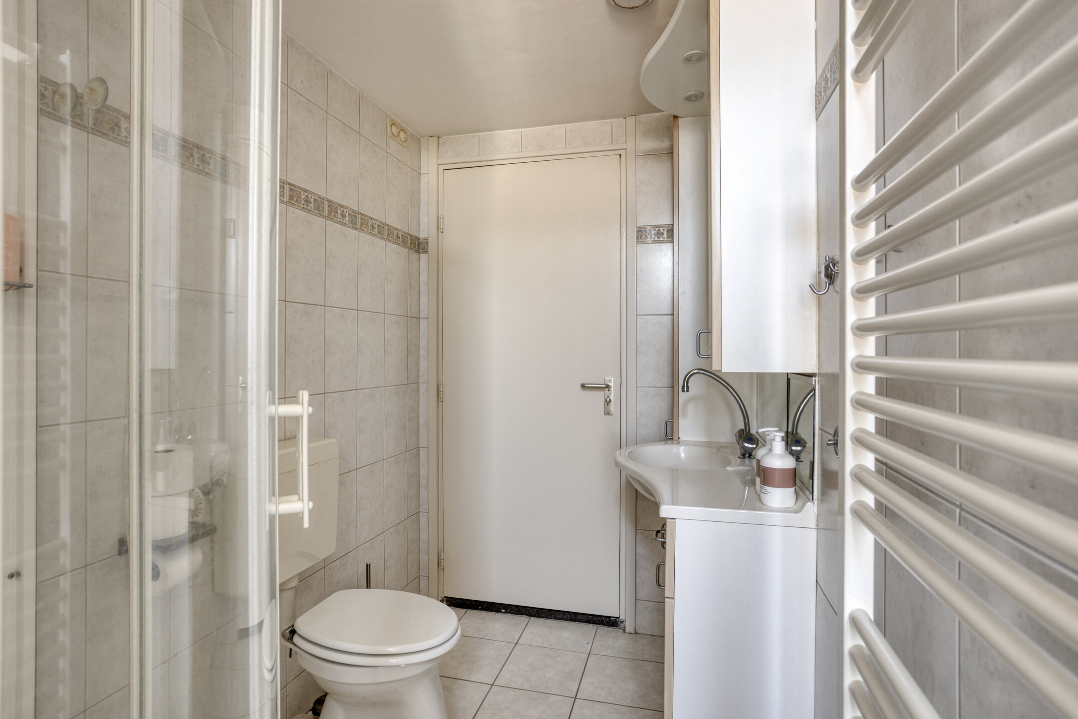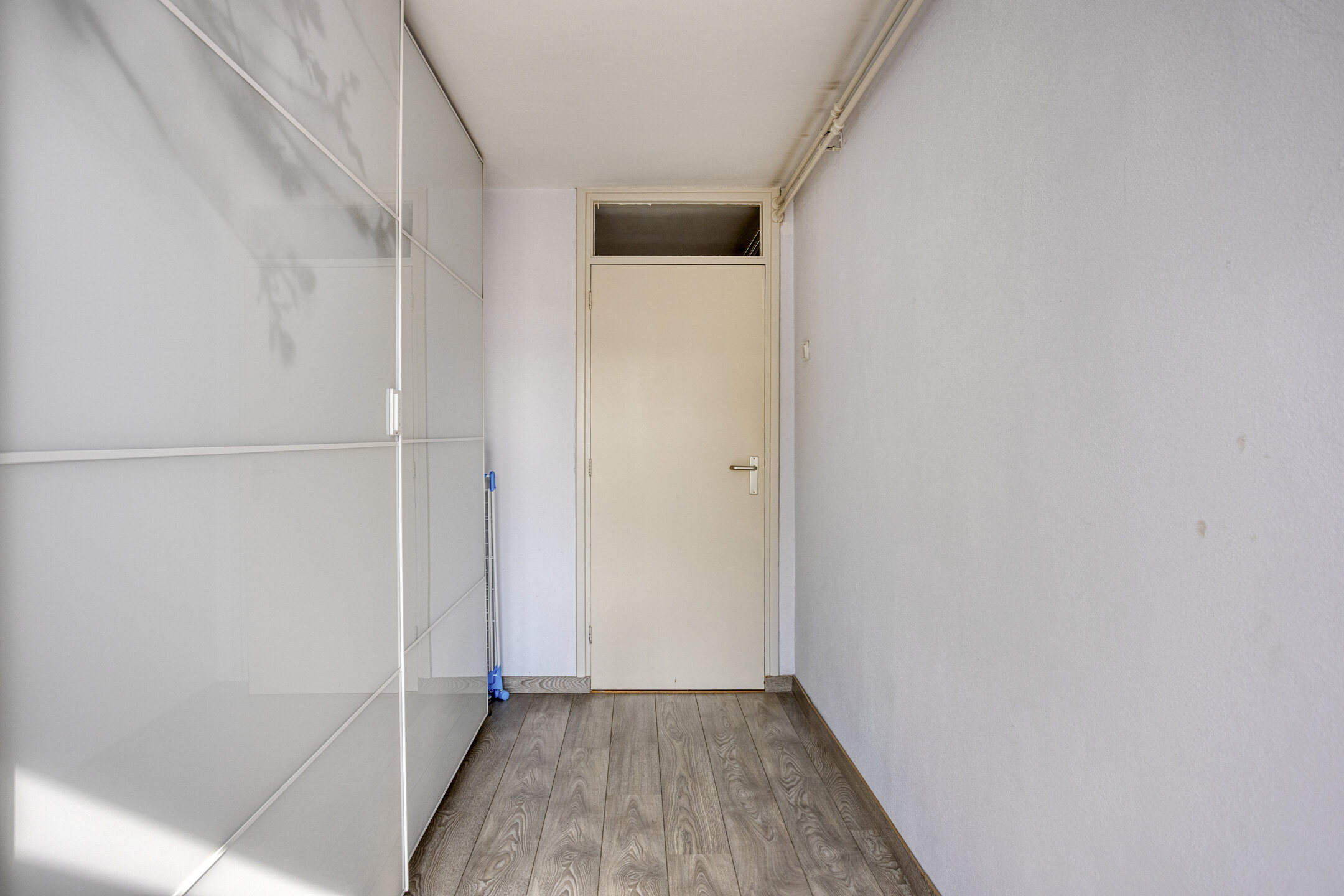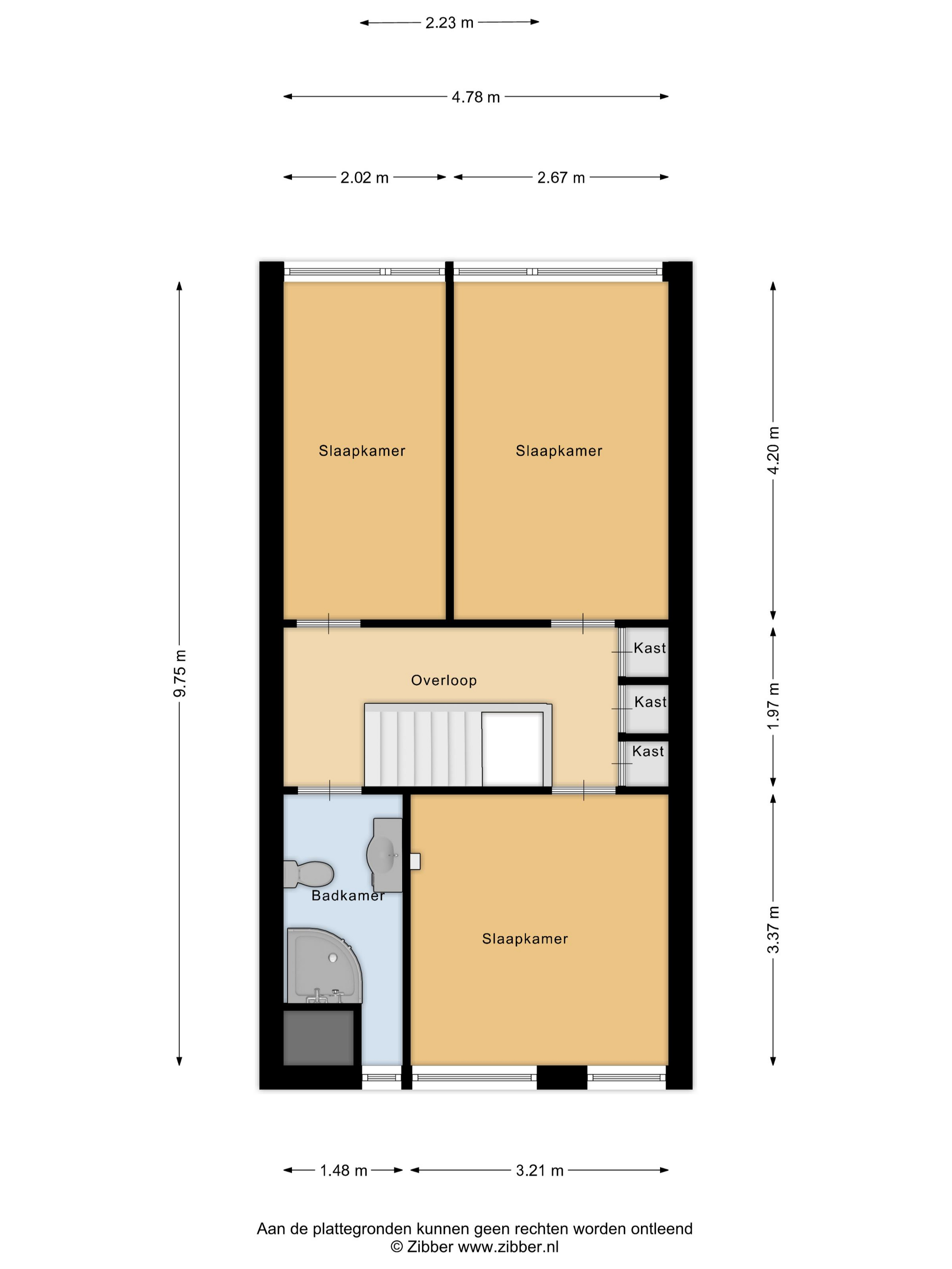 De overloop biedt toegang tot drie slaapkamers, waarvan twee aan de voorzijde en één aan de achterzijde van de woning. Alle kamers zijn voorzien van rechte wanden, waardoor de ruimte optimaal benut kan worden. De badkamer is uitgerust met een douche, wastafel met wastafelmeubel en tweede toilet. Daarnaast is de overloop voorzien van een kastenwand voor extra opbergruimte.