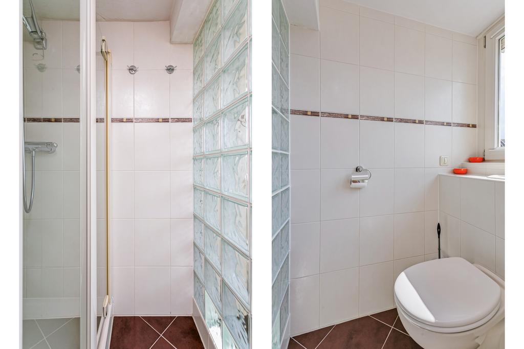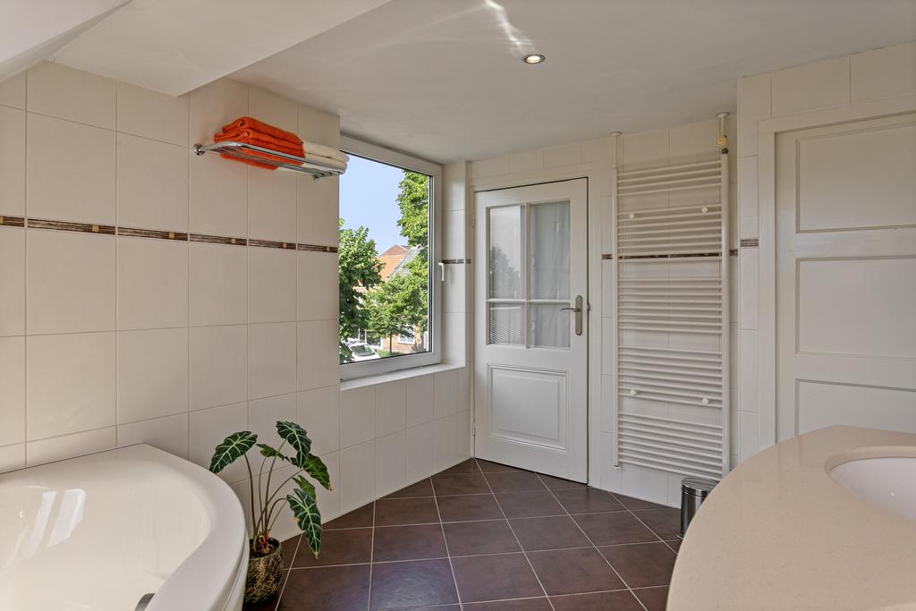 De trapopgang in de entree geeft toegang tot de overloop van de eerste verdieping. Via de overloop zijn de twee slaapkamers en de royale badkamer te bereiken. Beiden slaapkamers zijn voorzien van rolluiken, laminaat en beschikken over voldoende ruimte. De badkamer is zeer ruim te noemen en beschikt onder andere over een dubbele wastafel met meubel, inloopdouche, handdoekradiator, ligbad en toilet. Achter de deur bevindt zich de CV ketel. Doormiddel van een vlizotrap is de bergzolder bereikbaar.