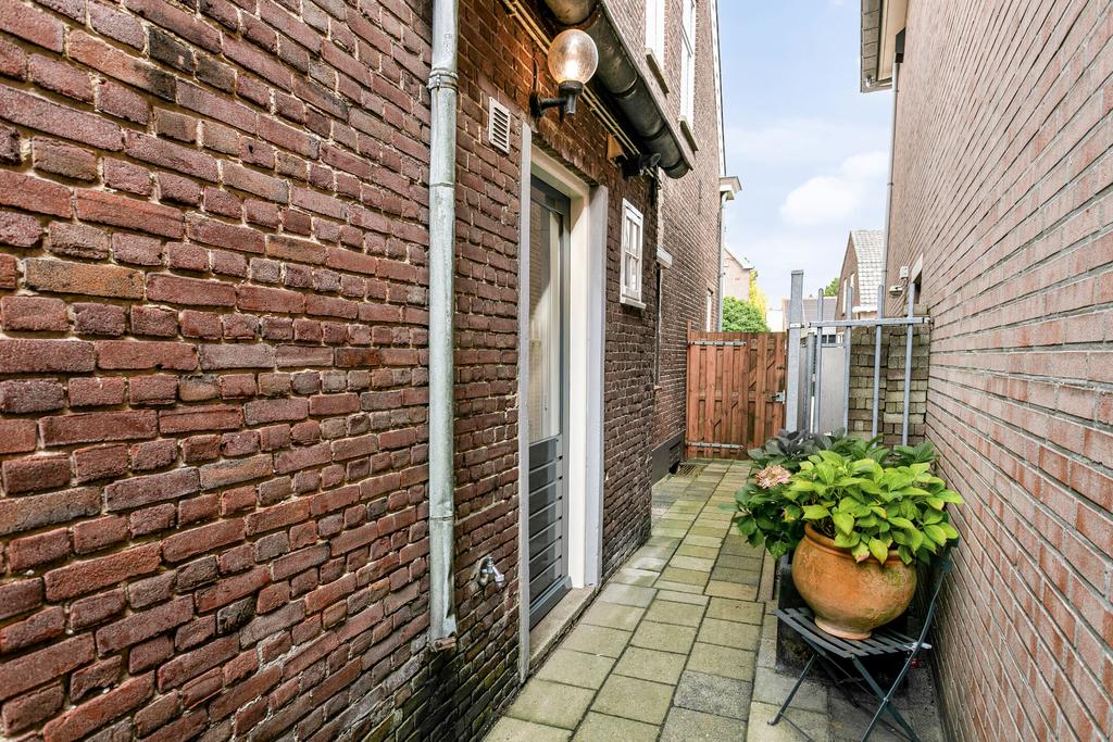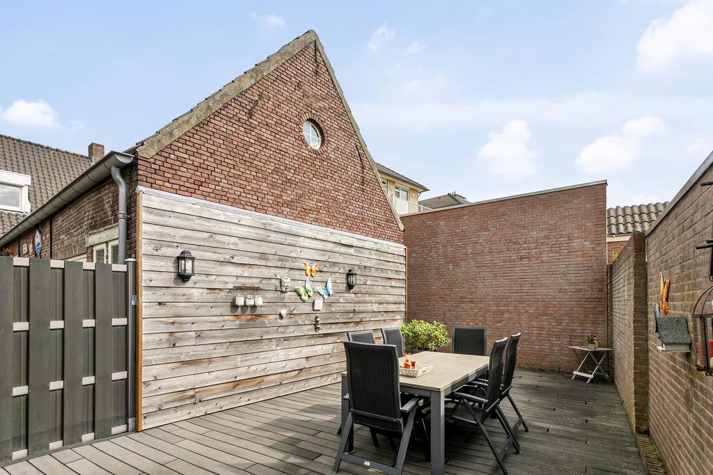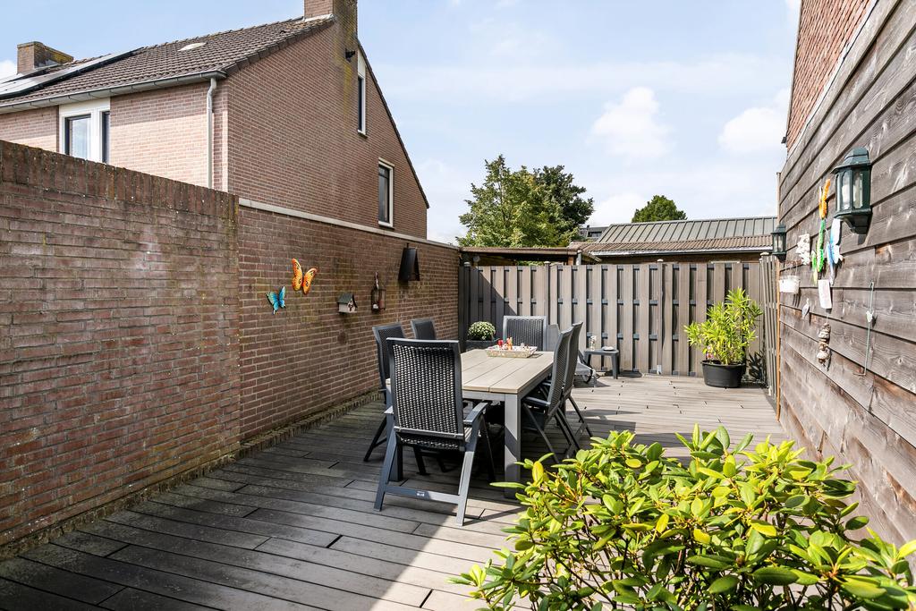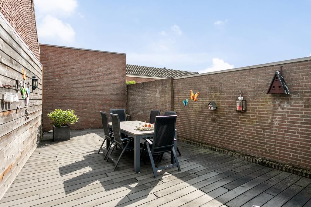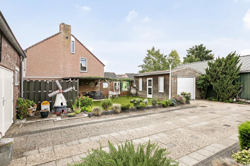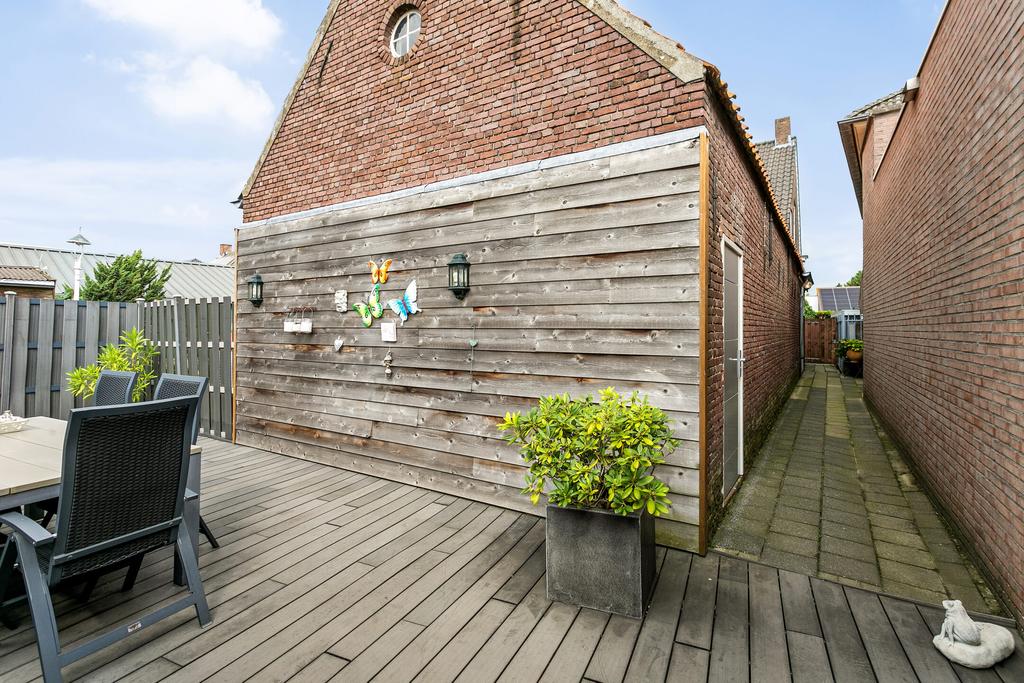 De tuin is vanuit de berging die naast de keuken gelegen is bereikbaar. Het perceel beschikt over een achterom en een grote schuur welke voorzien is van elektra en verlichting. De mogelijkheid tot het stallen van een auto en meerdere fietsen is een fijne bijkomstigheid in combinatie met de zolder waarover de schuur beschikt. Het terras achter de schuur is een fijne plek om te vertoeven omdat deze op het zuiden georiënteerd is en dus over voldoende zon beschikt. Ook beschikt dit zitgedeelte over veel privacy.
