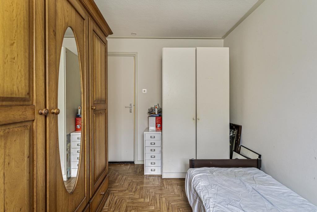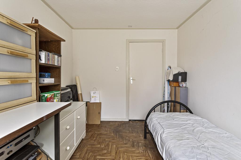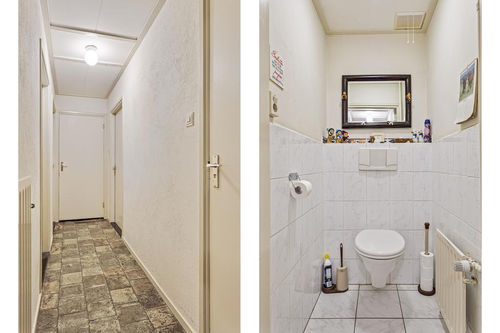 Het toilet bevindt zich aan het einde van de hal en is voorzien van een hangcloset. Daarnaast is de eerste slaapkamer gelegen van respectievelijk 10 vierkante meter, de tweede slaapkamer is de meest compacte slaapkamer met 8 vierkante meter. Aan het einde van de hal bevindt zich de hoofdslaapkamer welke tevens te bereiken is vanuit de entree, hier is voldoende ruimte aanwezig voor een tweepersoonsbed, nachtkastjes en een grote kast. De badkamer is voorzien van een ligbad met douche, wastafel met meubel en een aansluiting voor het witgoed.