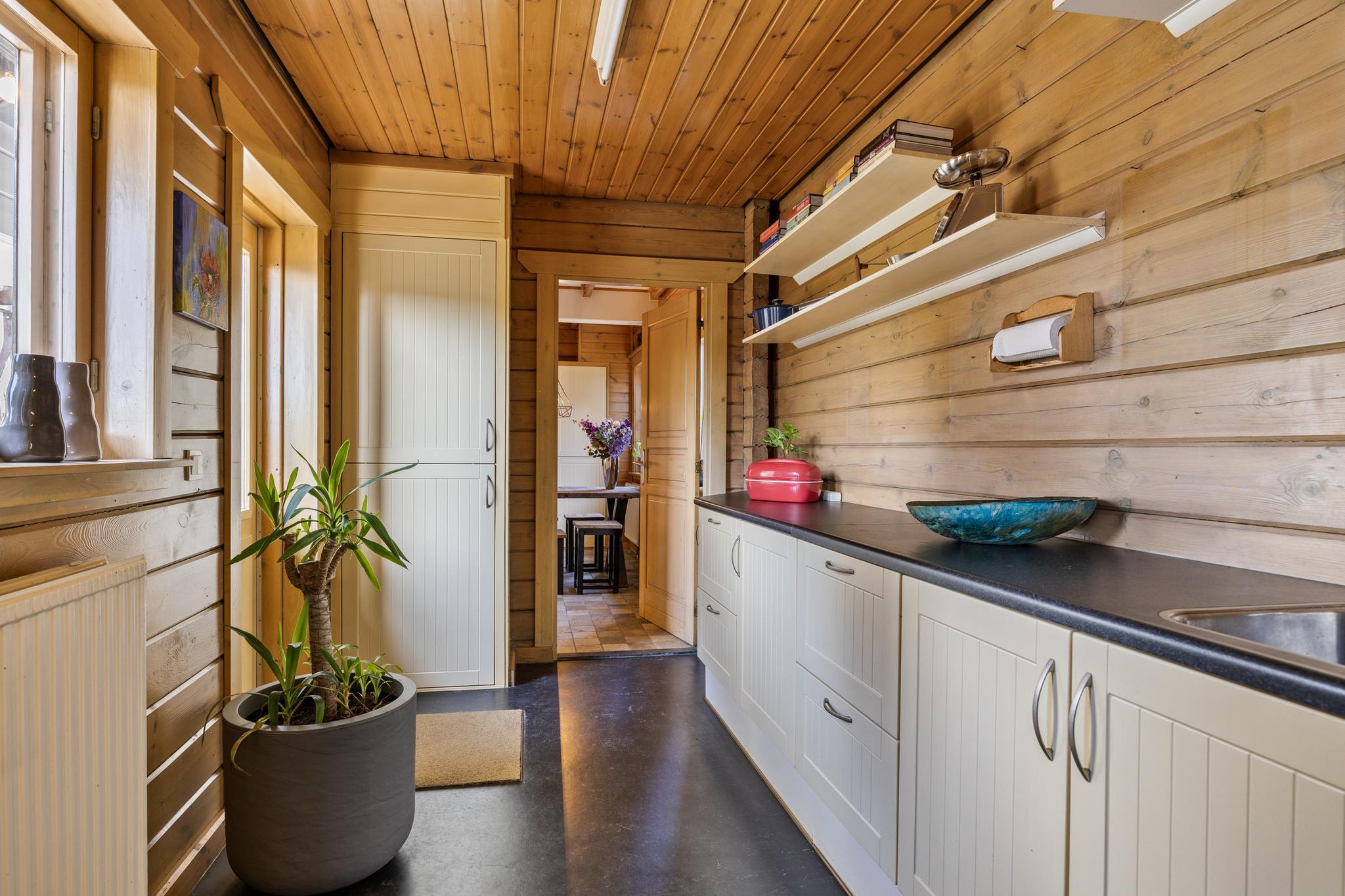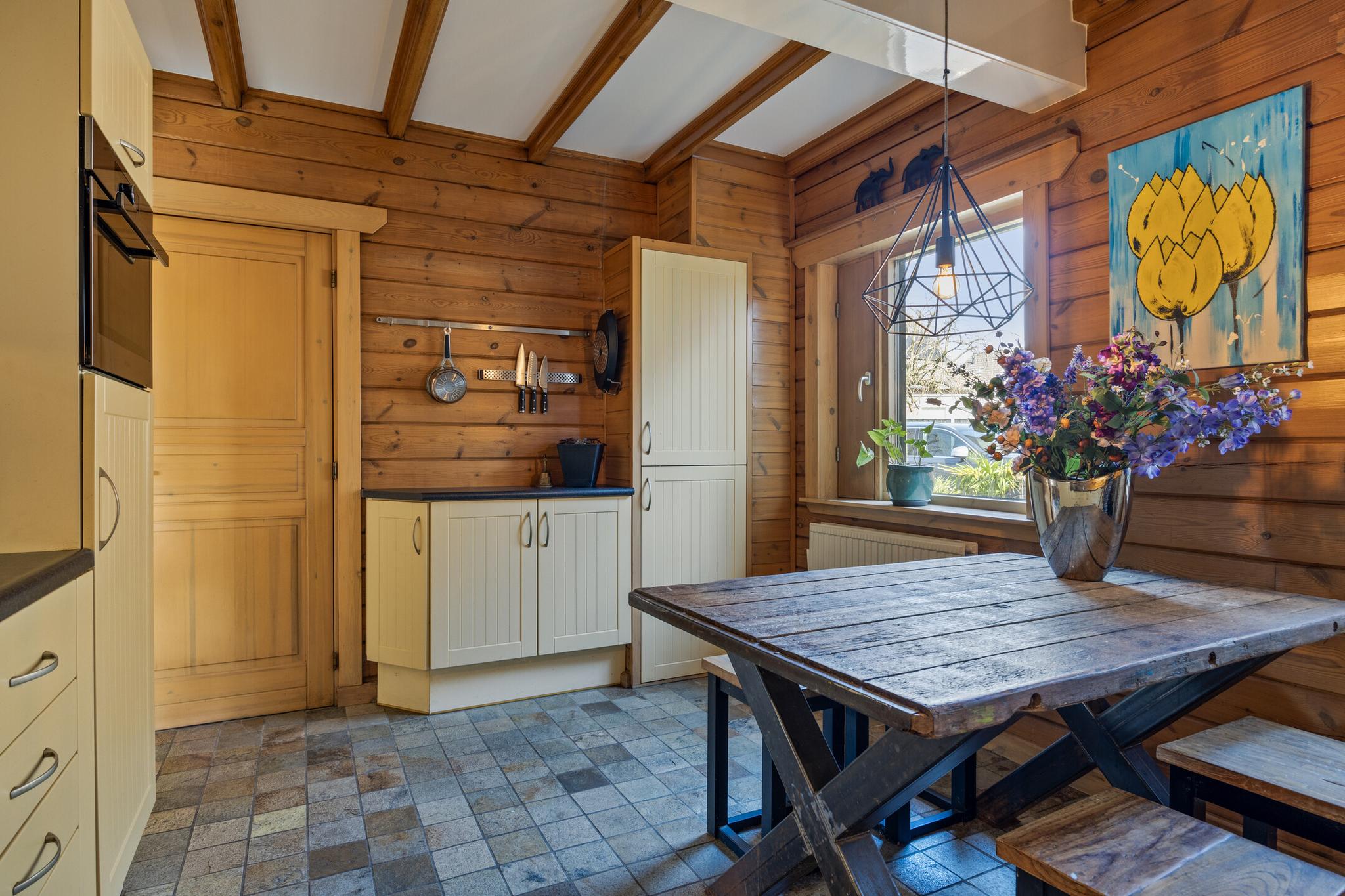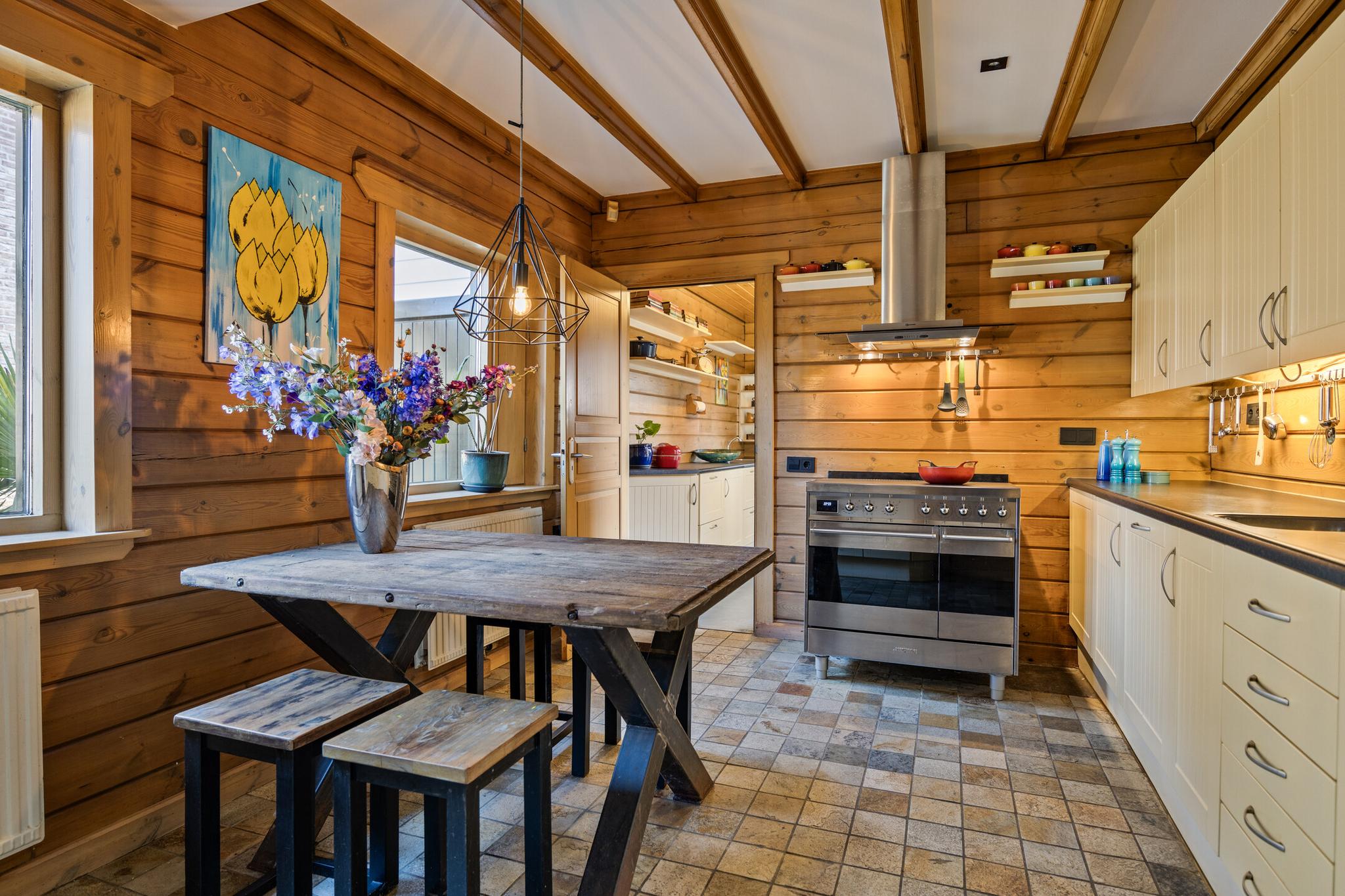 Vanuit de hal is ook de keuken te bereiken. Deze functionele en lichte ruimte is van alle gemakken voorzien. De keuken is uitgerust met diverse inbouwapparatuur, waaronder een recent vernieuwde combi-oven (2024), vaatwasser, koelkast, afzuigkap en spoelbak met Quooker kraan. Daarnaast is er een losstaand fornuis aanwezig met een geïntegreerde oven. Dankzij de grote raampartijen komt er veel natuurlijk licht binnen, wat de ruimte nog aangenamer maakt. Er is bovendien voldoende plek voor een eettafel met stoelen, zodat je in alle comfort kunt genieten van je maaltijden.