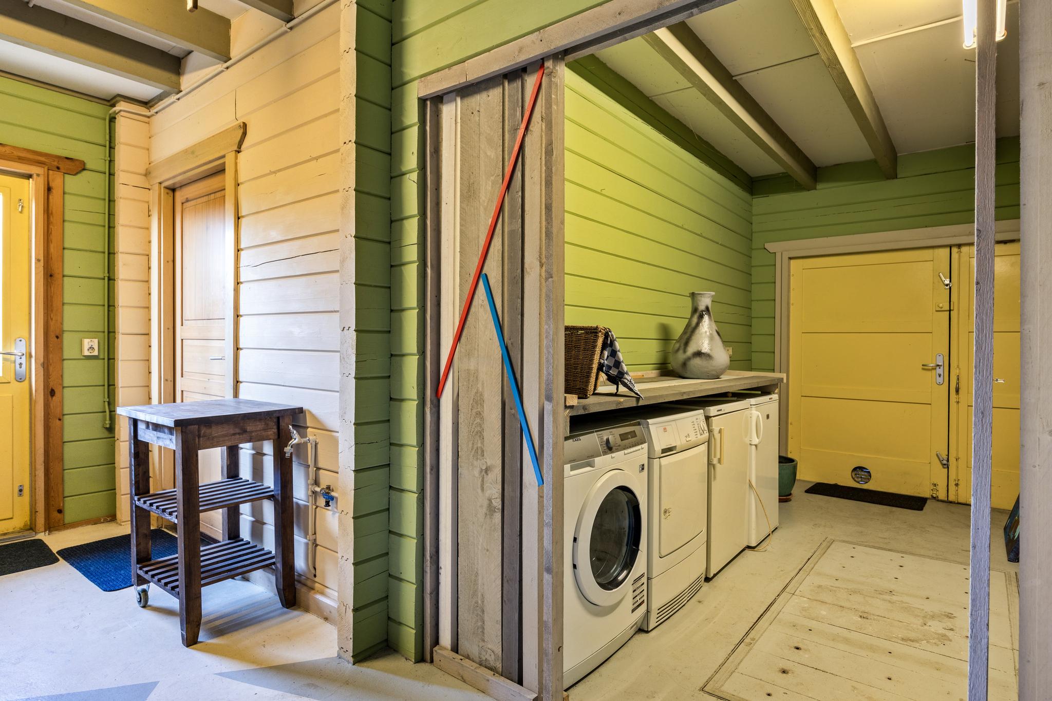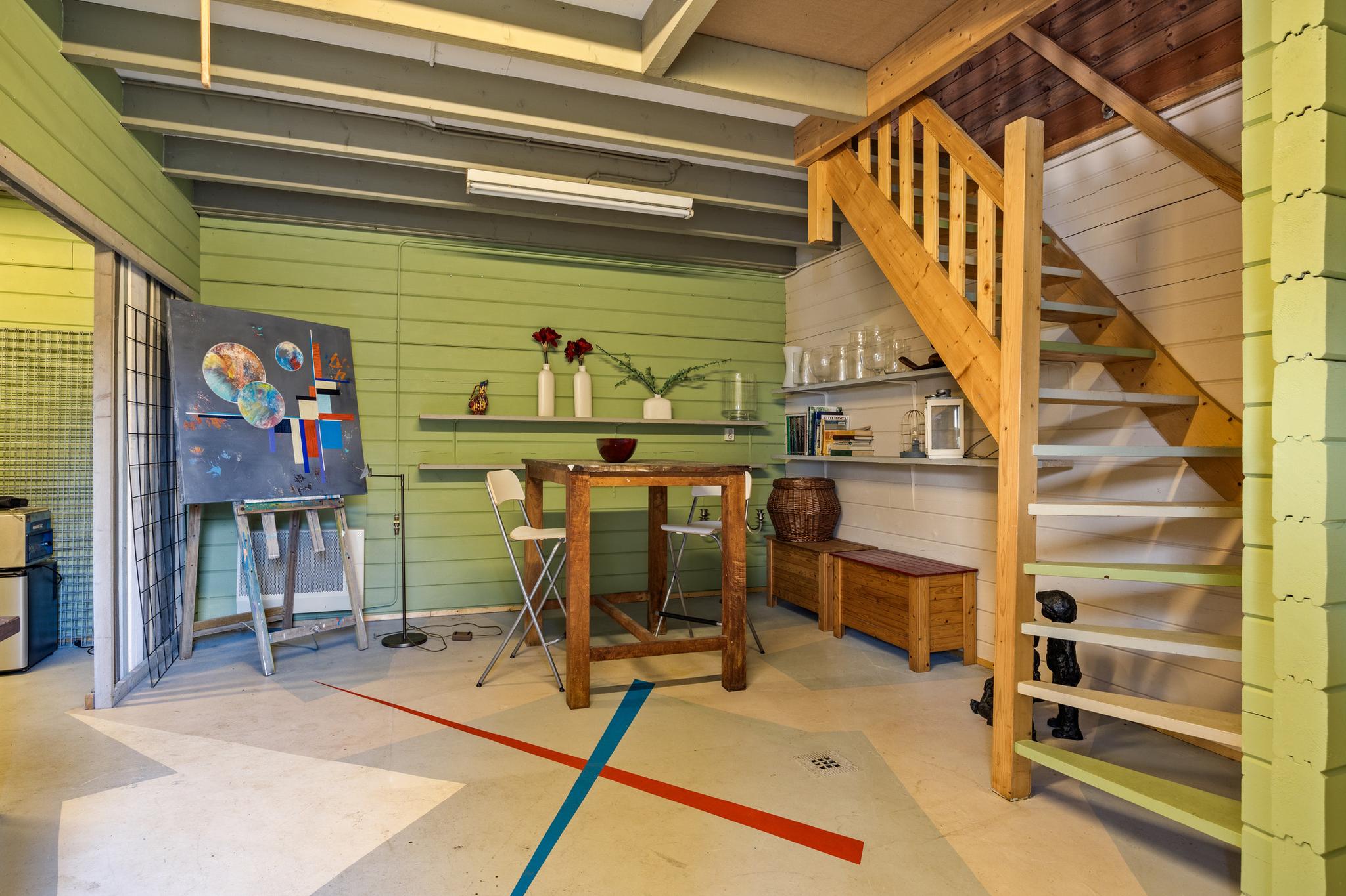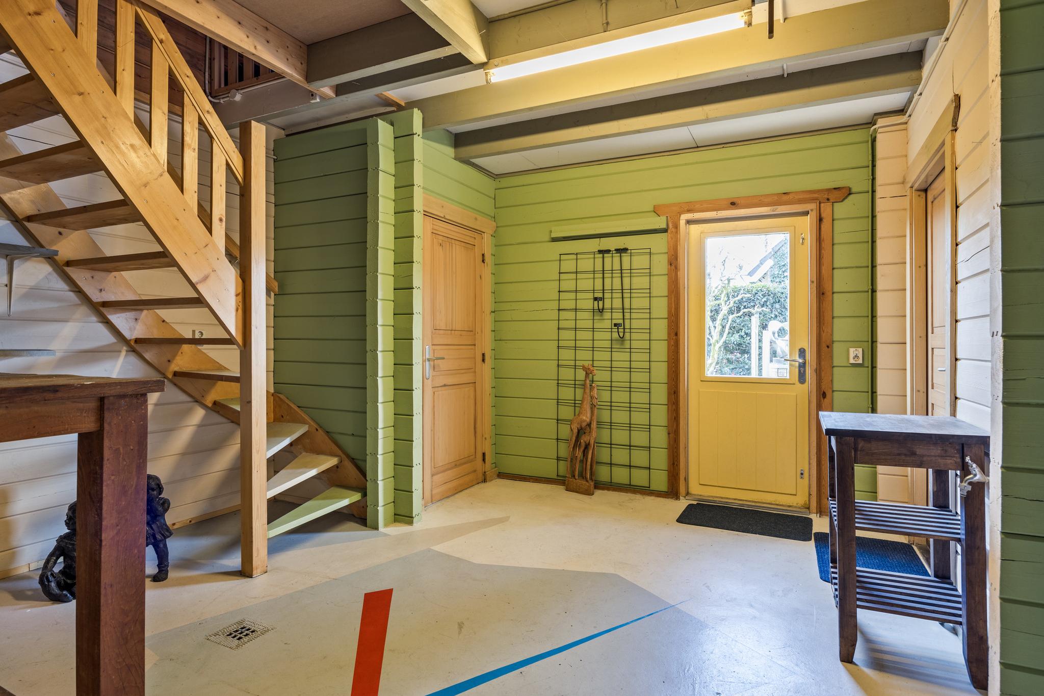 Vanuit de keuken is de bijkeuken bereikbaar, gelegen aan de achterzijde van de woning. Deze praktische ruimte biedt veel opbergruimte dankzij de vele keukenkastjes en beschikt over een spoelbak. De bijkeuken vormt de doorgang naar de achterkamer, die volop mogelijkheden biedt voor verschillende toepassingen. Momenteel wordt de ruimte gebruikt als atelier en opslagruimte, maar het kan eenvoudig worden ingericht naar eigen wens, of het nu voor werk, hobby's of als extra woonkamer dient. De achterkamer staat in directe verbinding met de garage, die eveneens een waardevolle toevoeging is aan het huis. In de garage bevinden zich de aansluitingen voor witgoedapparatuur, wat extra gemak biedt. De garage heeft houten openslaande deuren die uitgeven op de ruime oprit, wat zorgt voor gemakkelijke toegang. Bovendien biedt de garage de mogelijkheid om eventueel weer een voertuig droog te stallen, mocht dat gewenst zijn.