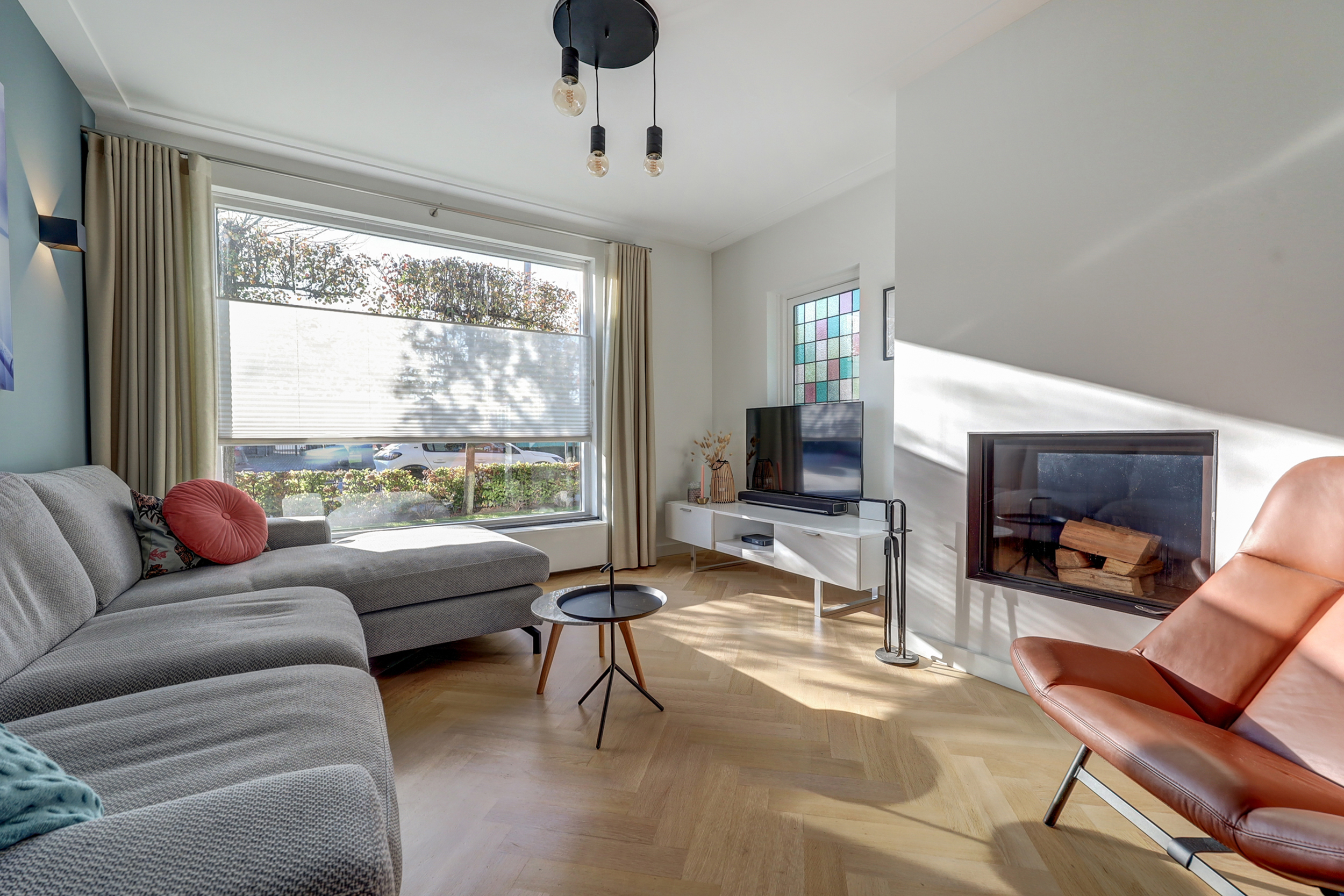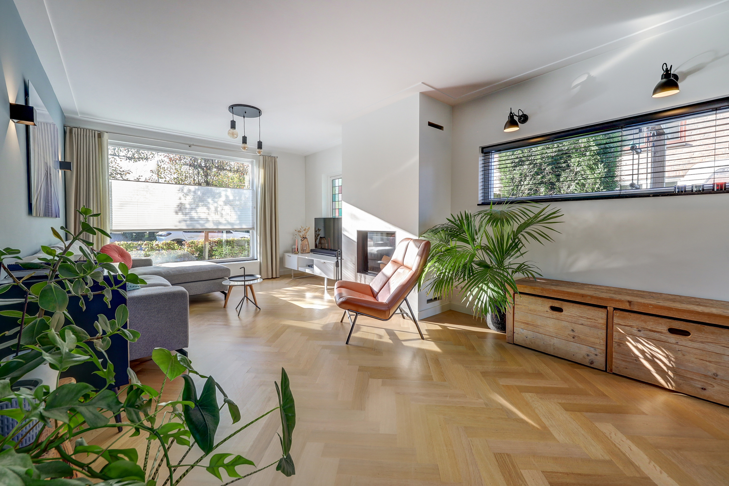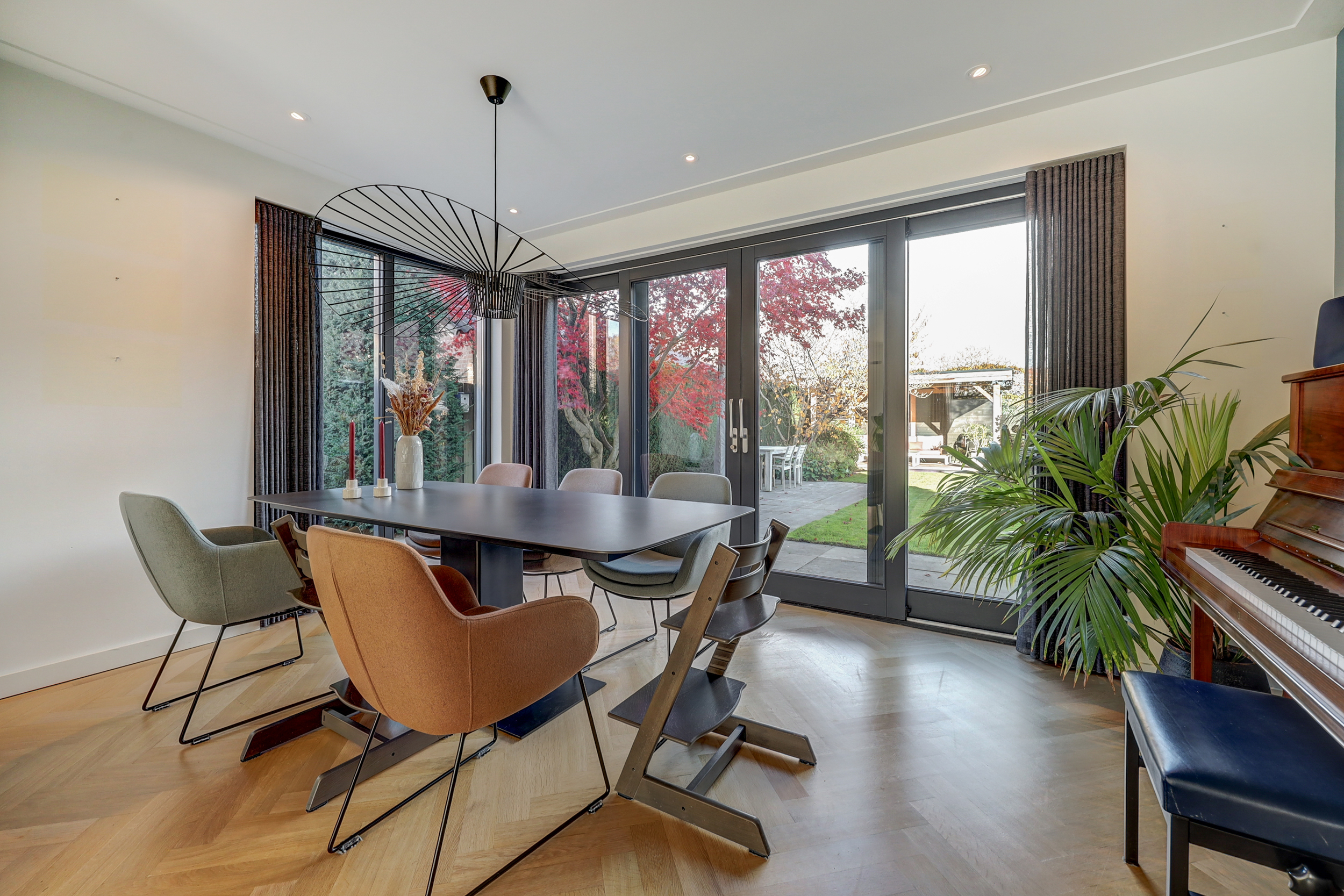De woonkamer ligt aan de voorzijde van de woning en voelt dankzij de grote ramen buitengewoon licht aan. Het glas-in-loodraam en de visgraatvloer dragen bij aan de warme en sfeervolle uitstraling. Verder naar achteren bevindt zich de grote uitbouw die is voorzien van een brede pui met dubbele tuindeuren. Door het vele glas is dit een heerlijke lichte ruimte die uitermate geschikt is als eetgedeelte.