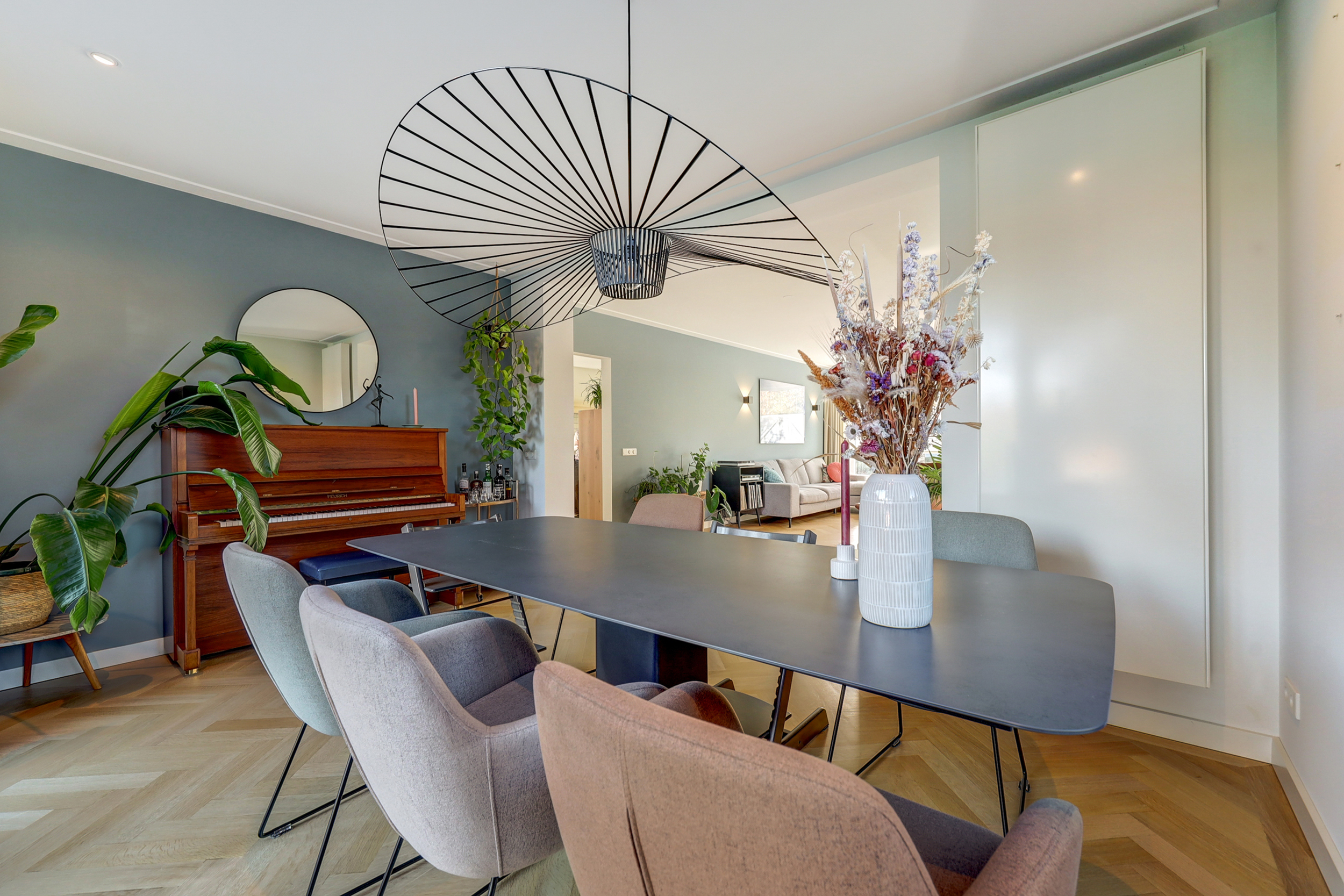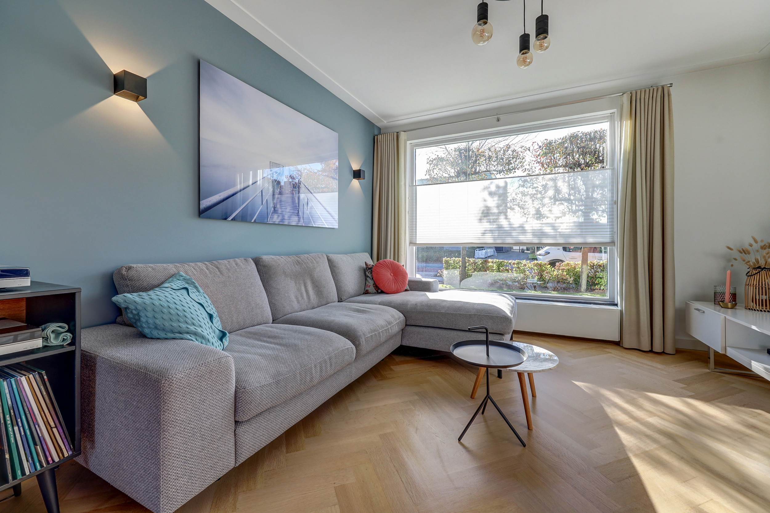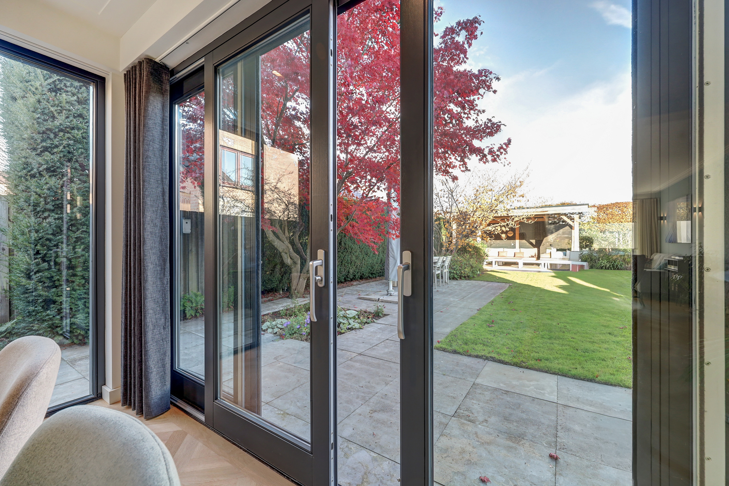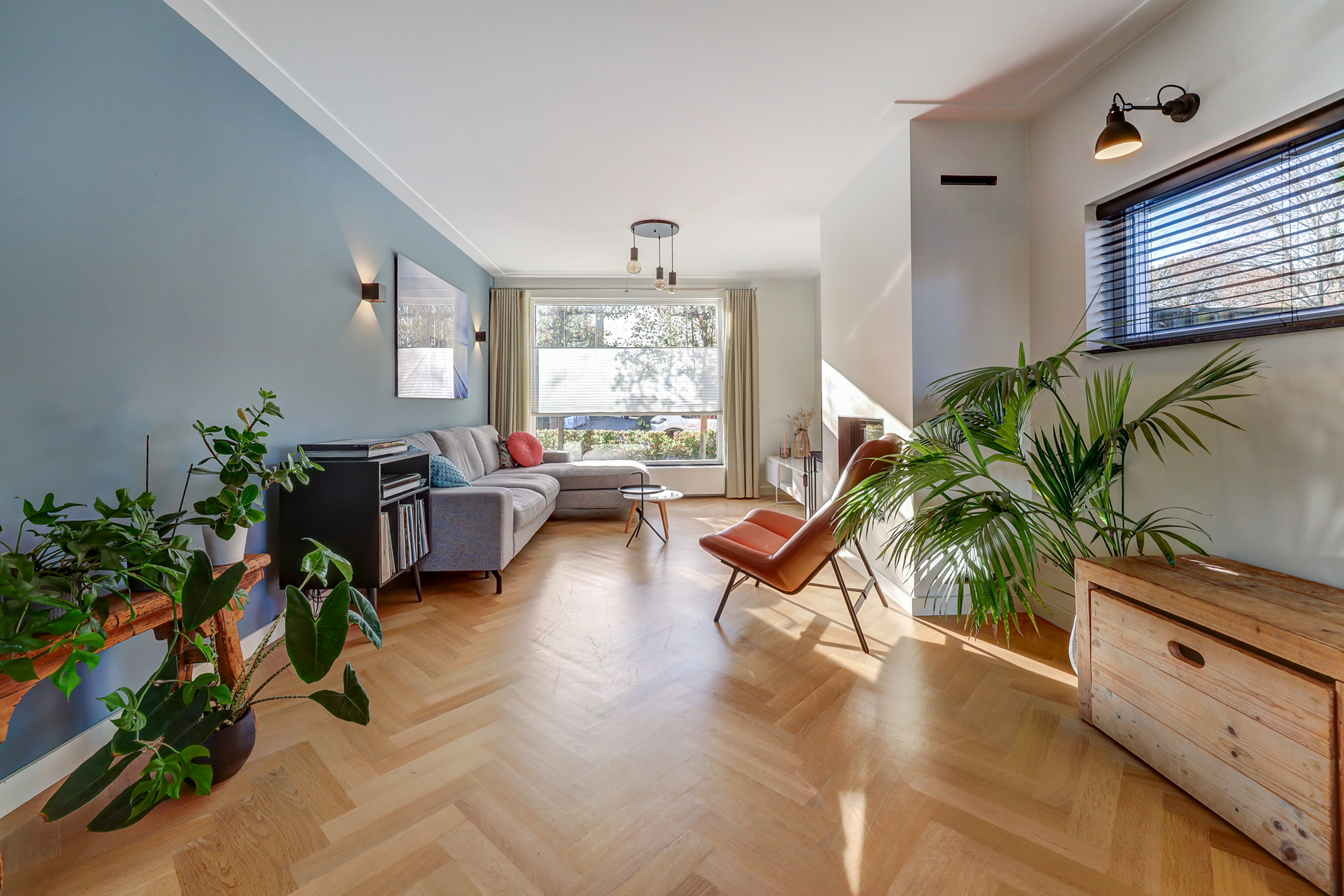De woonkamer ligt aan de voorzijde van de woning en voelt dankzij de grote ramen buitengewoon licht aan. Het glas-in-loodraam en de visgraatvloer dragen bij aan de warme en sfeervolle uitstraling. Verder naar achteren bevindt zich de grote uitbouw die is voorzien van een brede pui met dubbele tuindeuren. Door het vele glas is dit een heerlijke lichte ruimte die uitermate geschikt is als eetgedeelte.