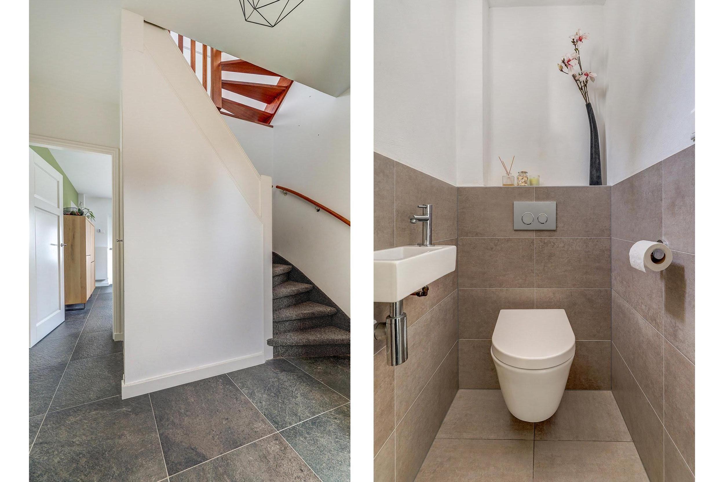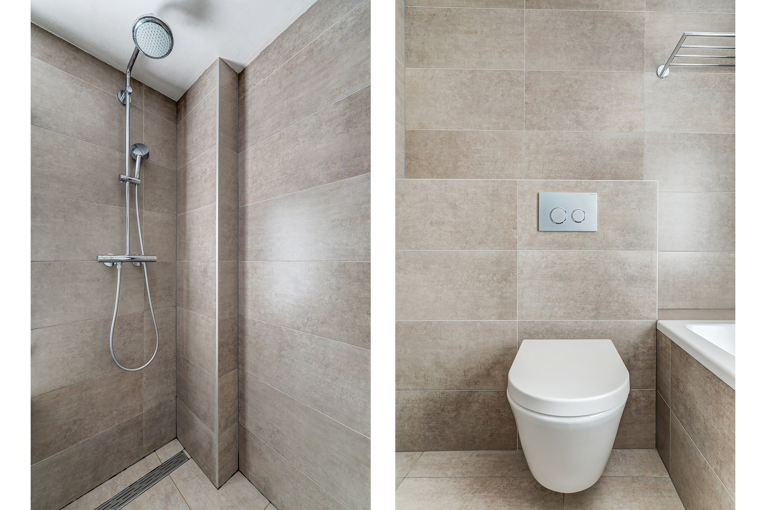Op de eerste verdieping ligt aan de achterzijde de royale hoofdslaapkamer. Deze kamer is bijzonder breed, heeft grote ramen en biedt meer dan voldoende ruimte voor een tweepersoonsbed en een grote kledingkast. Daarnaast zijn er op deze verdieping nog twee slaapkamers die perfect te gebruiken zijn als kinderkamer, logeerkamer, kantoor of hobbyruimte. De badkamer is modern afgewerkt en volledig in dezelfde tegelstijl uitgevoerd. De ruimte beschikt over een ligbad, een inloopdouche, een dubbele wastafel met meubel en een toilet.