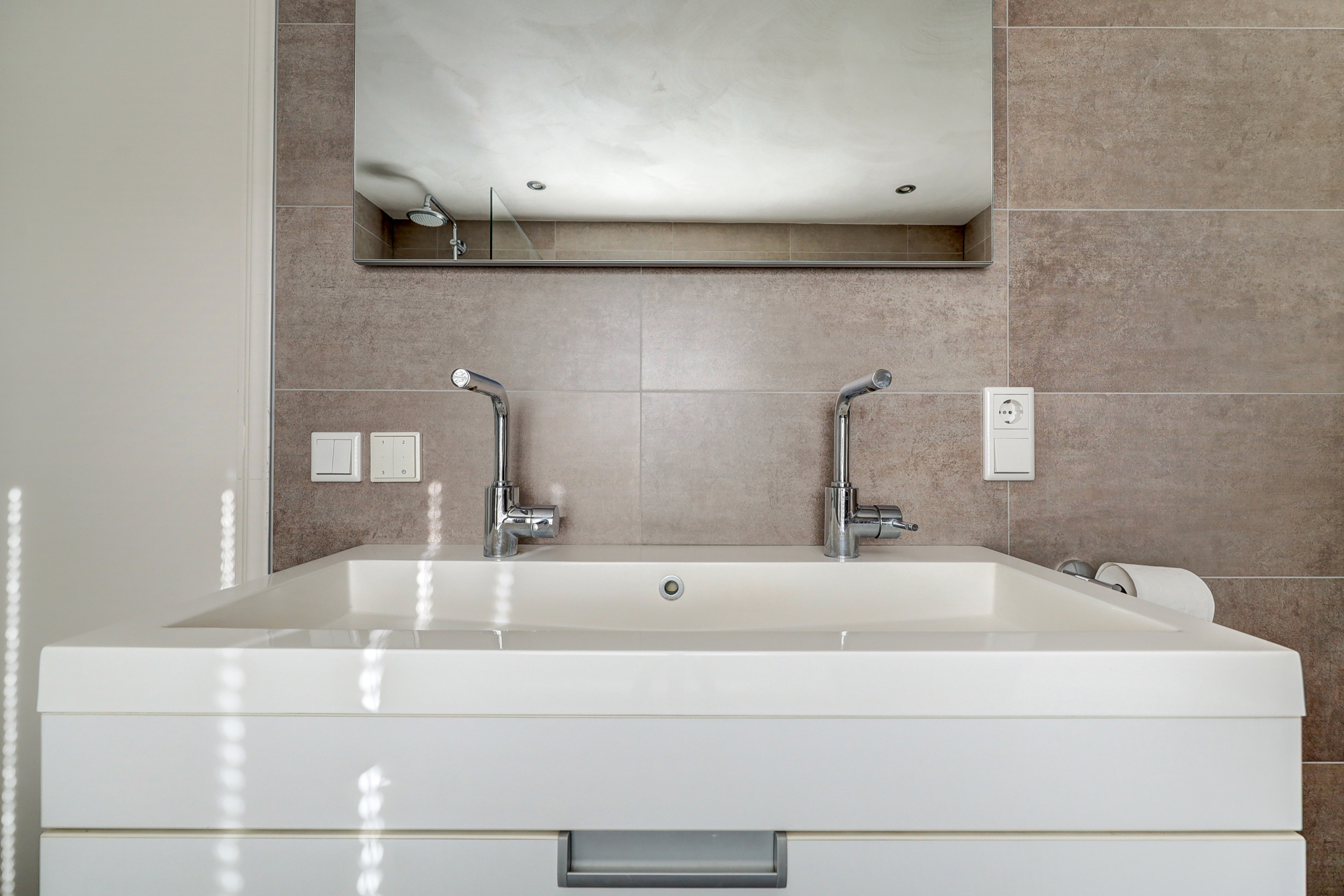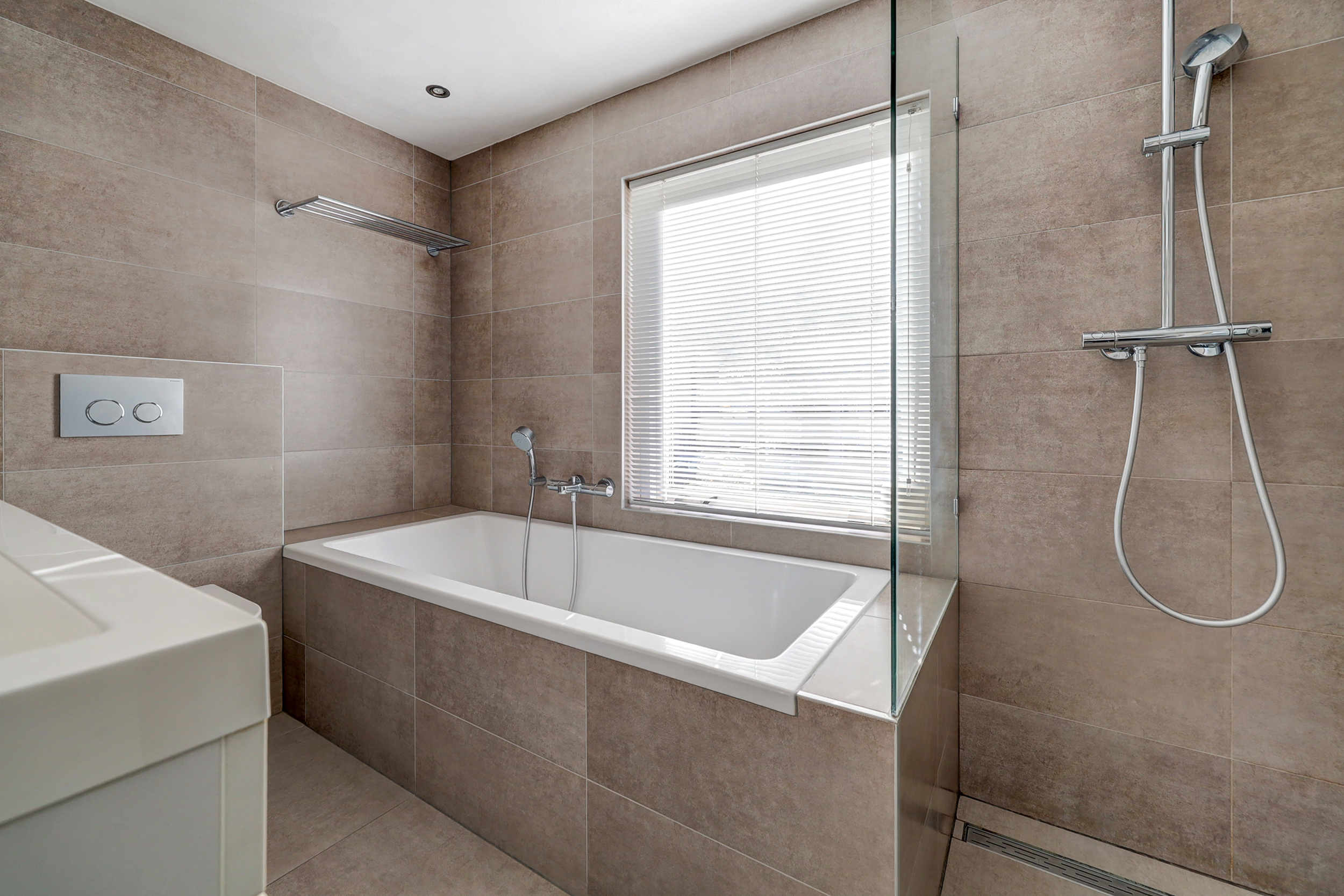 - Moderne badkamer met ligbad, inloopdouche, dubbele wastafel en toilet;