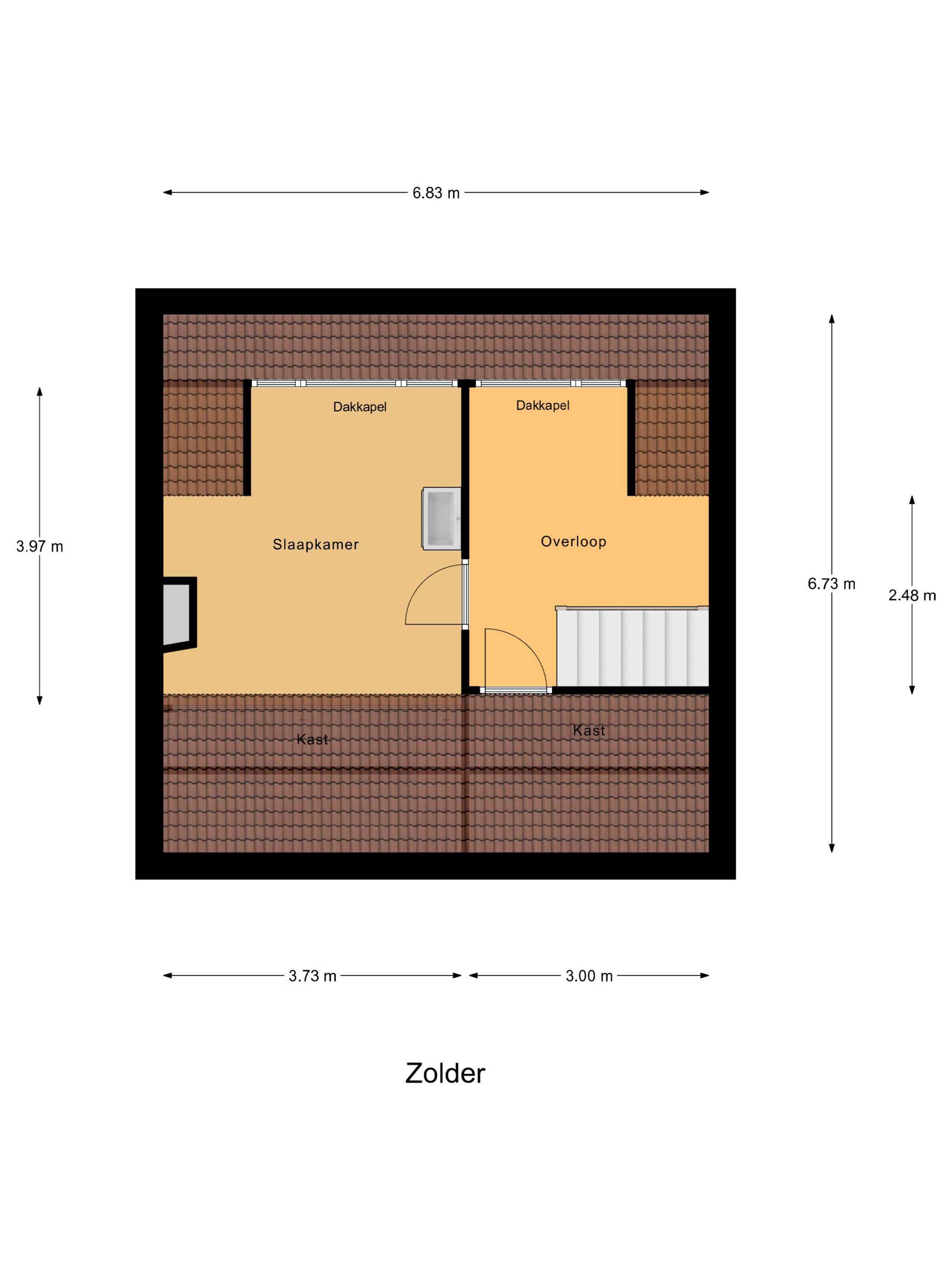 Een vaste trap op de overloop leidt naar de tweede verdieping. Hier bevindt zich eerst een overloop en vervolgens een ruime vierde slaapkamer die dankzij de dakkapel over de gehele breedte verrassend veel licht en ruimte biedt. Onder de schuine wanden is praktische bergruimte gecreëerd.