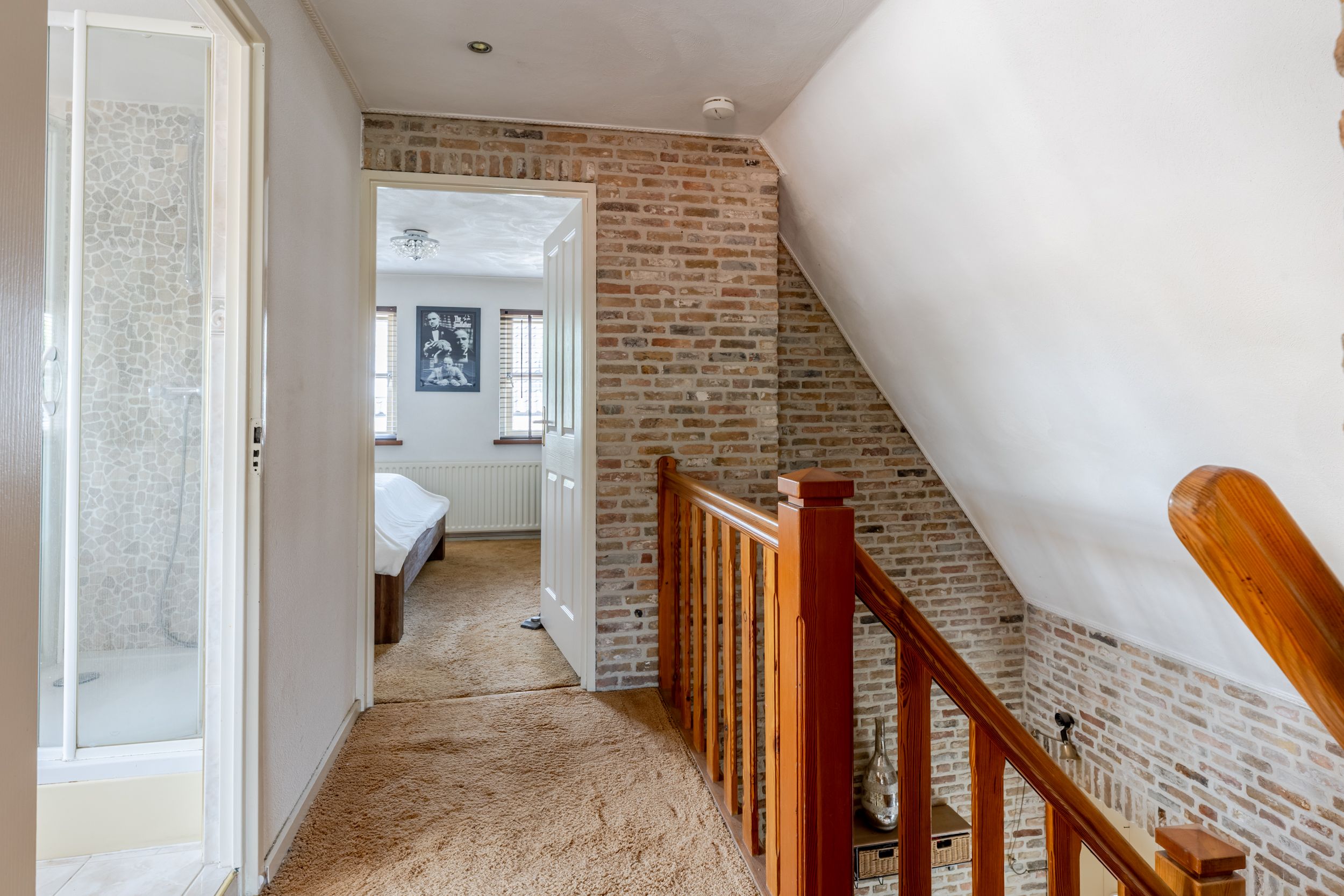Via de trap in de entree kom je op de ruime overloop van de eerste verdieping. Hier vind je drie royale slaapkamers, stuk voor stuk groot genoeg om een tweepersoonsbed en een kledingkast te plaatsen. Daarnaast beschikken de kamers over handige inbouwkasten voor extra bergruimte. Ook is er op deze verdieping een badkamer aanwezig. Dankzij het dakkapel is de badkamer verrassend ruim en licht. De badkamer is voorzien van een ligbad, toilet, wastafel met meubel en een aparte douche. Een complete verdieping met volop leefcomfort.