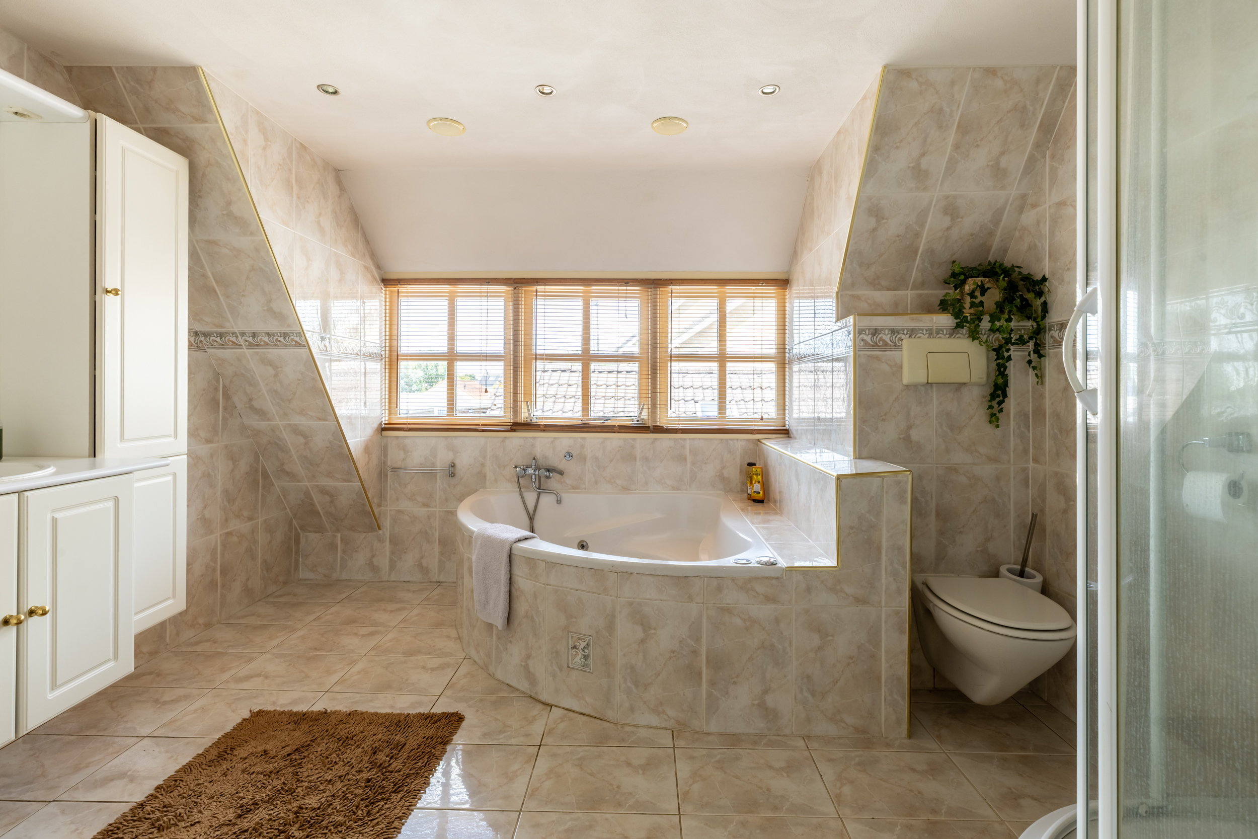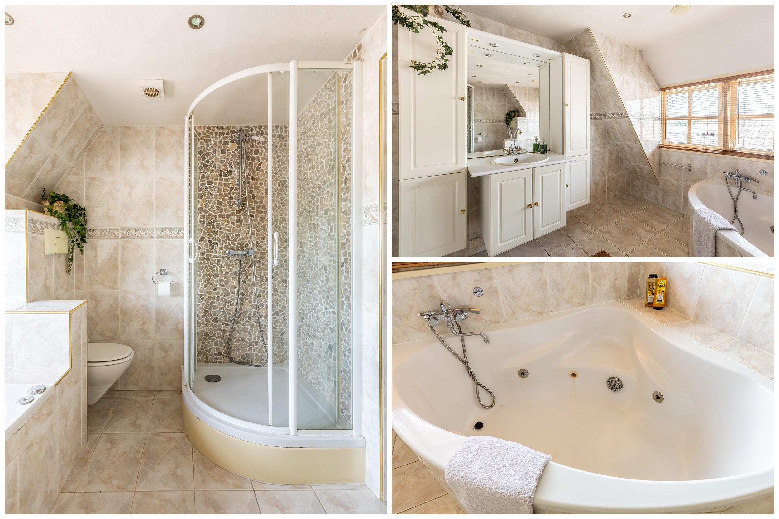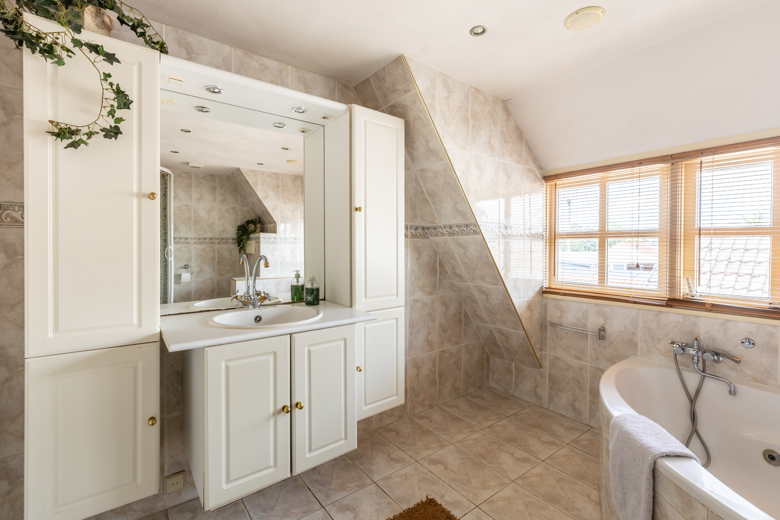 - Badkamer met ligbad, douche, toilet en wastafelmeubel, extra ruim dankzij dakkapel