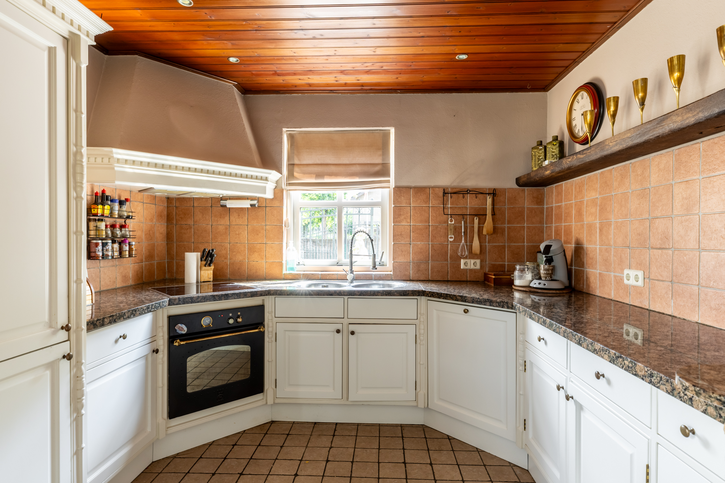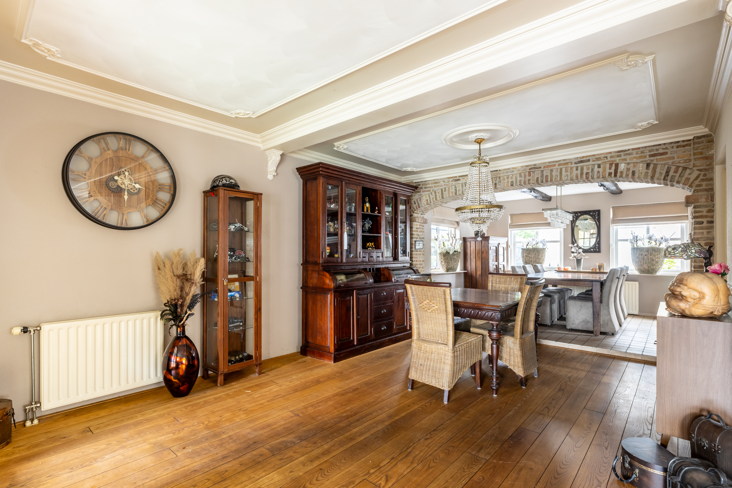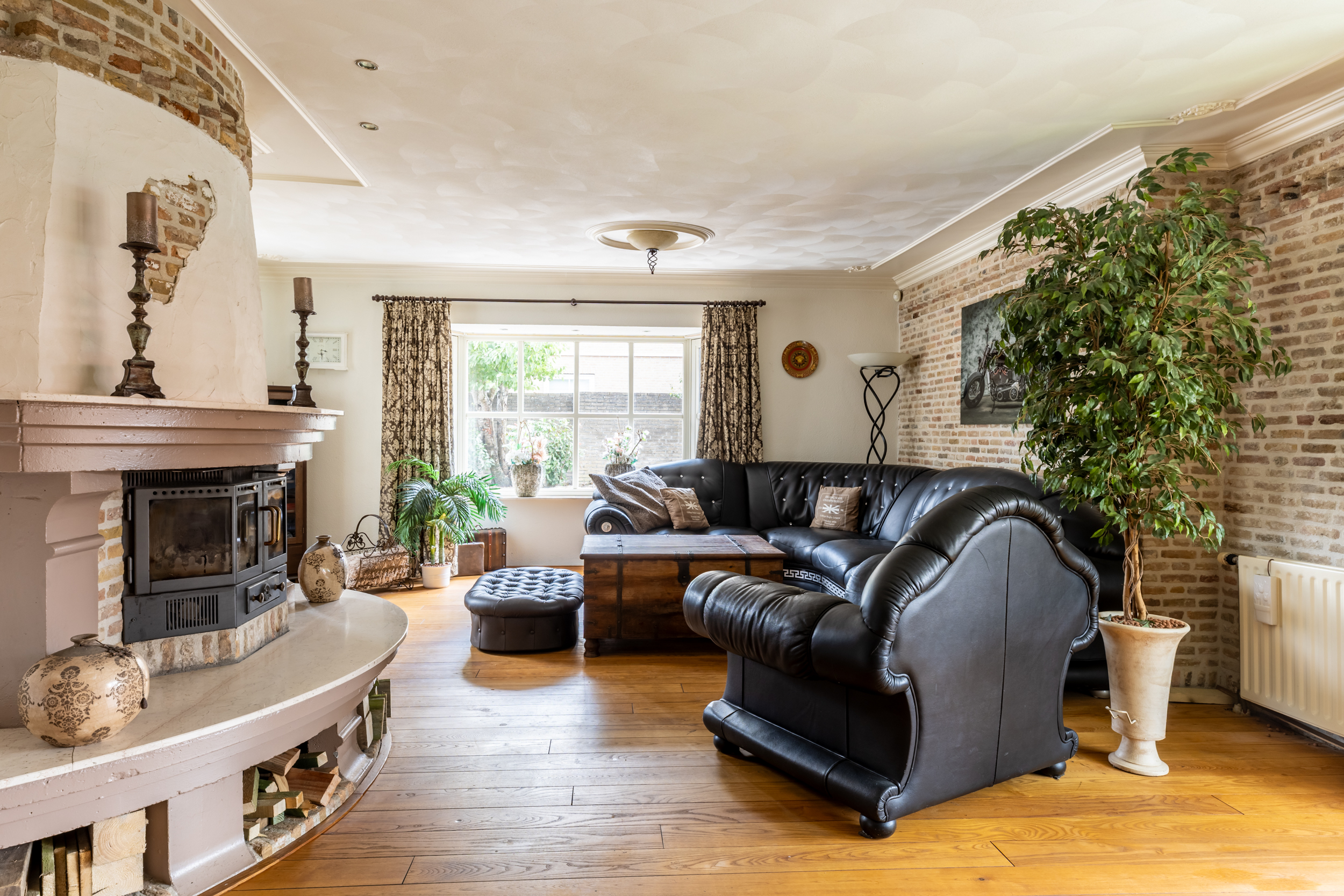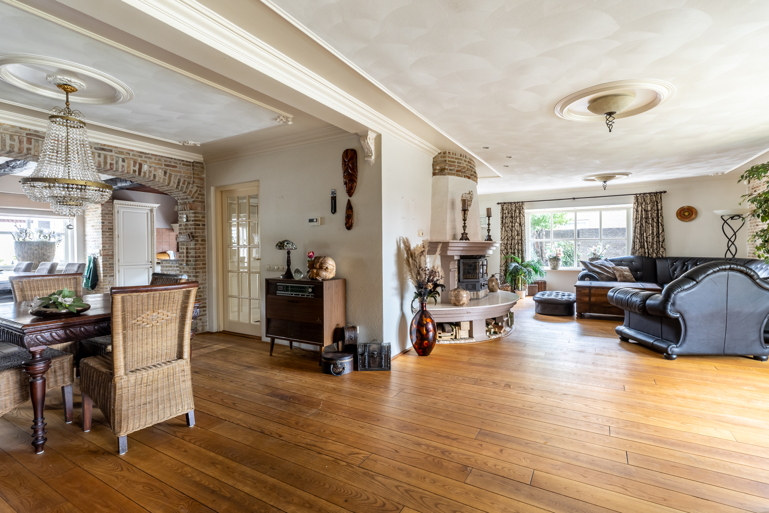 - Royale woonkamer in L-vorm met sfeervolle erker, open haard en dubbele tuindeuren naar de tuin