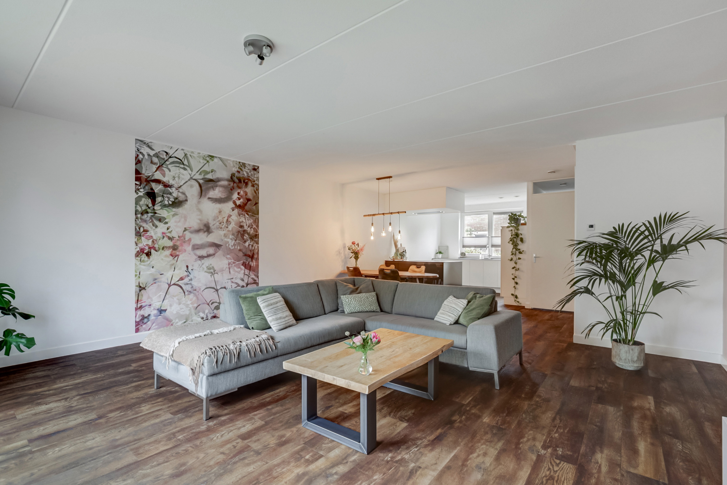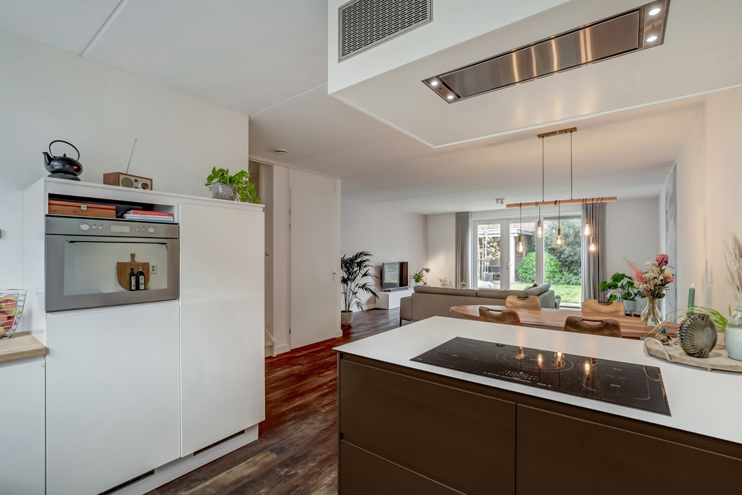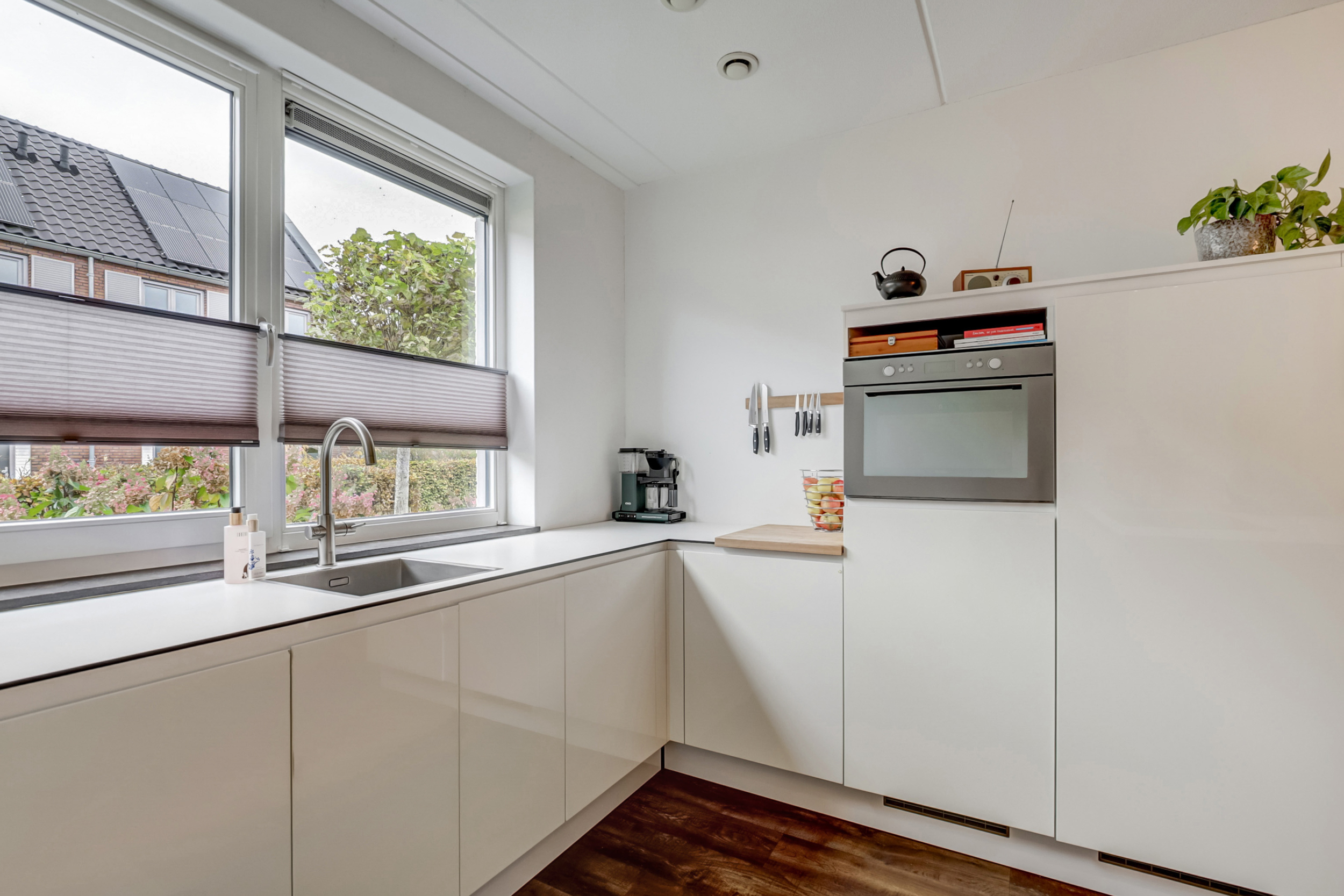 Parkeer de auto gemakkelijk op je eigen oprit en betreed de woning via de voordeur. In de entreehal vind je de meterkast, het toilet en toegang tot de woonkamer. De woonkamer is heerlijk ruim, mede dankzij de royale uitbouw waardoor je hier volop extra leefruimte hebt voor een gezellige zithoek en eettafel. Via de dubbele tuindeuren loop je zo de zonnige achtertuin in, ideaal voor een zomerse dag. De praktische trapkast biedt bovendien extra bergruimte. Aan de voorzijde van de woning bevindt zich de moderne keuken, uitgevoerd in een L-opstelling met een kookschiereiland met inductieplaat. De keuken is voorzien van alle gemakken, waaronder een vaatwasser, combi-oven, koelkast, vriezer en een kokend water kraan. De gehele begane grond is afgewerkt met vloerverwarming.