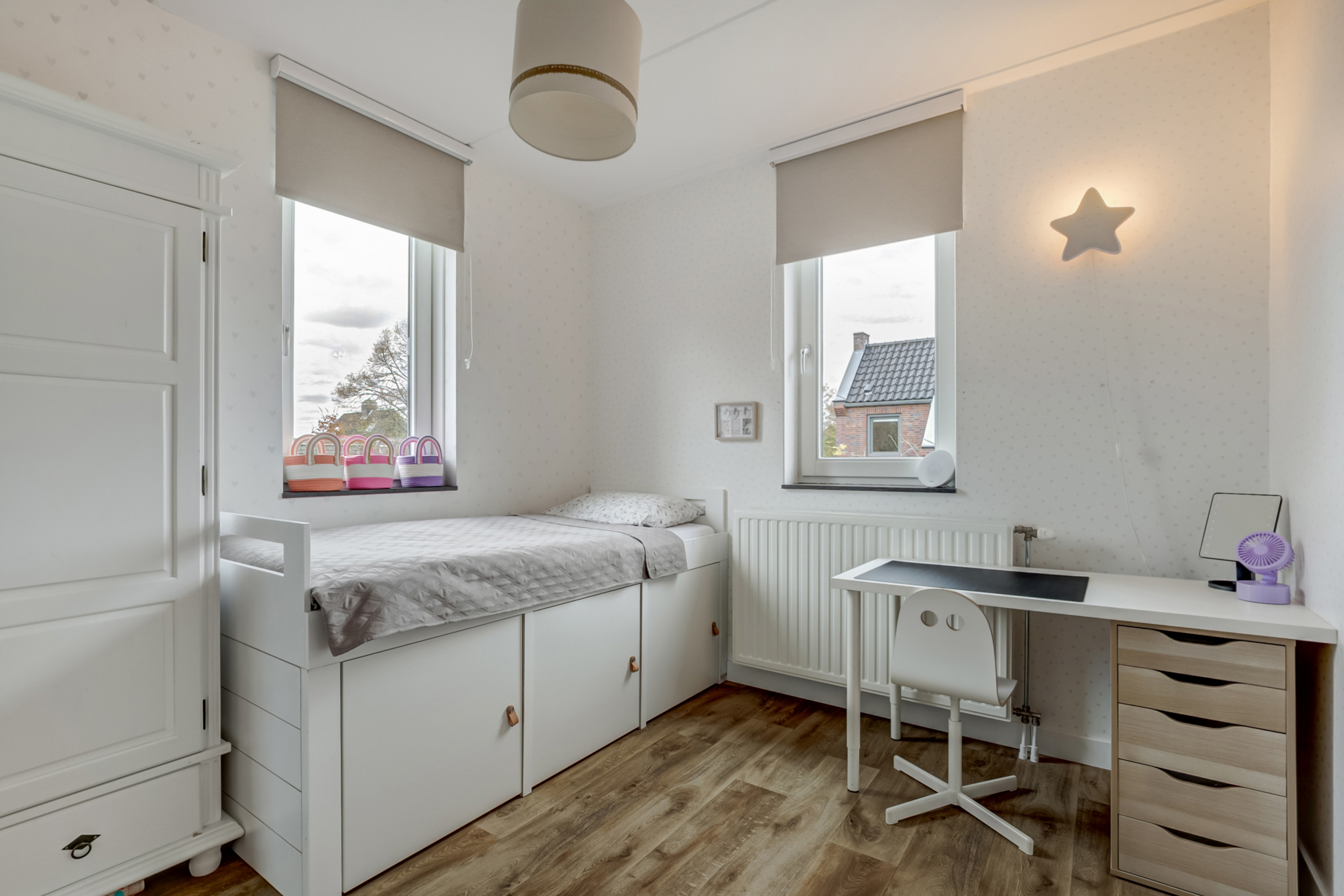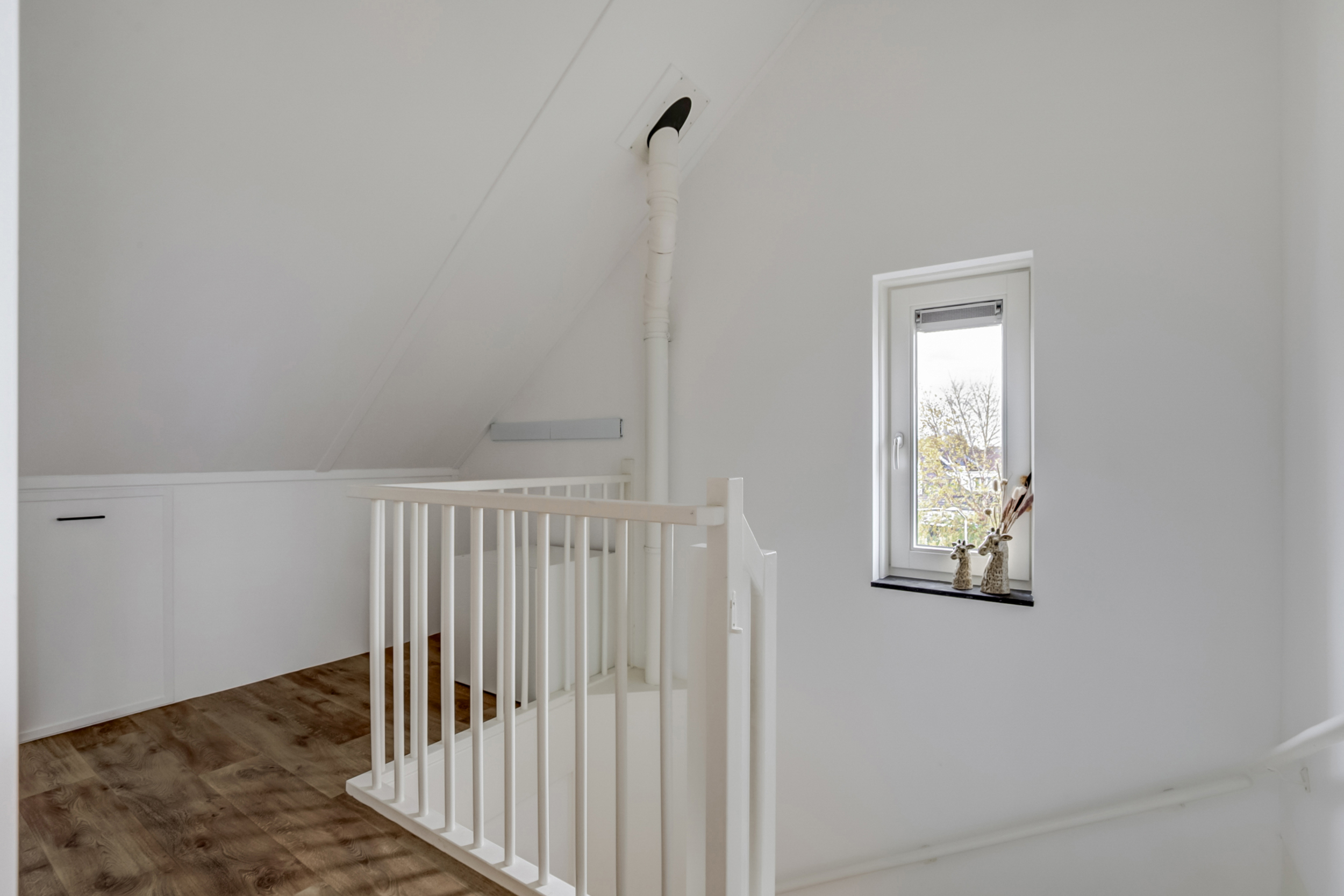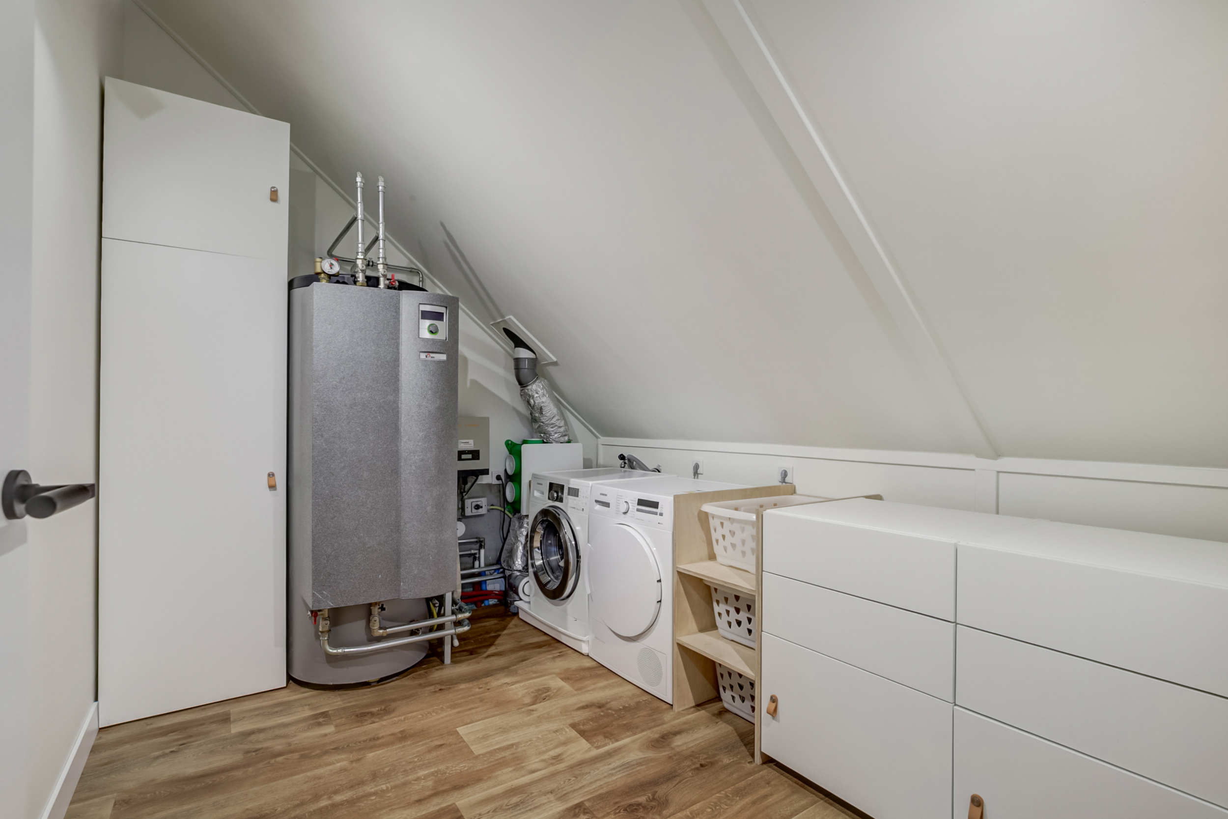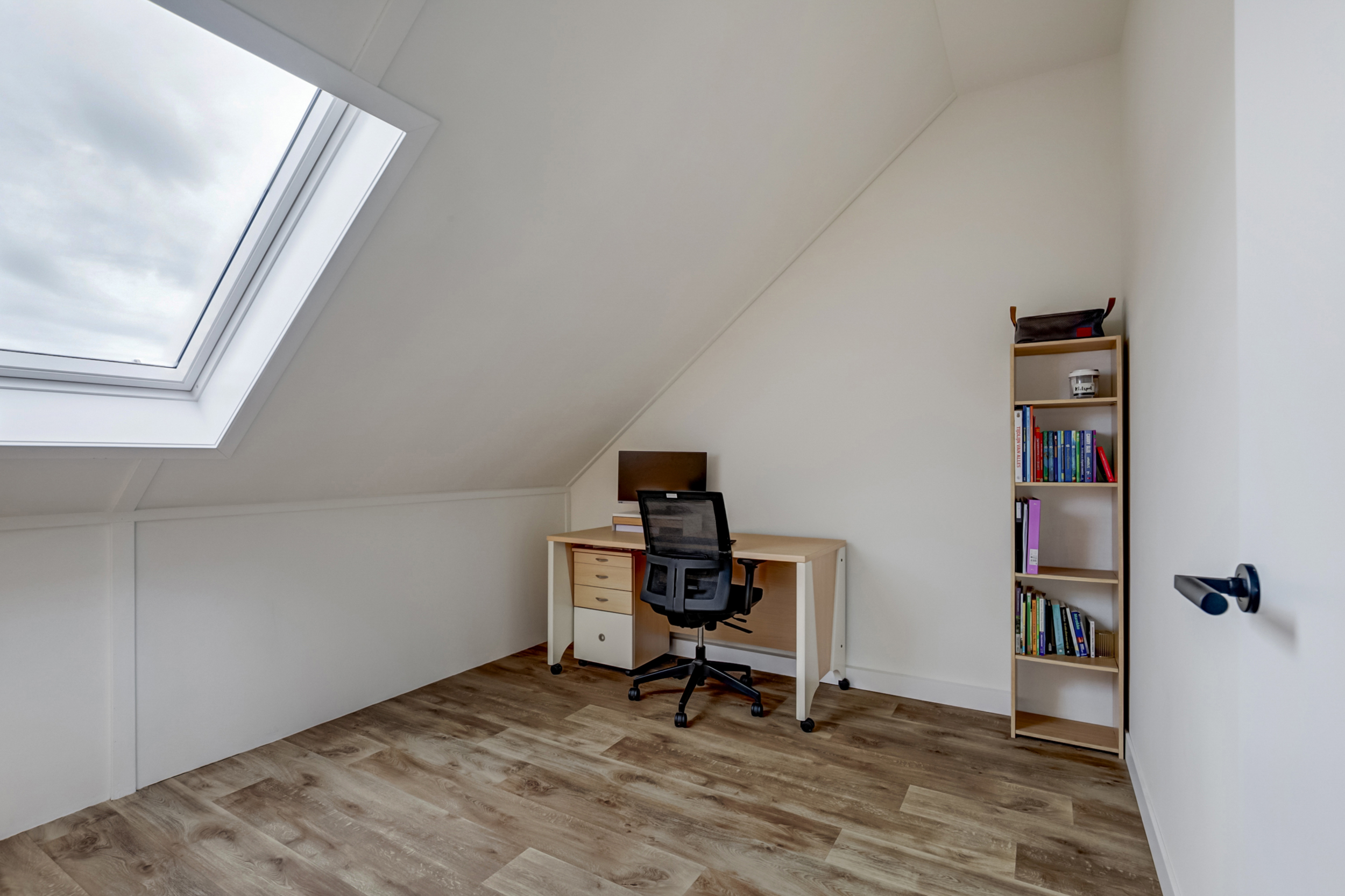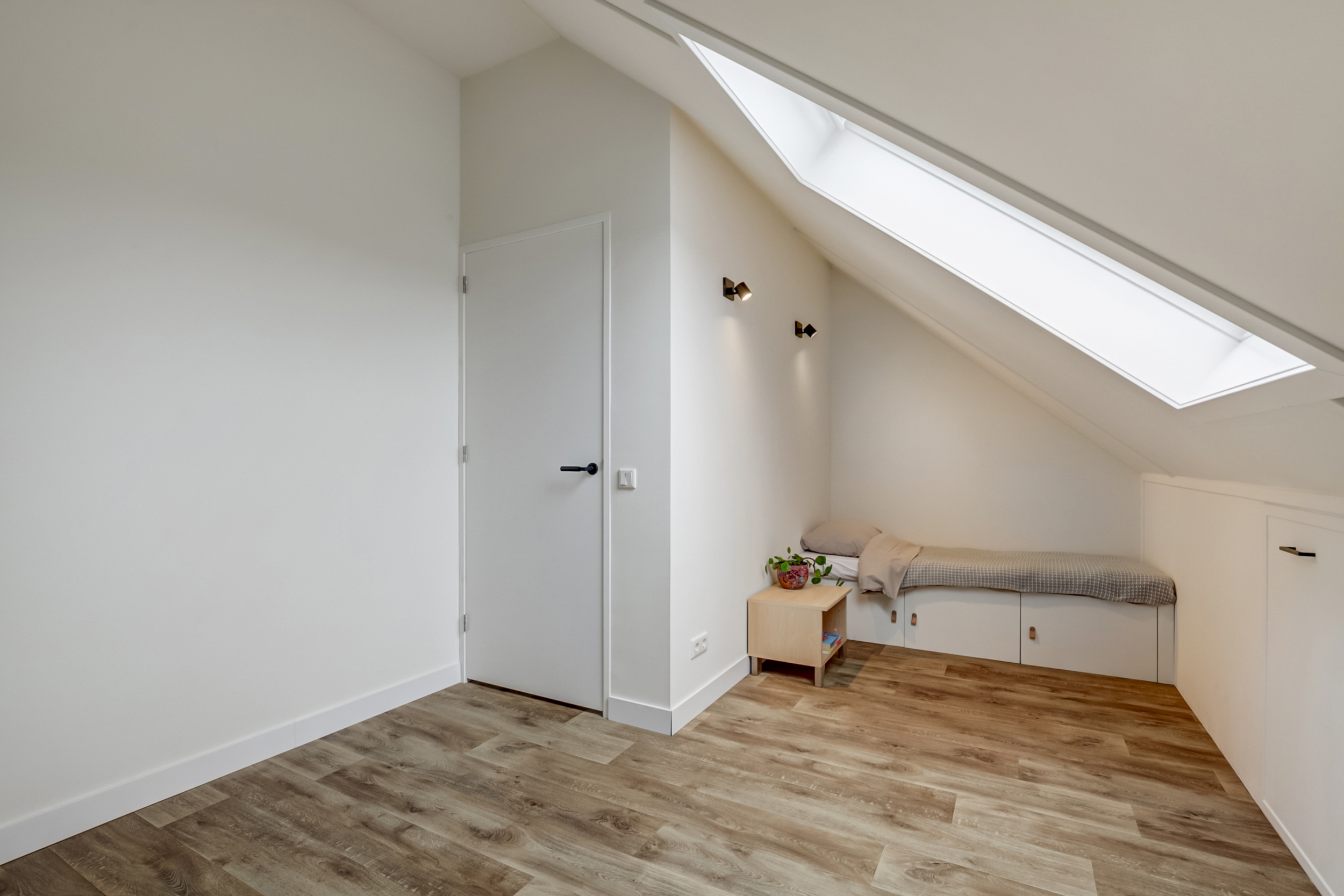 De vaste trap leidt naar de tweede verdieping, waar je een ruime vierde slaapkamer aantreft. Deze kamer is uitstekend te gebruiken als kinderkamer, kantoor, hobbyruimte of logeerkamer. Daarnaast is er een aparte technische ruimte met de opstelplaats voor de wasmachine, droger en de warmtepomp. Achter de knieschotten op deze verdieping is extra bergruimte gecreëerd, ideaal voor koffers, seizoensspullen of speelgoed. Deze verdieping biedt volop mogelijkheden om naar wens in te delen.