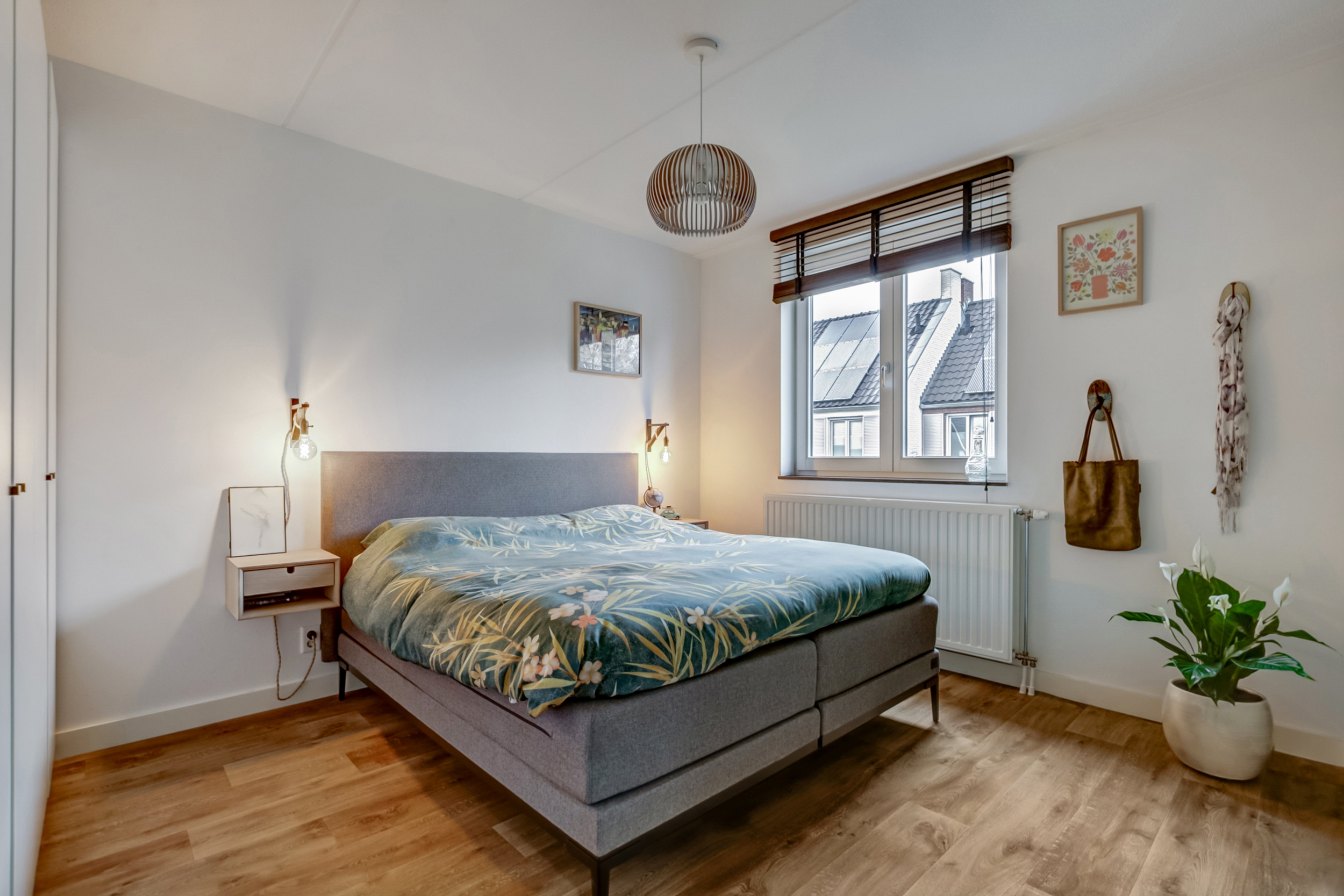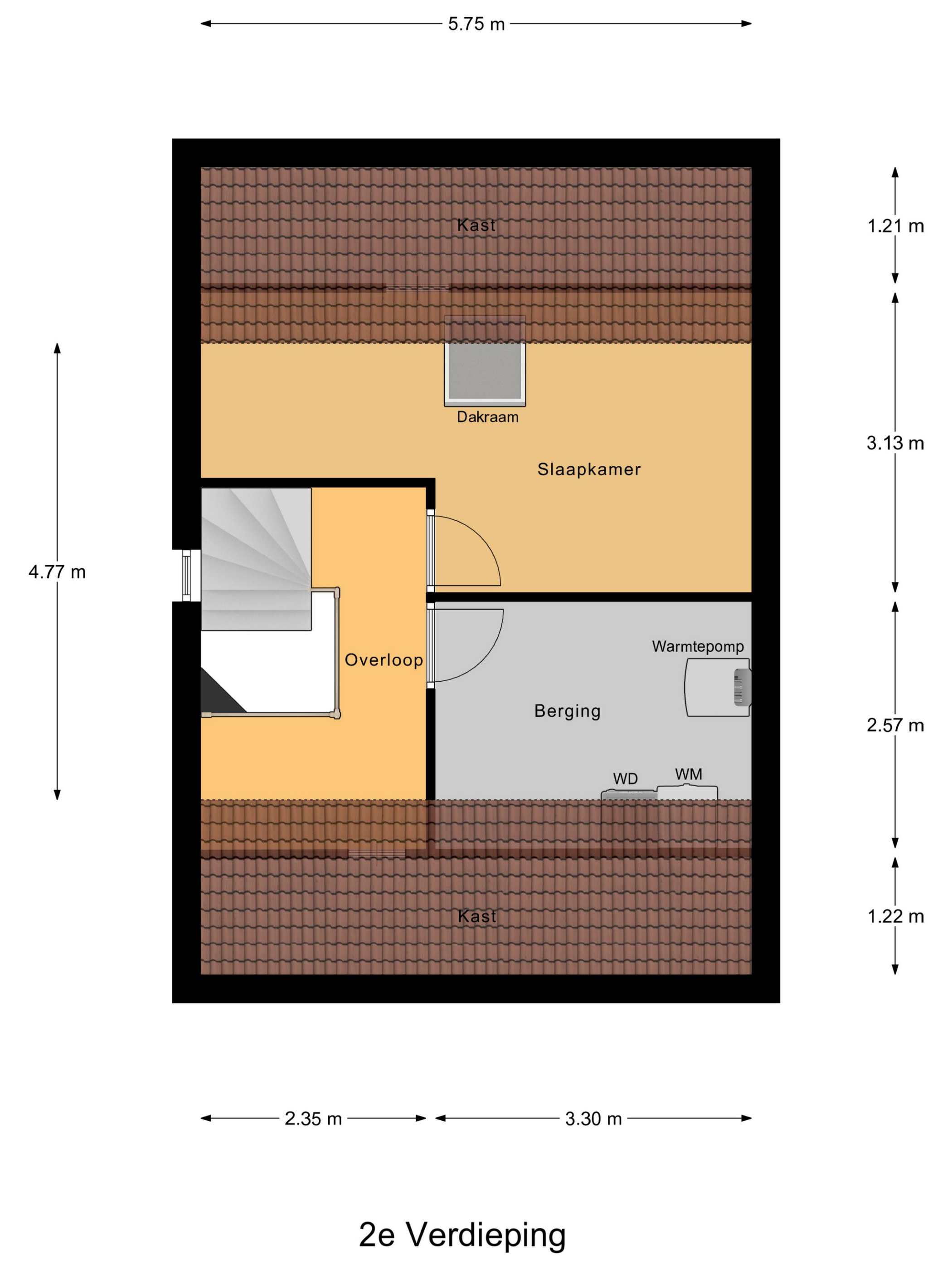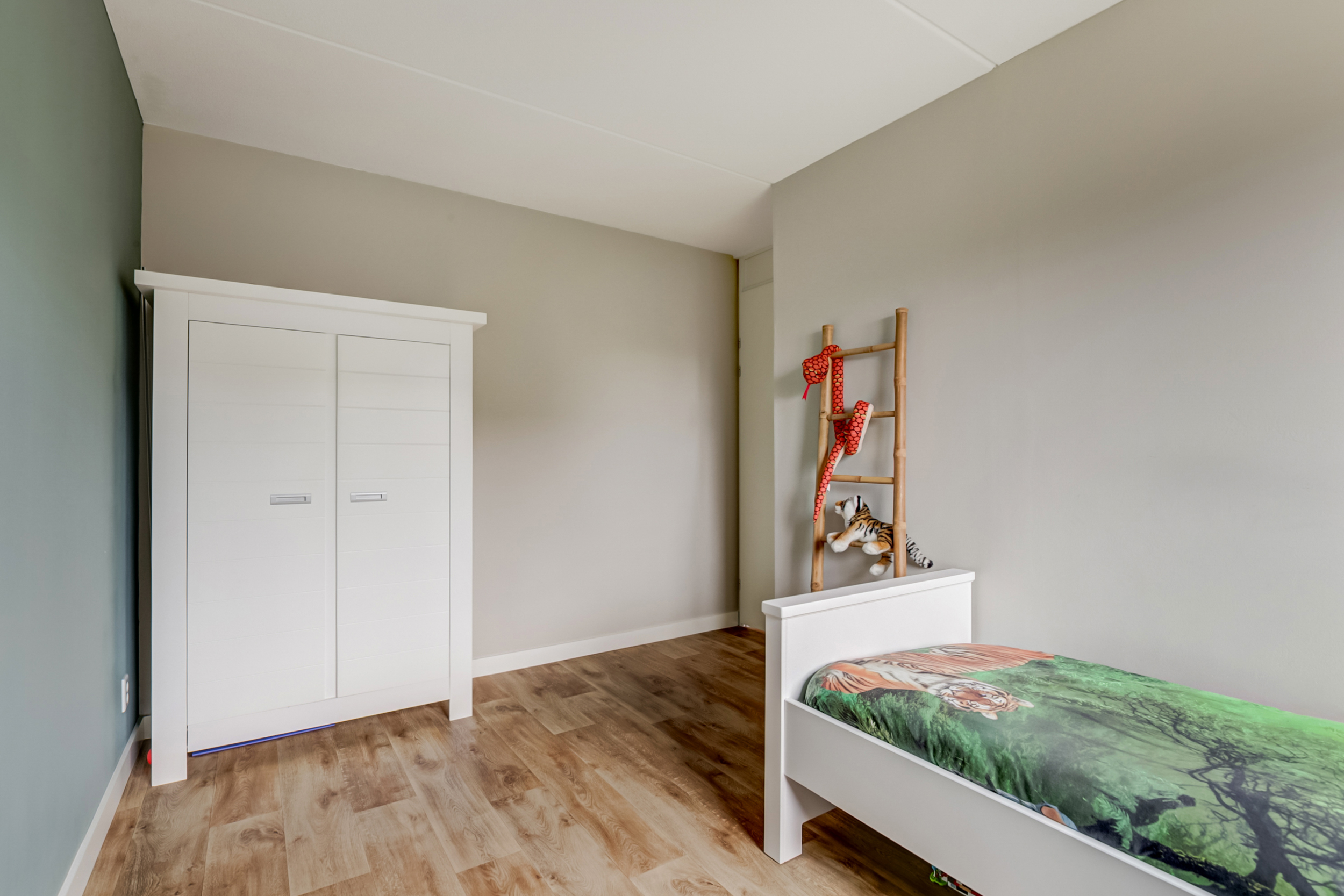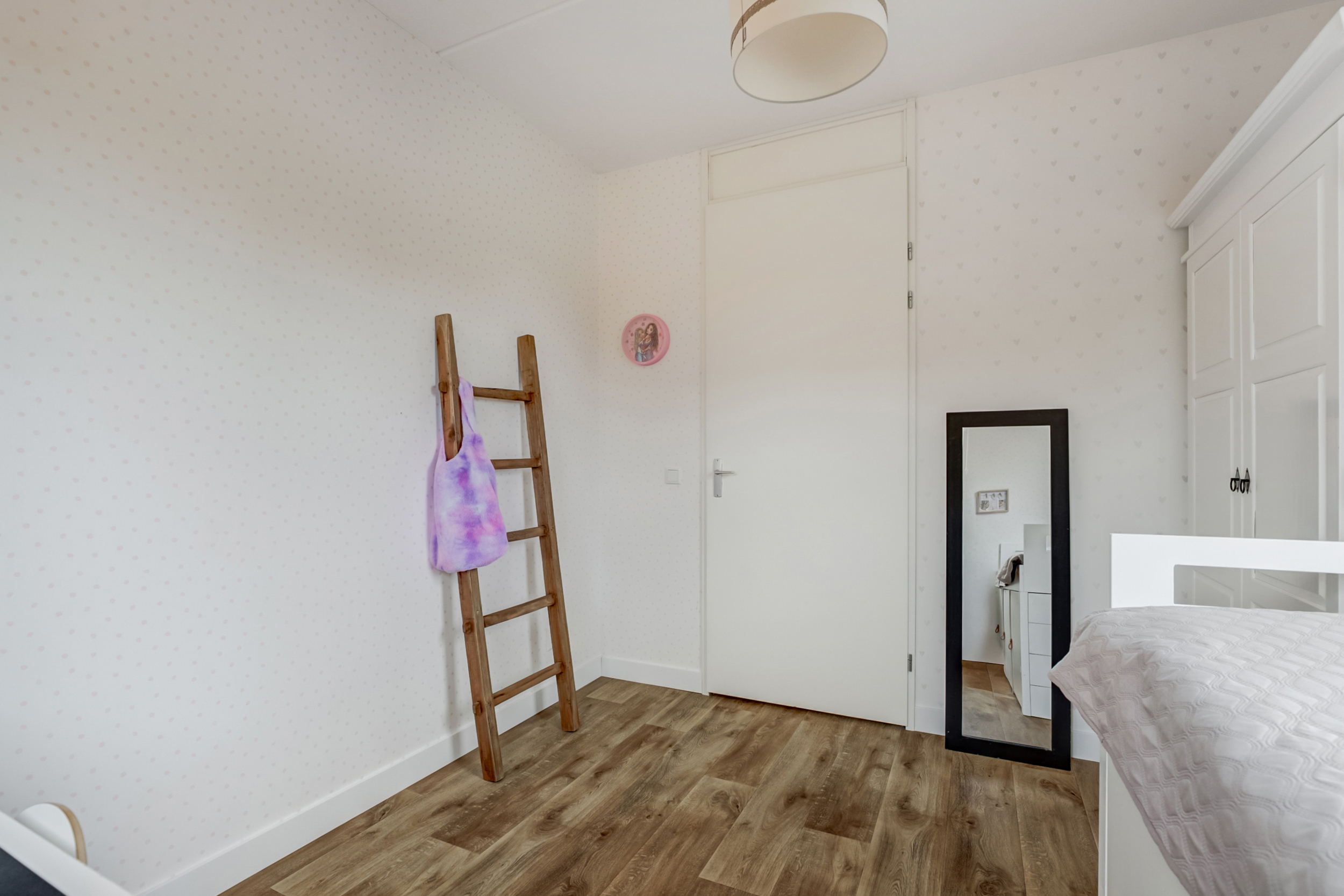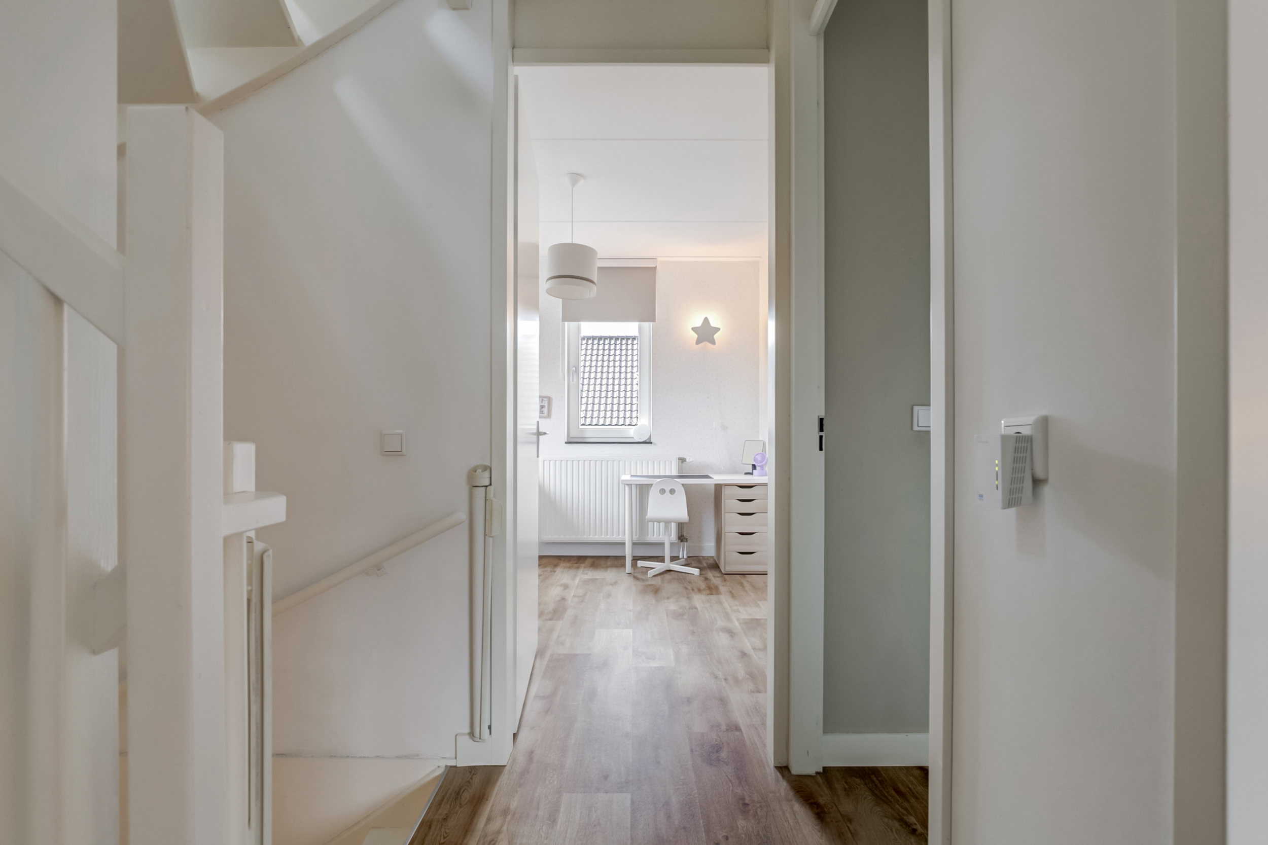 De vaste trap leidt naar de tweede verdieping, waar je een ruime vierde slaapkamer aantreft. Deze kamer is uitstekend te gebruiken als kinderkamer, kantoor, hobbyruimte of logeerkamer. Daarnaast is er een aparte technische ruimte met de opstelplaats voor de wasmachine, droger en de warmtepomp. Achter de knieschotten op deze verdieping is extra bergruimte gecreëerd, ideaal voor koffers, seizoensspullen of speelgoed. Deze verdieping biedt volop mogelijkheden om naar wens in te delen.