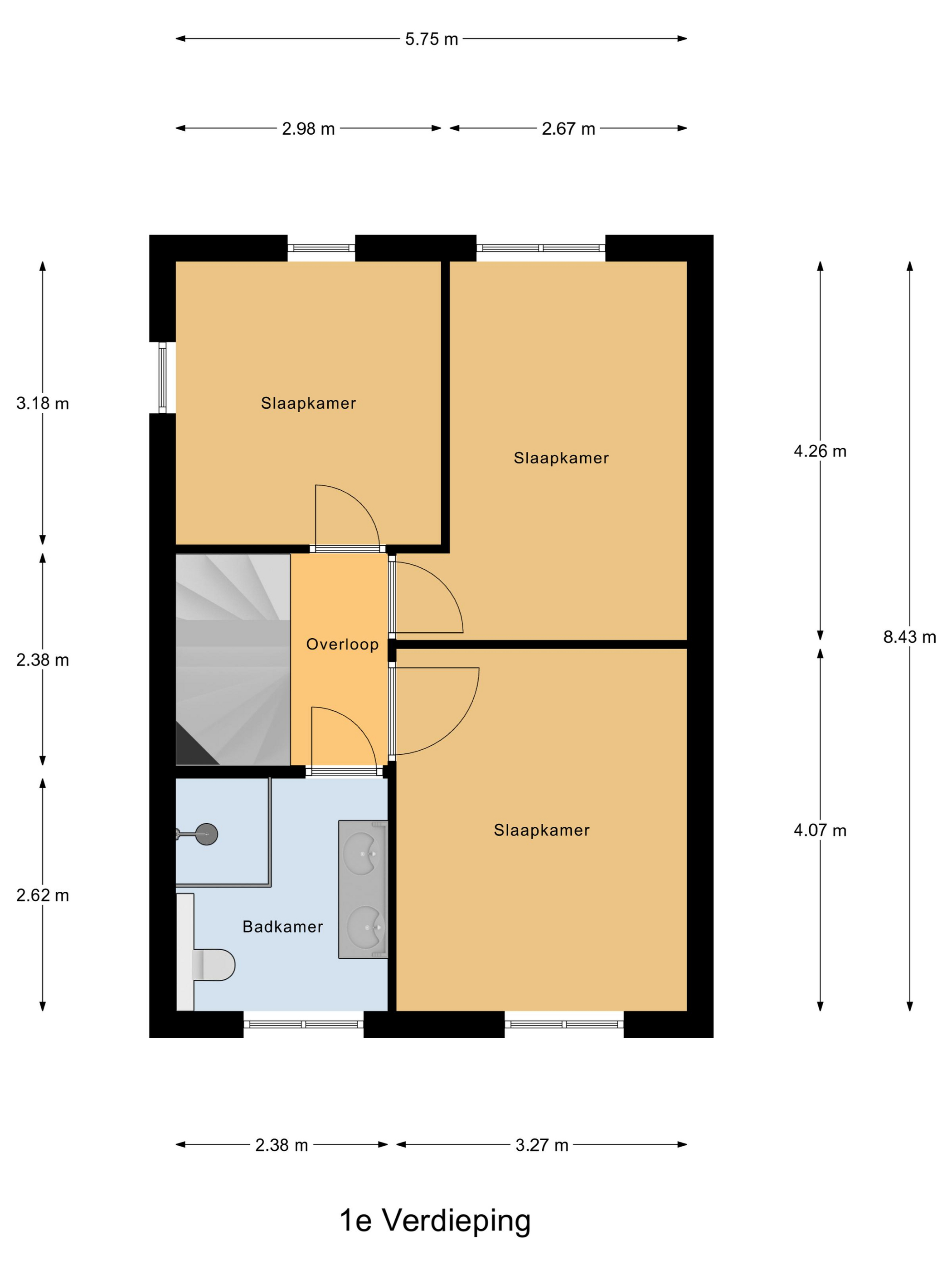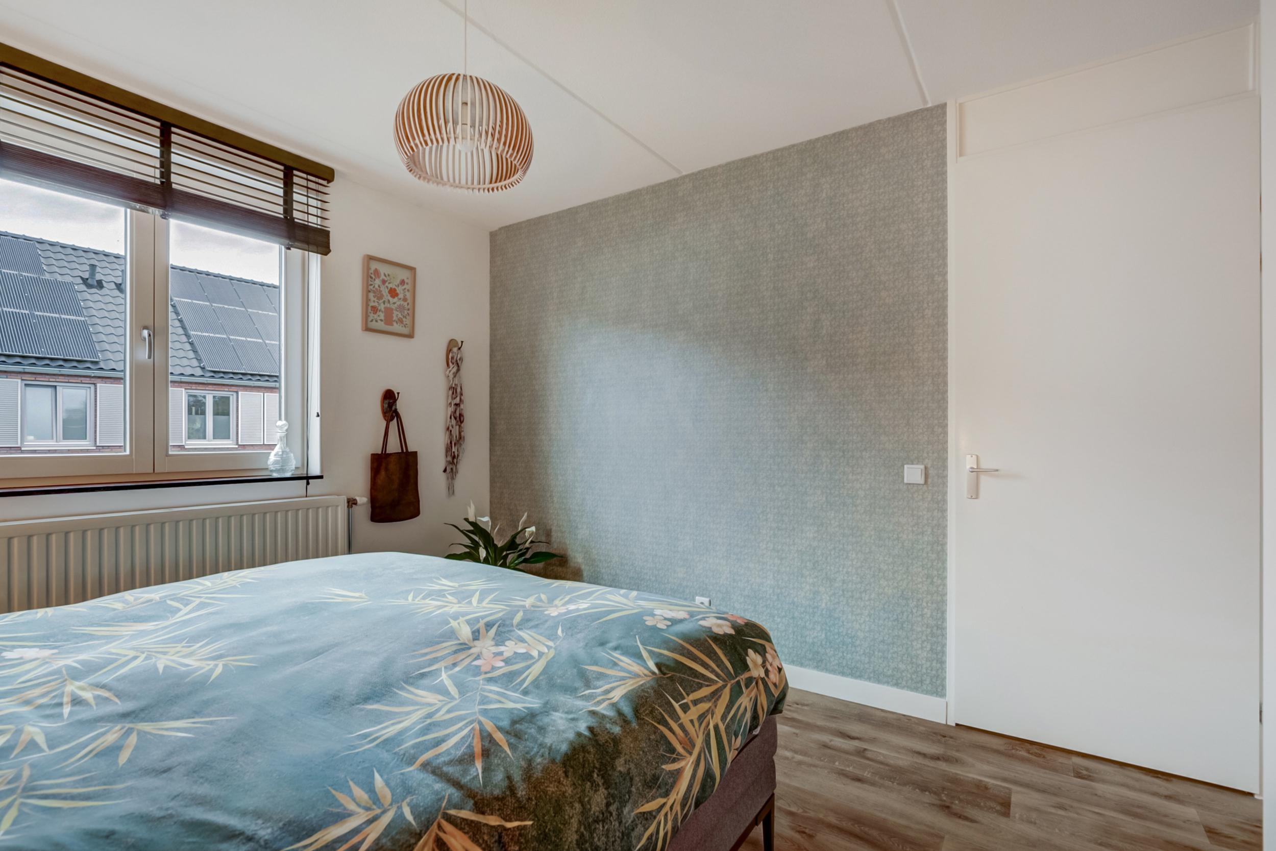 Via de trap in de woonkamer kom je op de overloop die toegang biedt tot drie ruime slaapkamers en de badkamer. De hoofdslaapkamer is groot genoeg voor een tweepersoonsbed en een royale kledingkast. De andere twee kamers zijn perfect als kinderkamer, werkruimte of logeerkamer en bieden voldoende plek voor een bureau en kast en nog mogelijk een tweepersoonsbed. De moderne badkamer is compleet uitgerust met een inloopdouche met sunshower, een dubbele wastafel met meubel en een toilet.