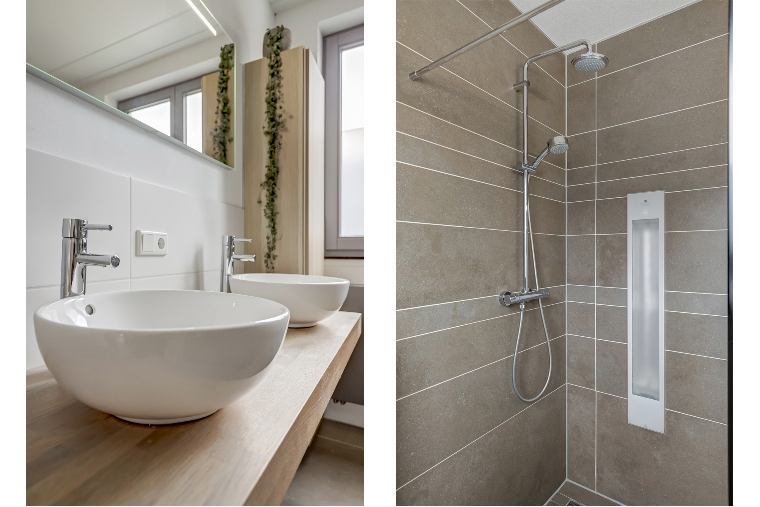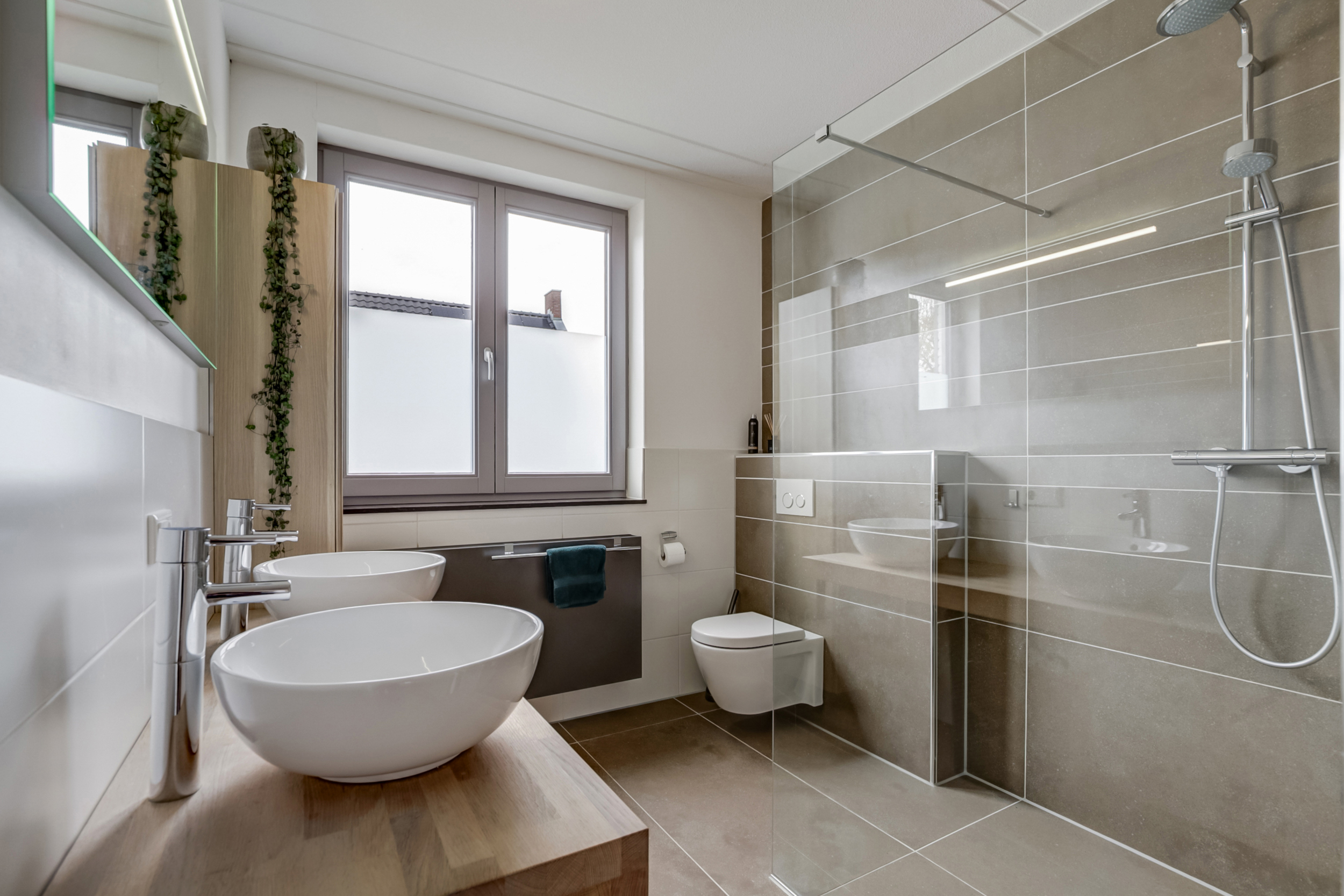 - Toilet, dubbele wastafel, wastafelmeubel en inloopdouche