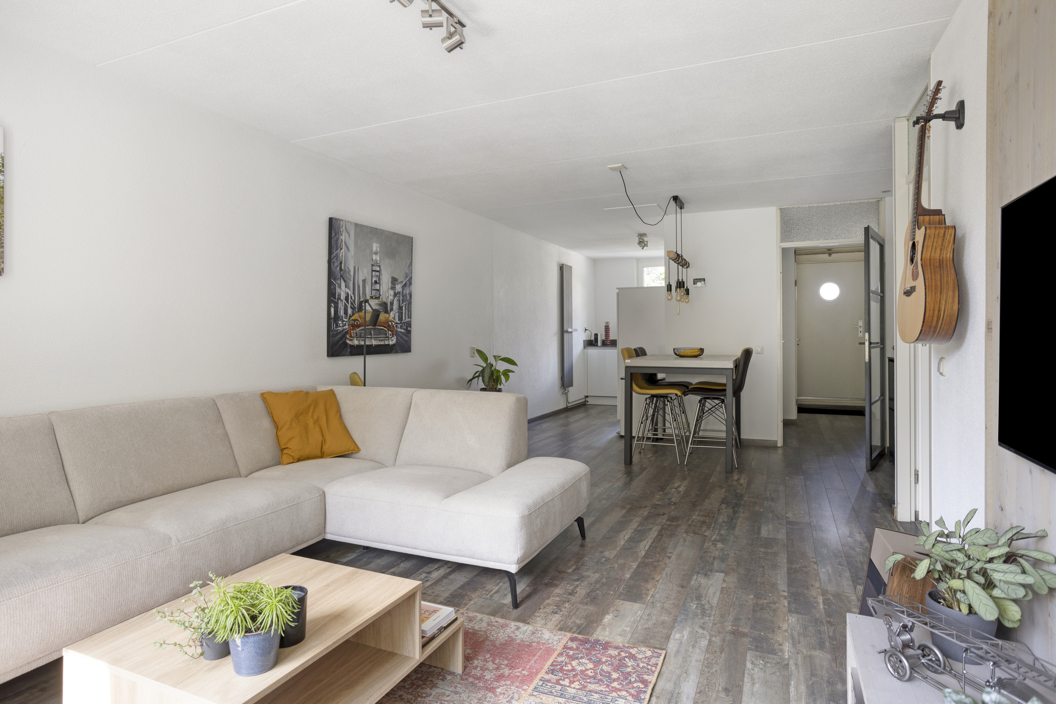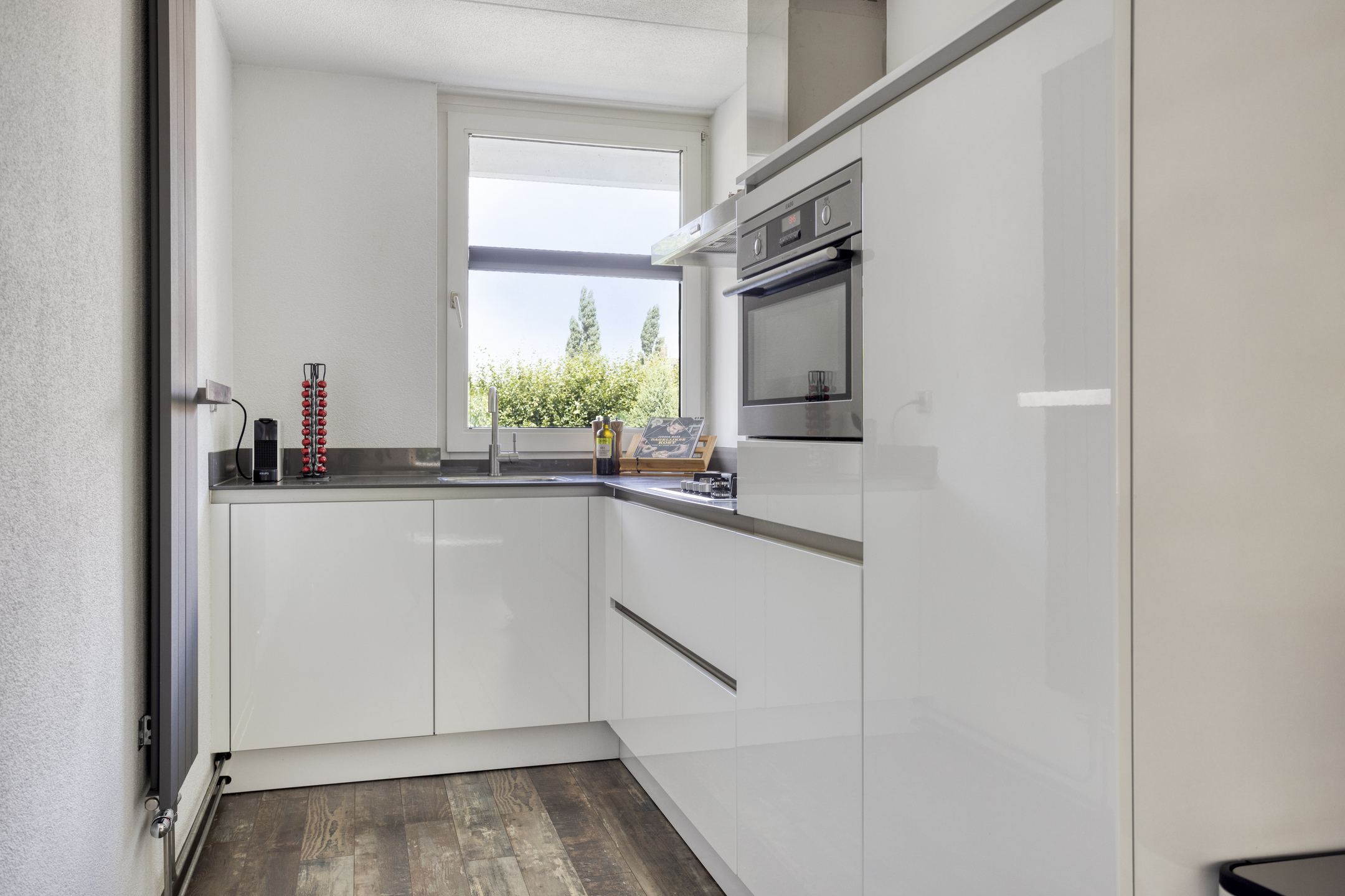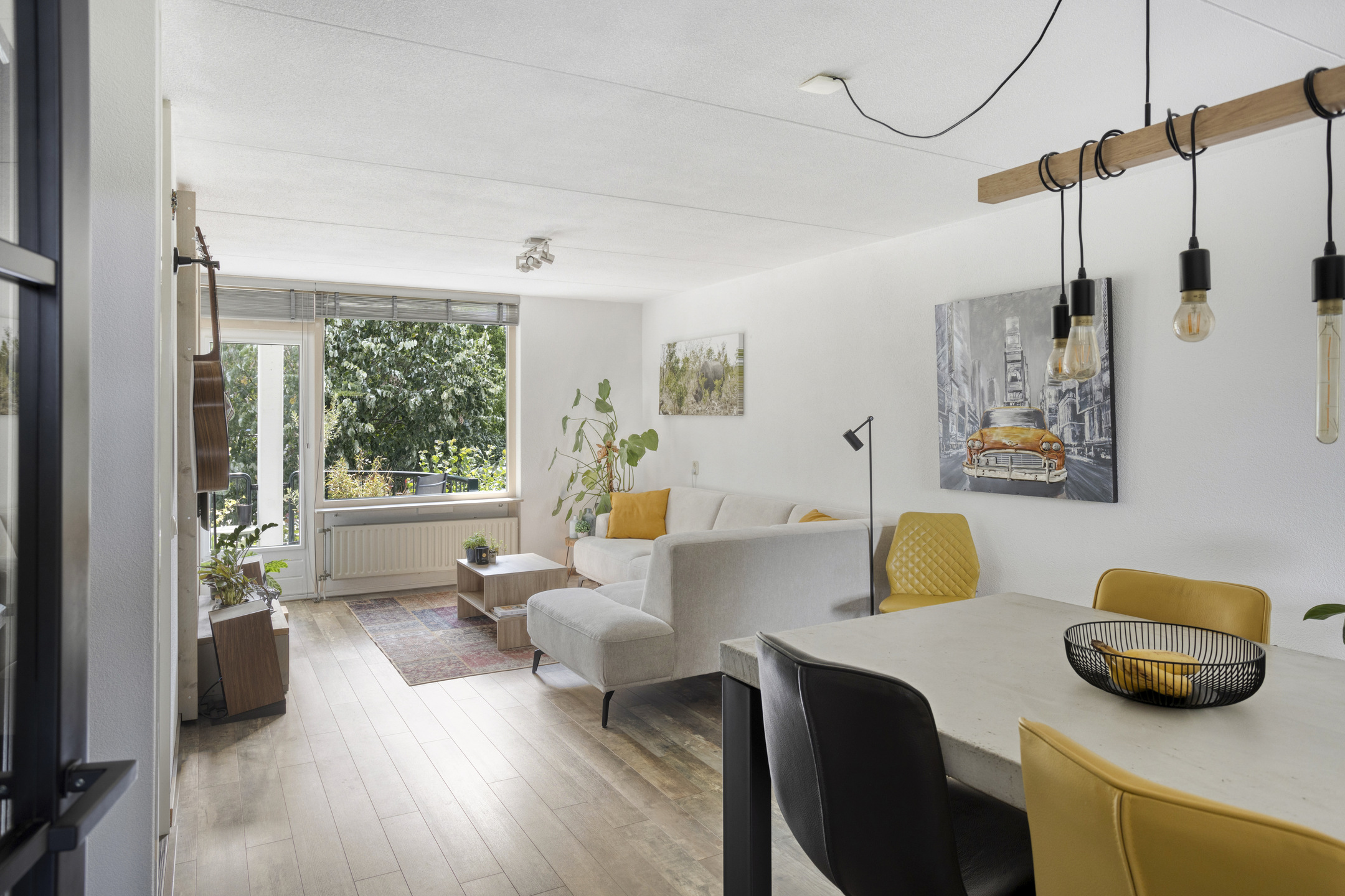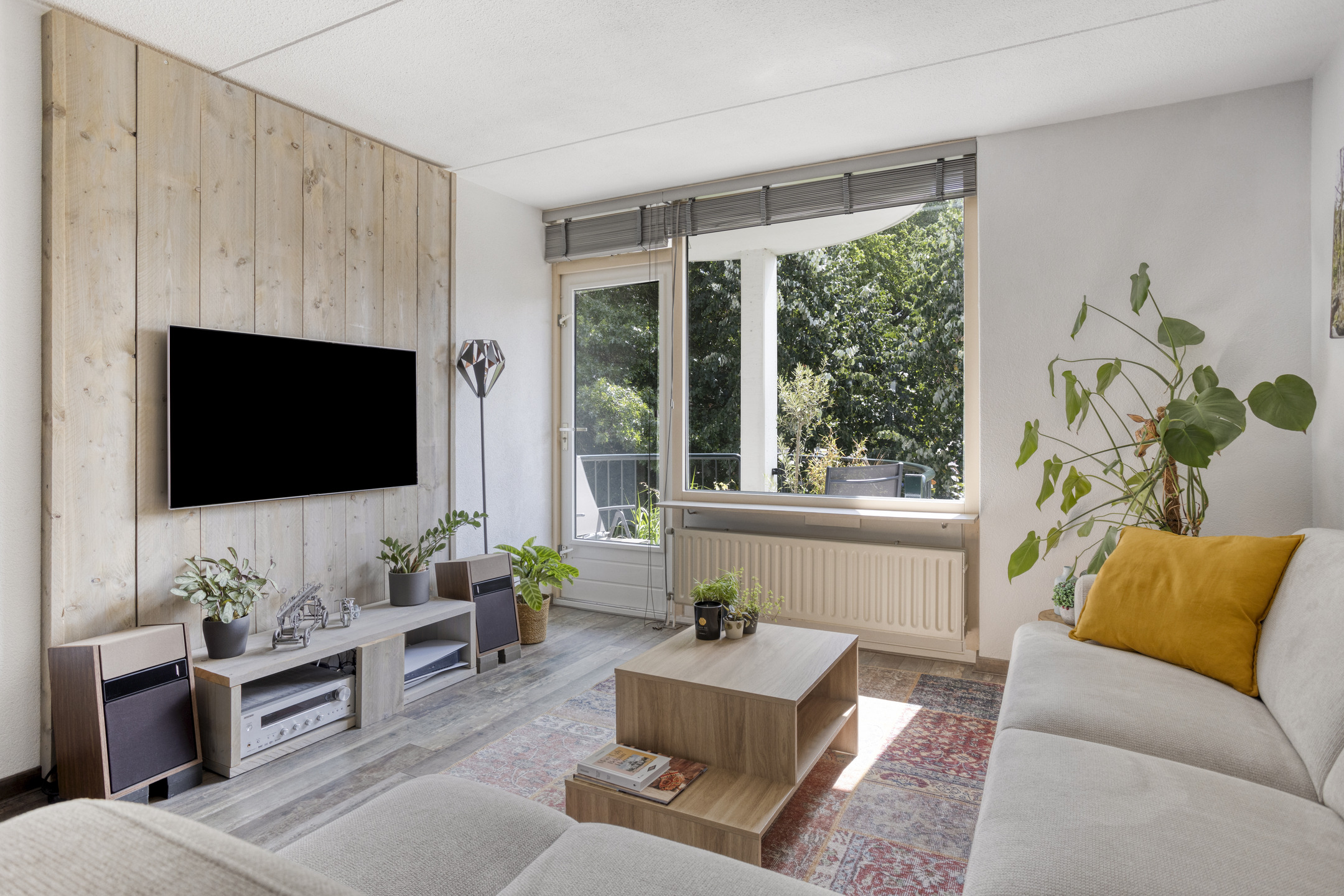 Vanuit de hal heb je toegang tot het toilet met zwevend closet, de meterkast, de 2e slaapkamer en de fijne woonkamer. De woonkamer is, net al de rest van het appartement, keurig afgewerkt en goed onderhouden. De grote raampartij aan de balkonzijde kenmerkt de ruimte. De vloer is voorzien van een nette laminaatvloer en de wanden zijn afgewerkt met spachtelputz.