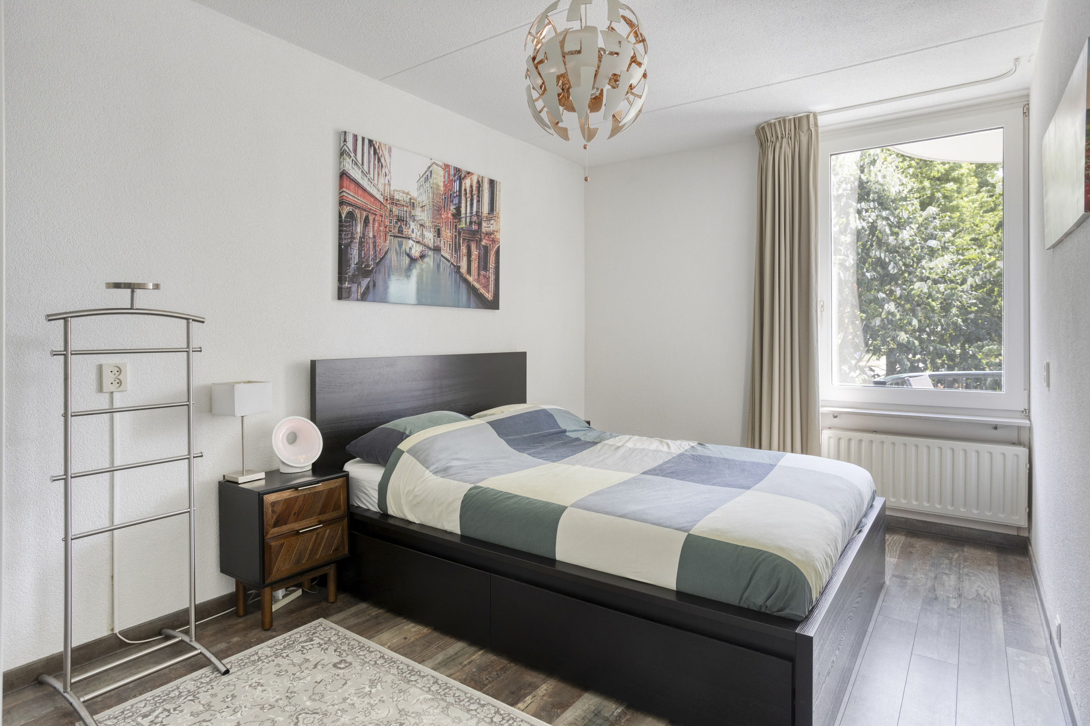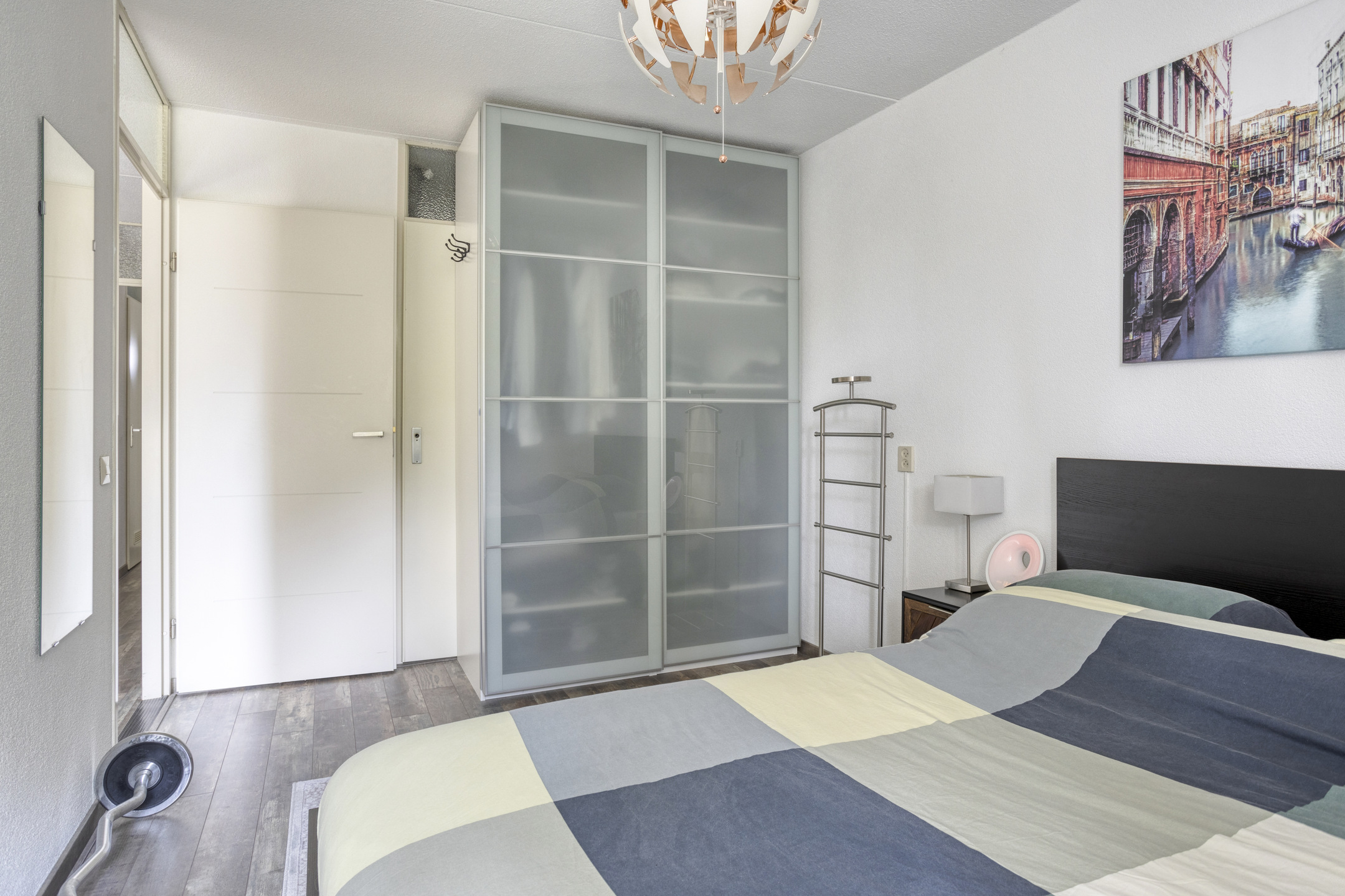 Vanuit de woonkamer bereik je de hoofdslaapkamer, waar voldoende ruimte is voor een tweepersoonsbed en een kledingkast. Vanuit deze kamer is toegang tot de inpandige berging, maar die doorloop is momenteel niet in gebruik.