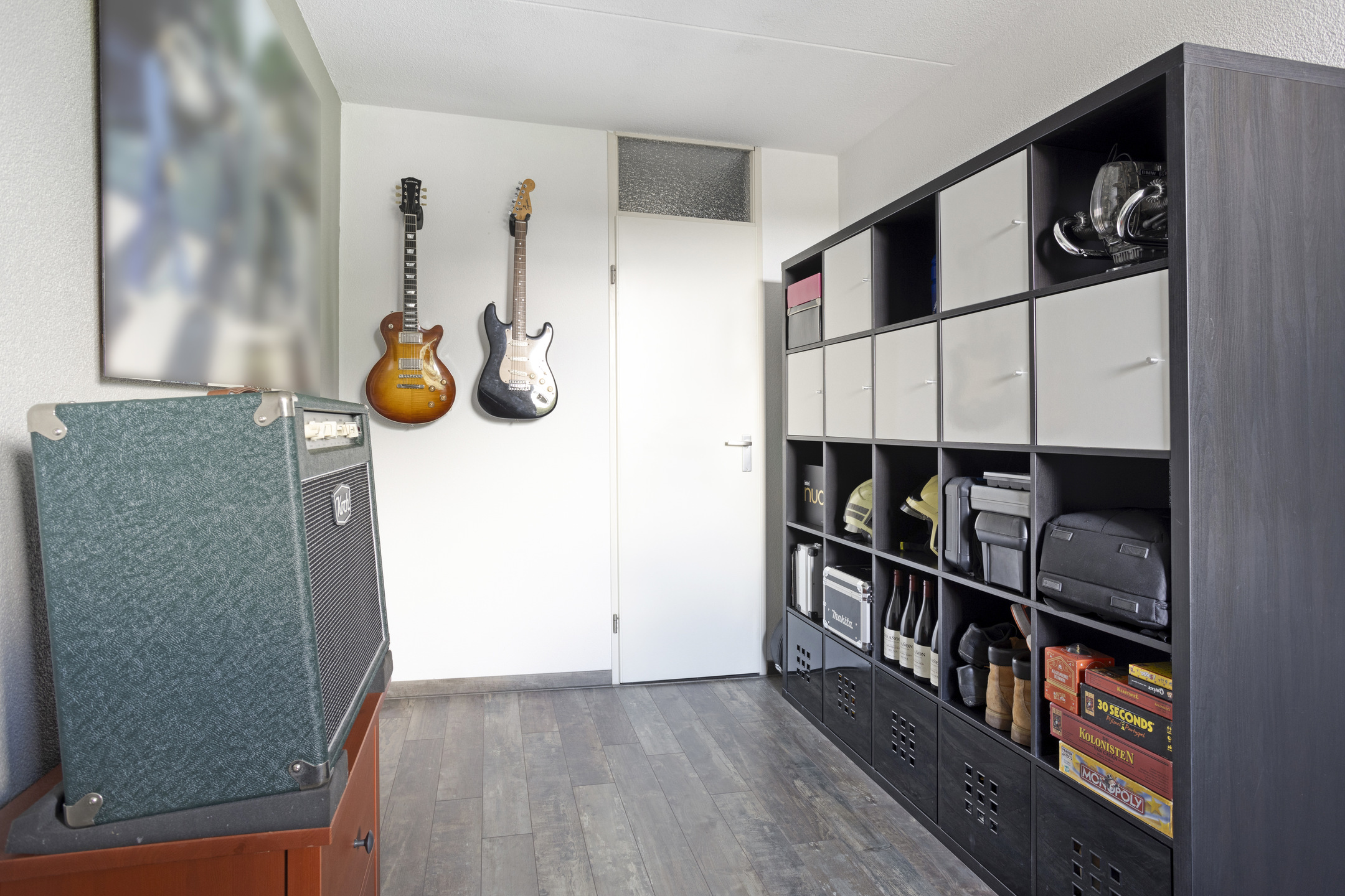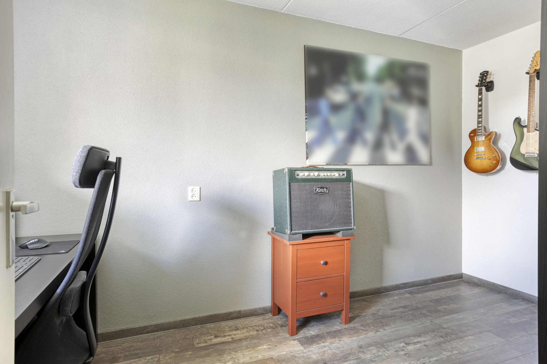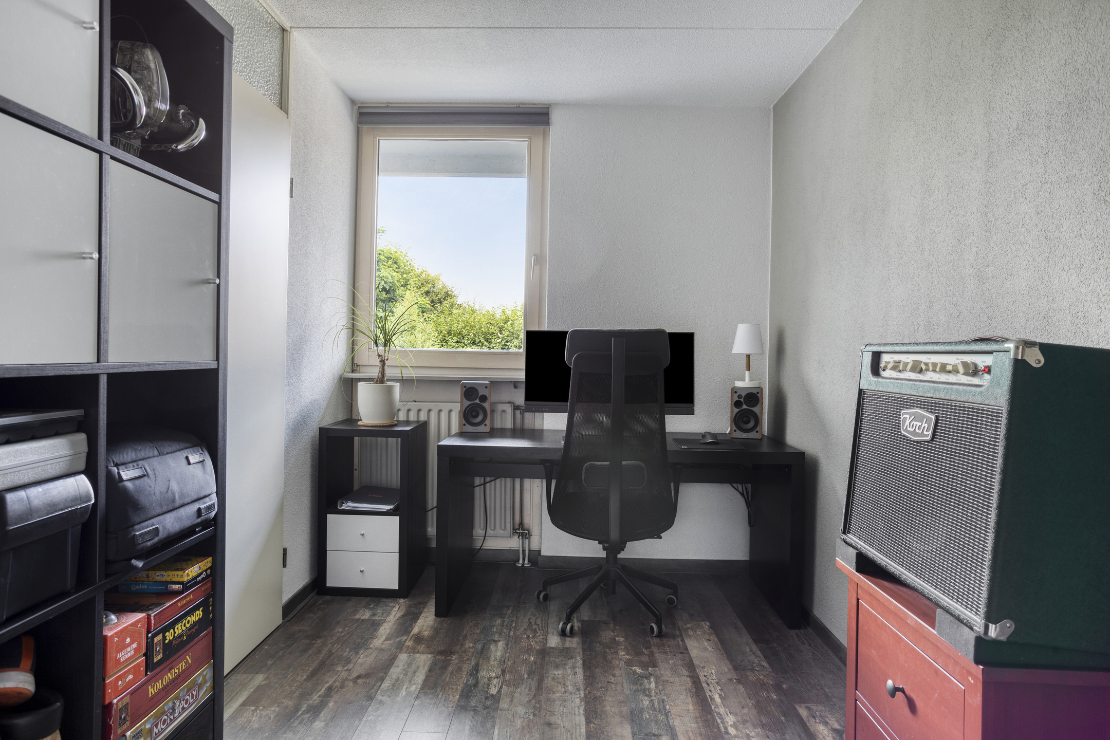 Via de entreehal kom je in de tweede slaapkamer, die momenteel dienstdoet als kantoorruimte. Deze kamer is naar eigen wens in te delen, bijvoorbeeld als kinderkamer of inloopkast. Vanuit de kamer is tevens toegang tot de inpandige berging, waar de cv-ketel (bouwjaar 2017) en de wasmachineaansluiting zijn te vinden.