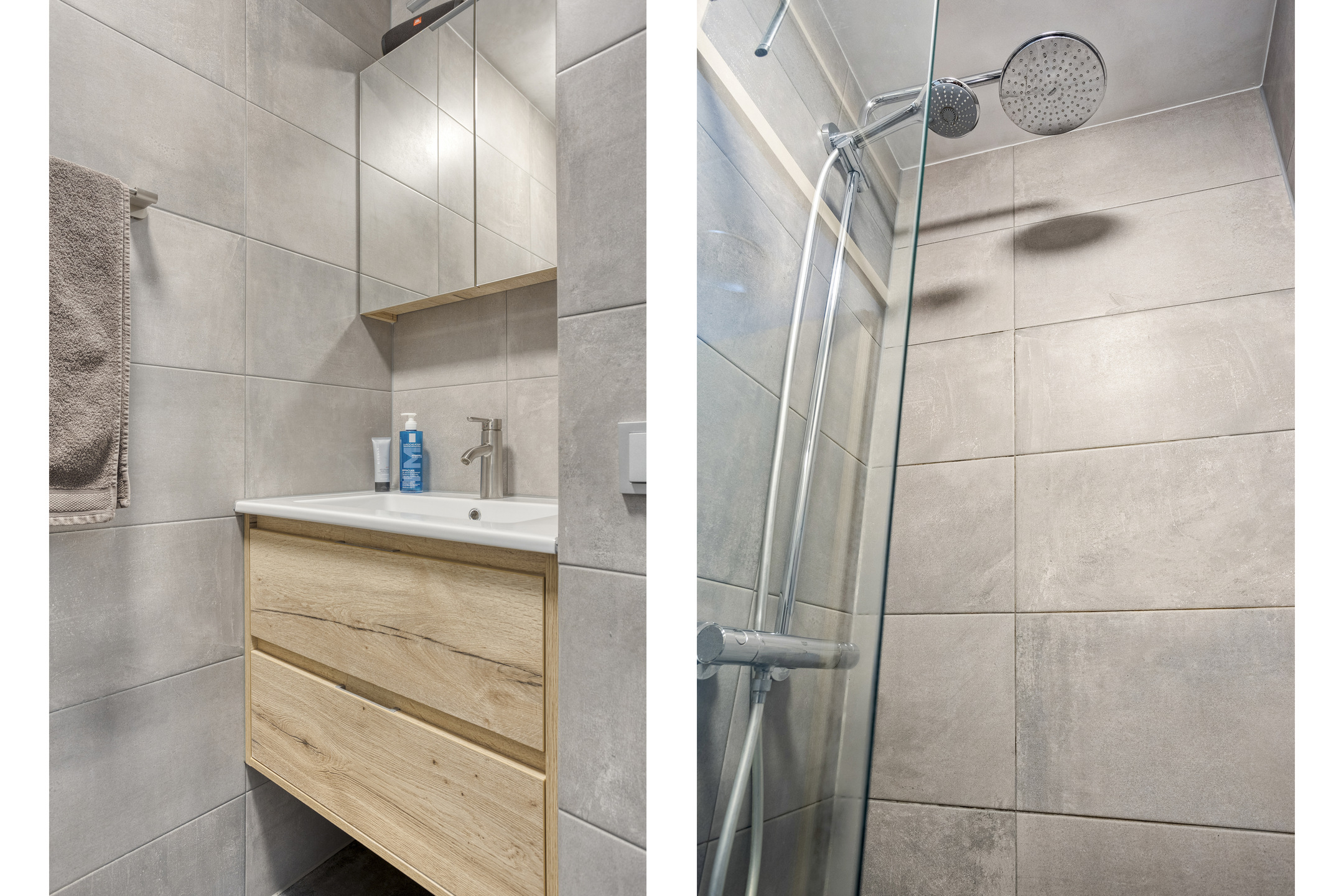 De badkamer is in 2020 gemoderniseerd en is ingedeeld met een inloopdouche voorzien van regendouche en een modern wastafelmeubel.